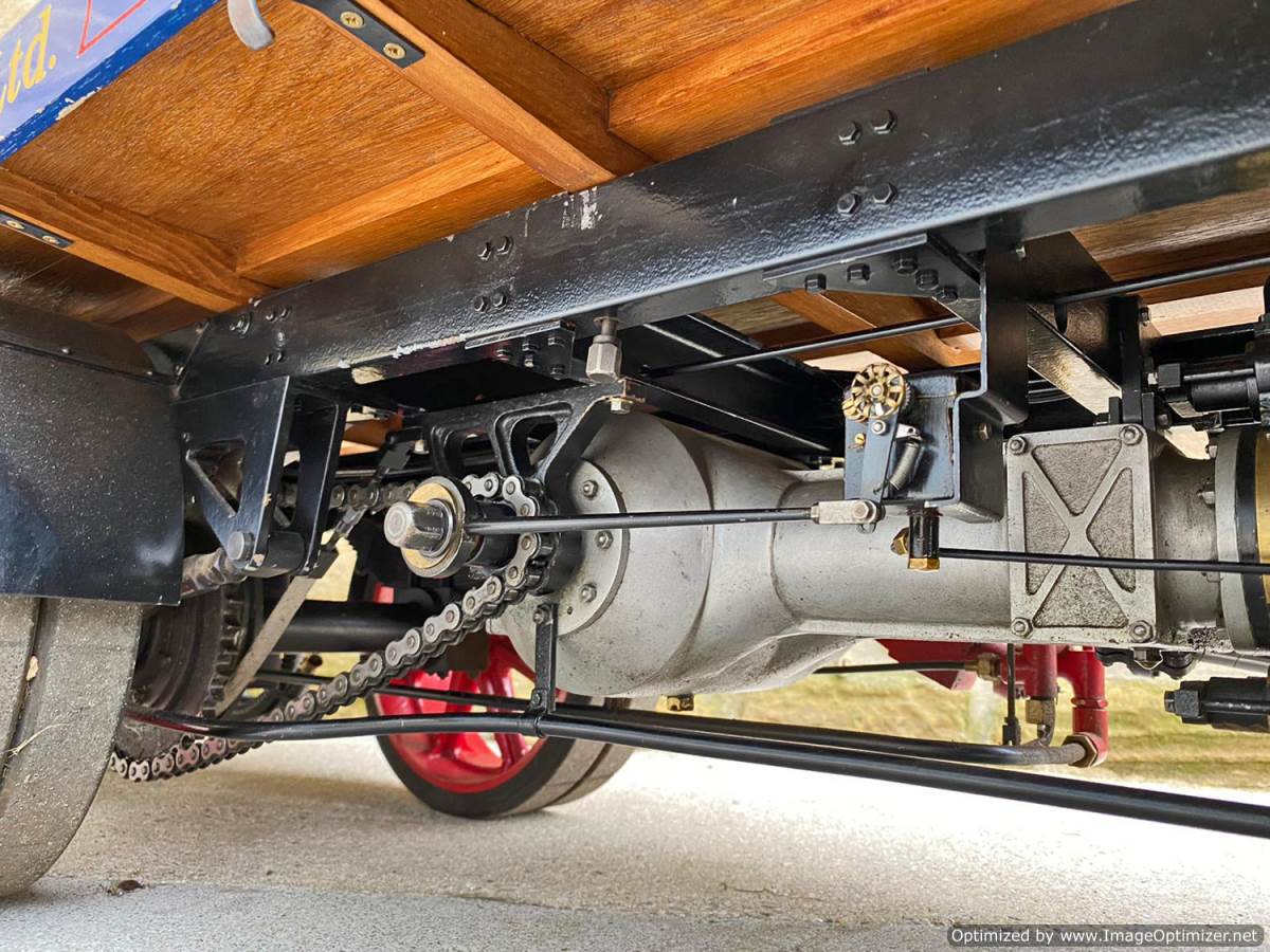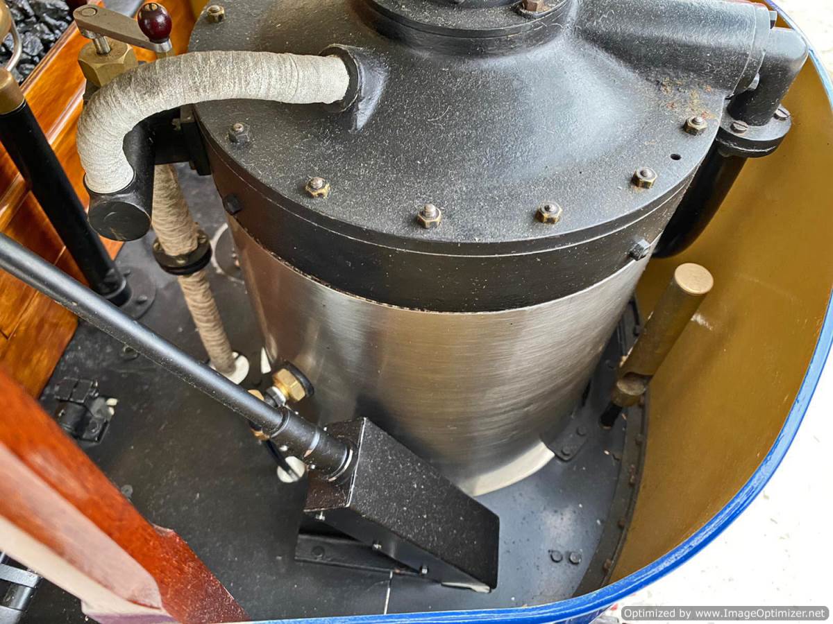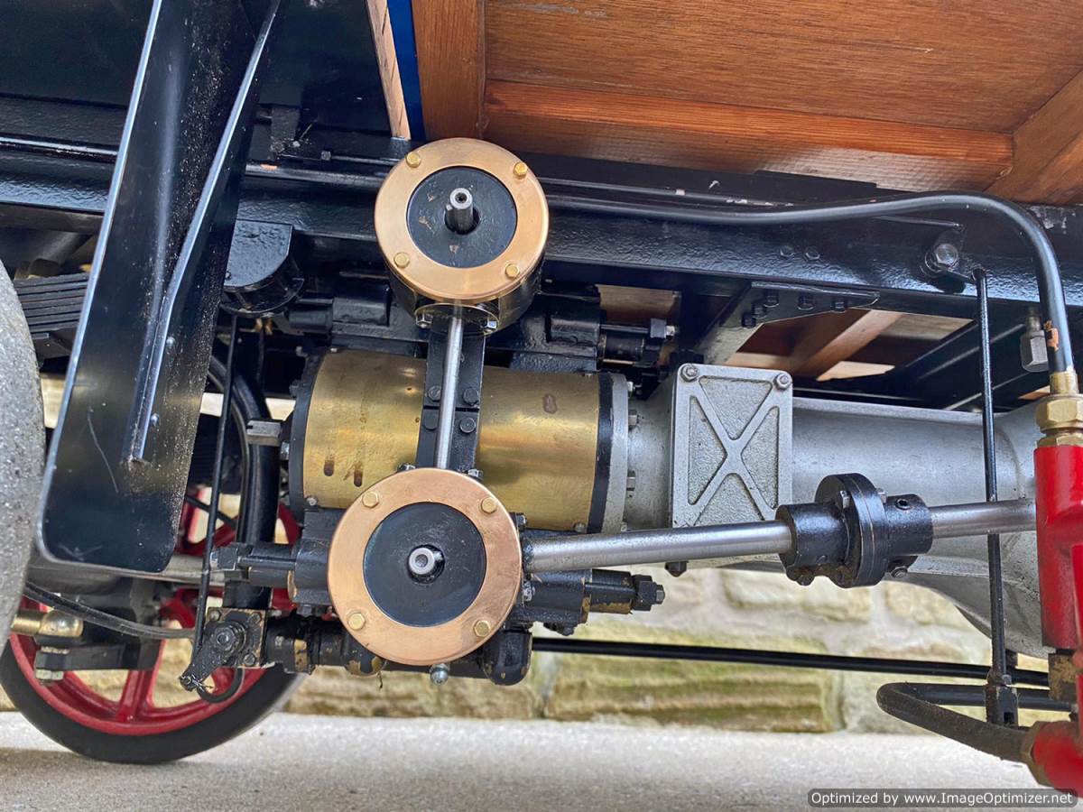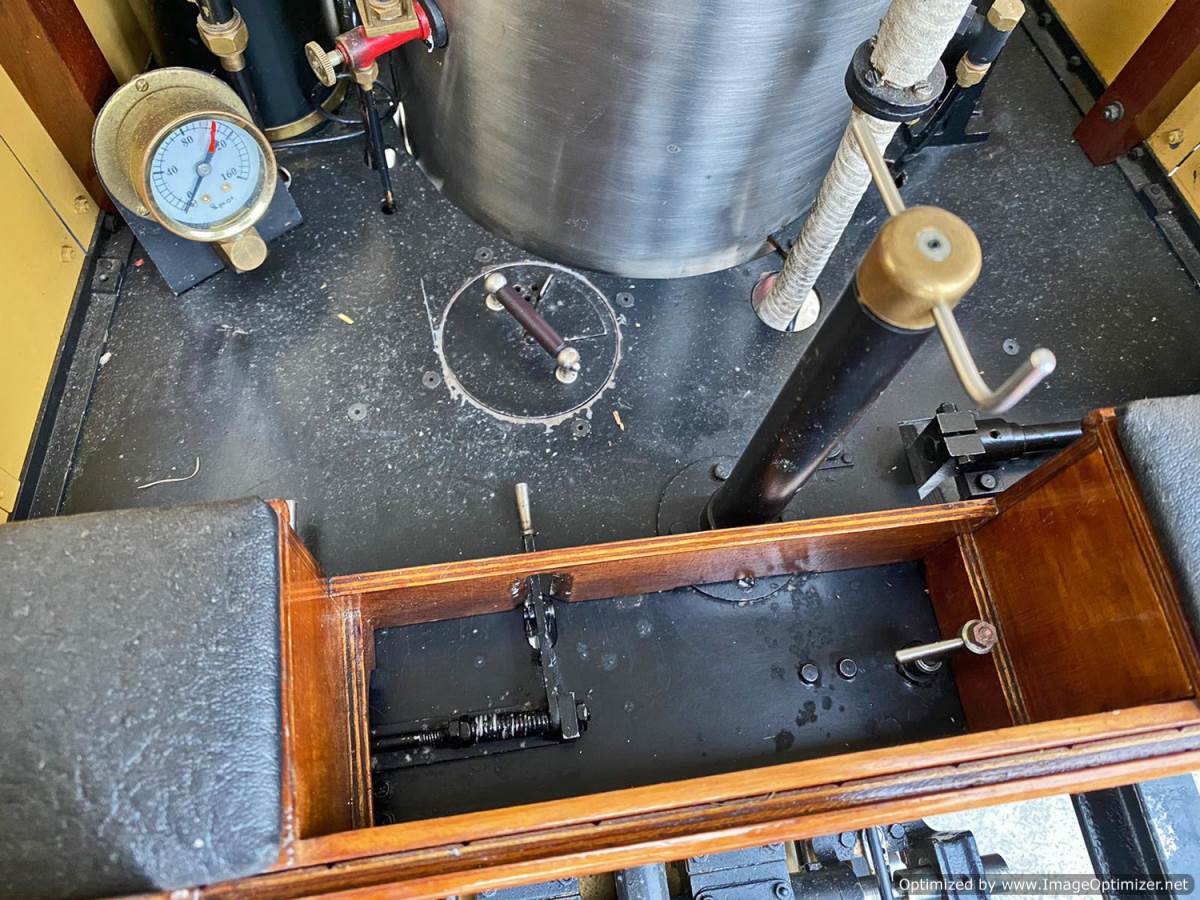 Water is fed by an injector tucked away under the cab floor, as well as a crank pump and cab mounted bypass valve. The pump it's self passes through an anti-surge plenum chamber and then through a pre-heater in the cab to raise the temperature before it enters the boiler. There is a neat little locking pin located behind the rear axle that enables the model to be clicked out of gear so that the engine (and water pump) can be run whilst stationary. Lubrication is mechanical and tucked neatly under the deck, and she's also fitted with a water lifter which, like the rest of the model works beautifully.