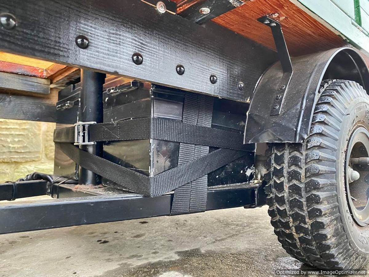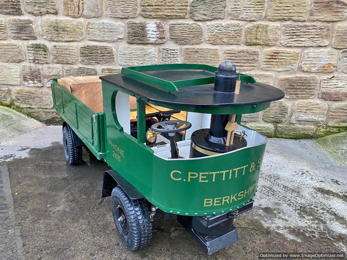 Here we have an unusual and very cool toy! A 3" scale fully electric 'Sentinel-esque' steam lorry. Essentially it's a mobility scooter in drag,.... and to that end there are a couple of batteries hidden underneath and a mobility scooter electric motor in the back driving the rear wheels. The front axle is ackerman steering actuated by a tiller rather than the steering wheel (which is a dummy), as is of course the boiler!