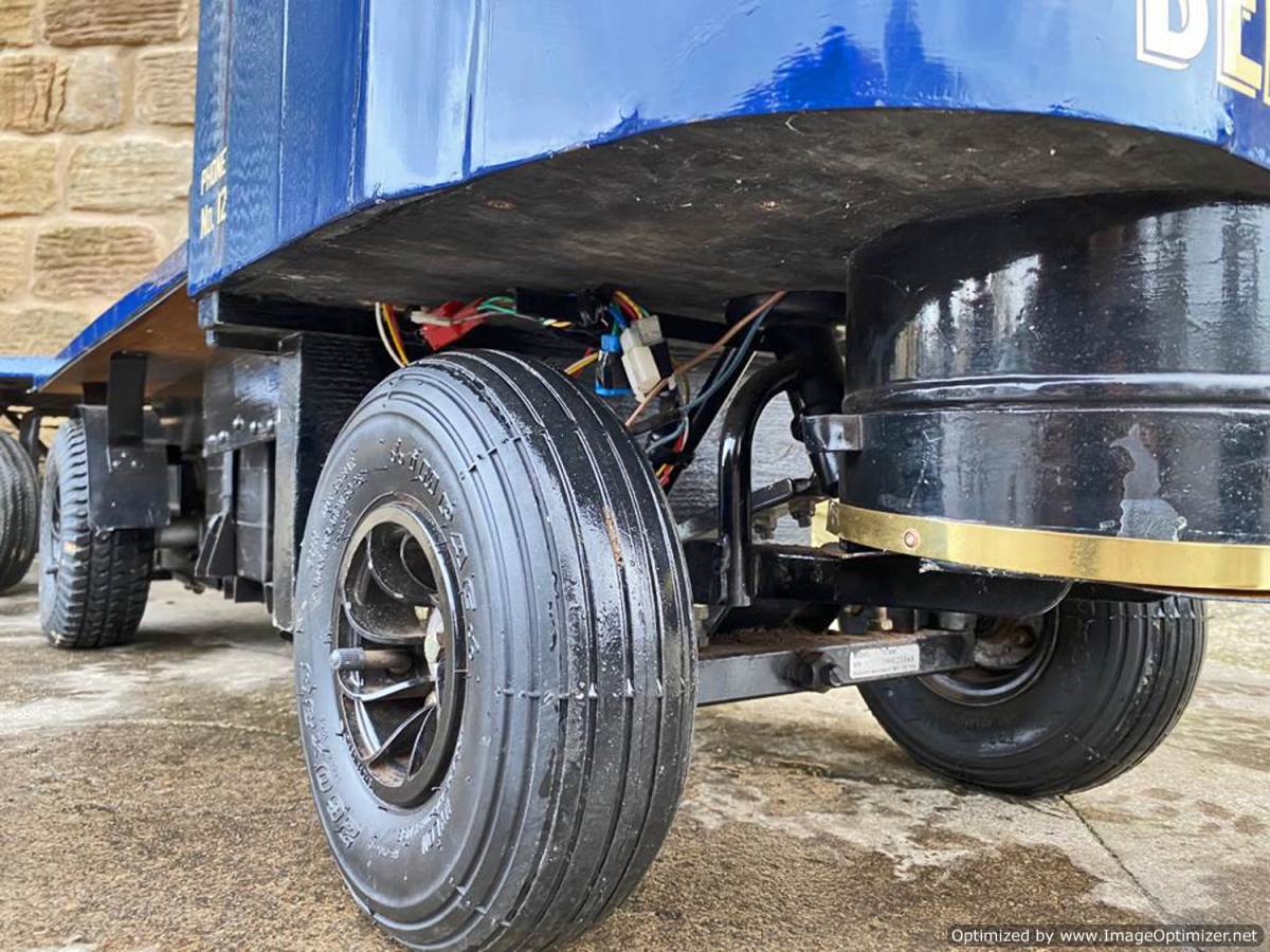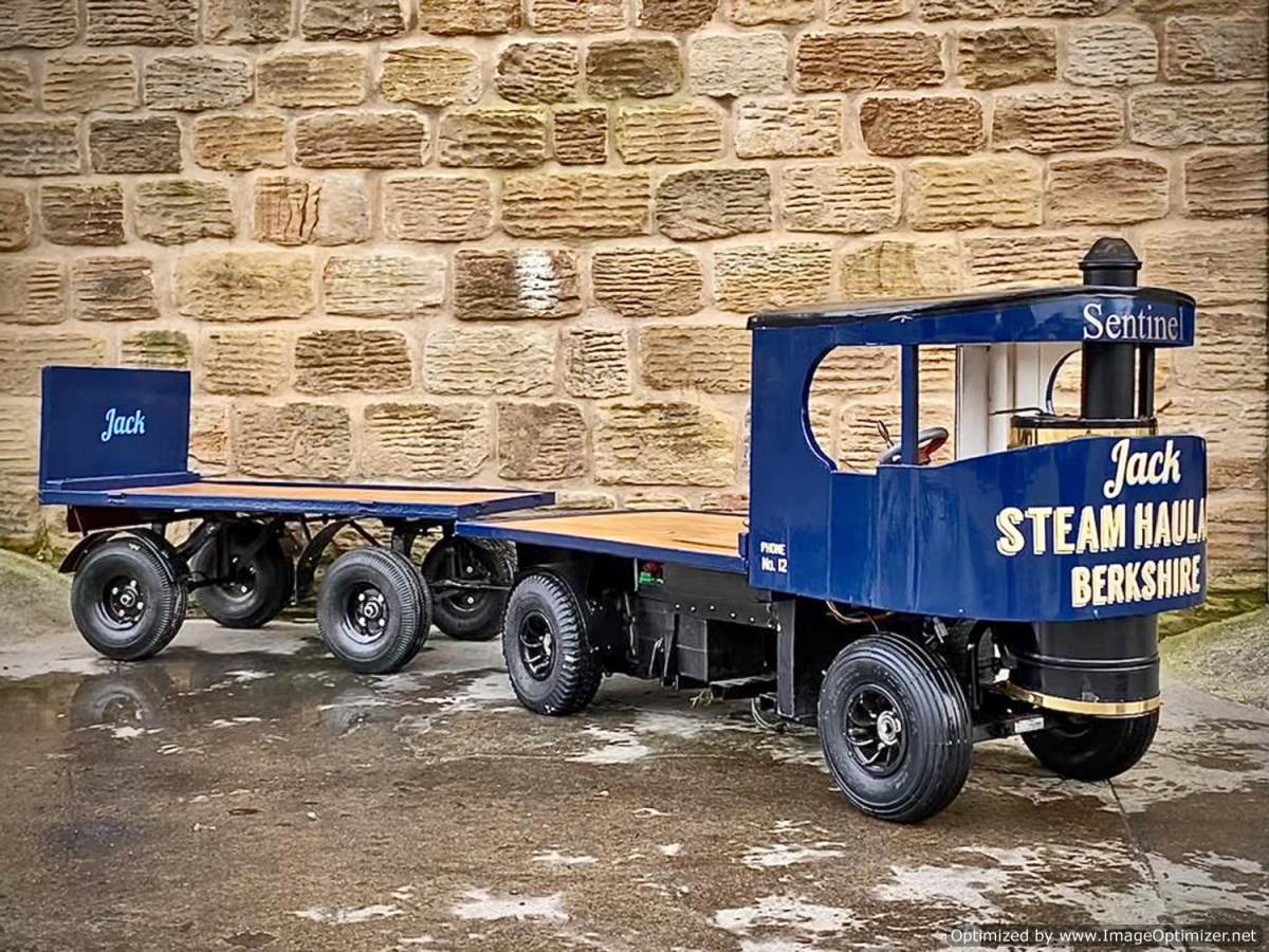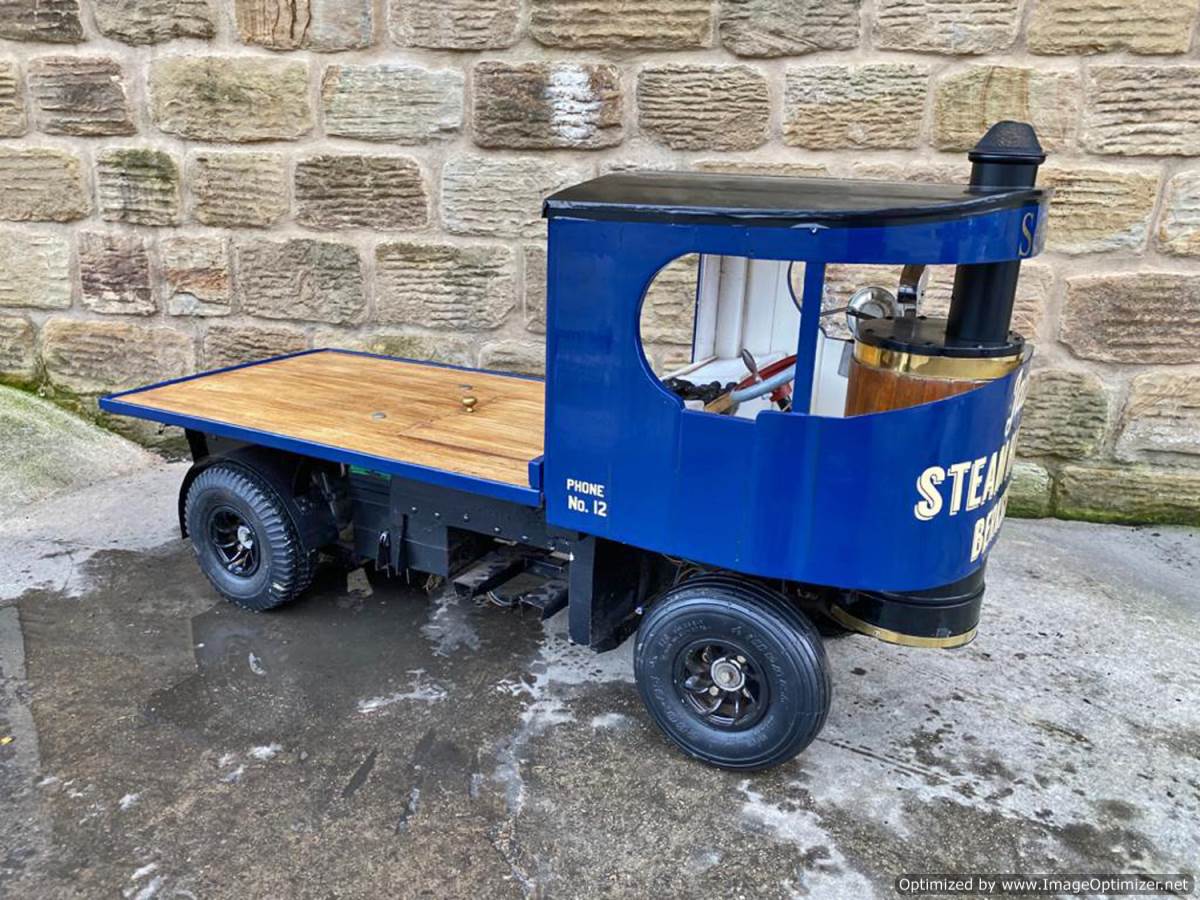 Here we have an unusual and very cool toy! A 3″ scale fully electric ‘Sentinel-esque’ steam lorry. Essentially it’s a mobility scooter in drag,…. and to that end there are a couple of batteries hidden underneath and a mobility scooter electric motor in the back driving the rear wheels. The front axle is ackerman steering actuated by a tiller rather than the steering wheel (which is a dummy), as is of course the boiler!