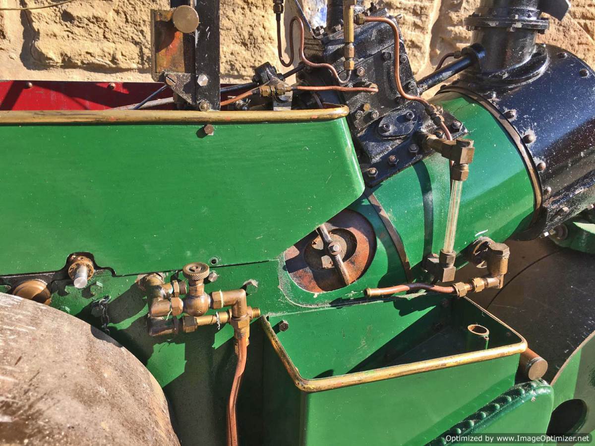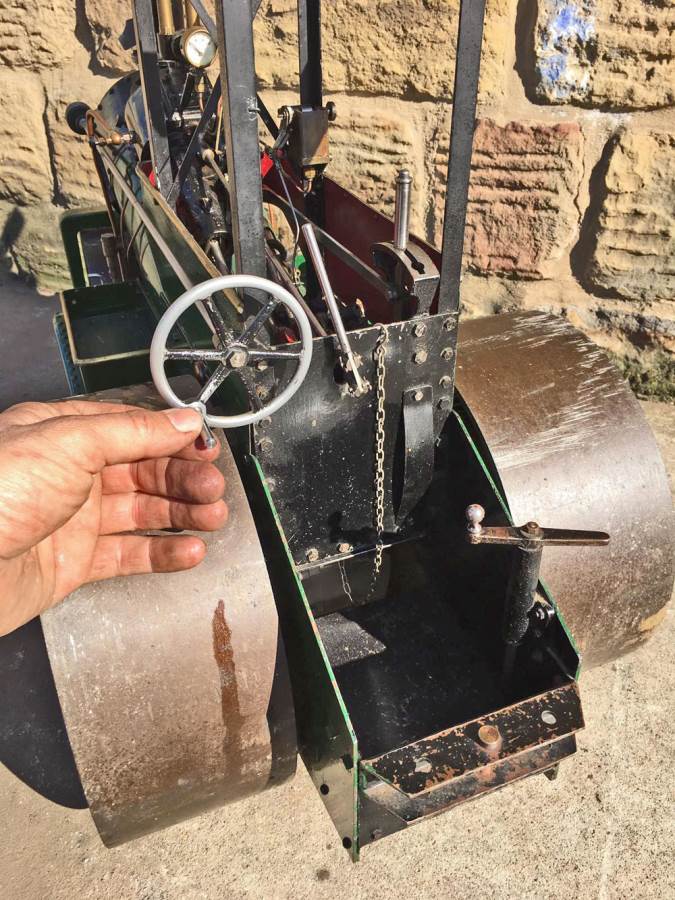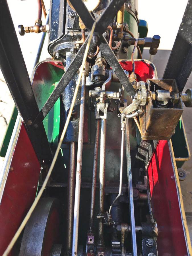 Cosmetically she's a little tired, the paintwork is serviceable but plain and a little chipped here and there.  As with the full size prototype, there isn't a lot of room on the actual footplate of the engine, so many of the fittings are on the outside of the engine it's self rather than in the way of where the driver would stand.  Fitted with an injector, a crank shaft pump and bypass valve mounted on the right hand side of the barrel, as well as the aforementioned hand pump which fits neatly into the tool box on the belly tank.  The gauge glass is huge, and you can see it mounted between the cylinder block and boiler again on the right hand side of the barrel.  Lubrication is mechanical and visible on top of the motion.  Steering on these rollers was by a rather elegant worm and wheel crank over the front rolls, a nice solution that eliminates the vague nature that you sometimes get through the more typical chain steering.