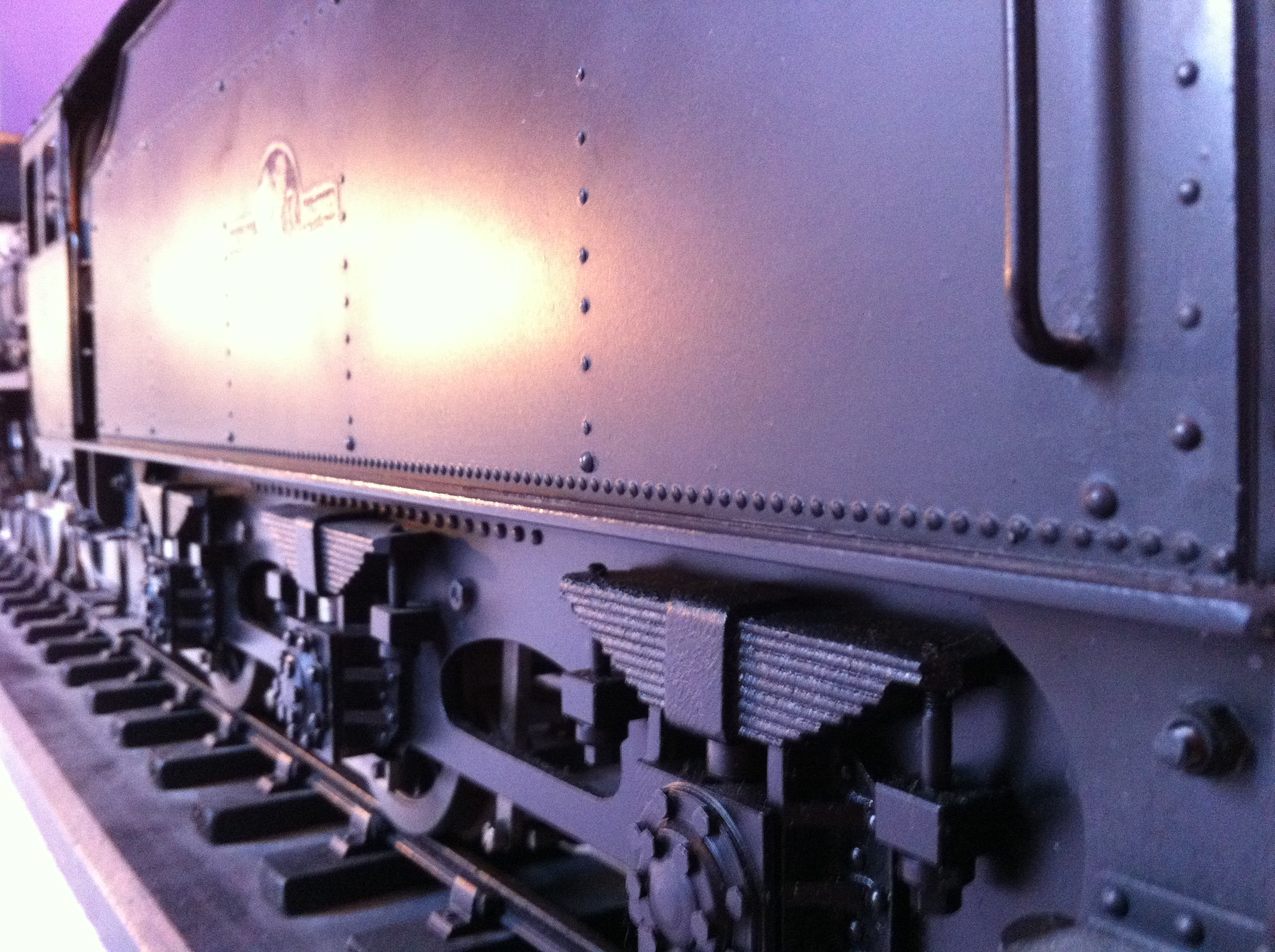 The model is fitted with twin axle driven pumps and bypass valve, an injector and a tender hand pump. There is a large mechanical lubricator under the front footplate, cab operated drain cocks, a quick release ashpan and grate for ease of operation and a lovely big pair of whistles hidden under the footplate!