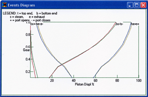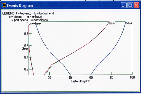 The results are excellent despite some asymmetry in the lifting arrangements. To experiment I made minimal alterations to the gear as follows. To make the lifting link’s excursions more symmetrical I increased the length of the lifting arm by 1.75″ and the suspension offset to 7/8ths. This resulted in the necessity of no more than a 24o angle of the lifting arm for full gear. The valve was altered to sit line-in-line with an increased lap of 1.5625″ and reset accordingly. Other than the latter modification, nothing specific has yet been carried out to curb the preadmission, yet already the percentage at 20% cut off has been shaved considerably and the leads equalised. A new graph for events shows the achievements due to minor things which could readily have been diagnosed at the design stage, unless perhaps, the method of producing the events tabulation persuaded otherwise. As a ‘bonus’ the exhaust symmetry has improved noticeably.