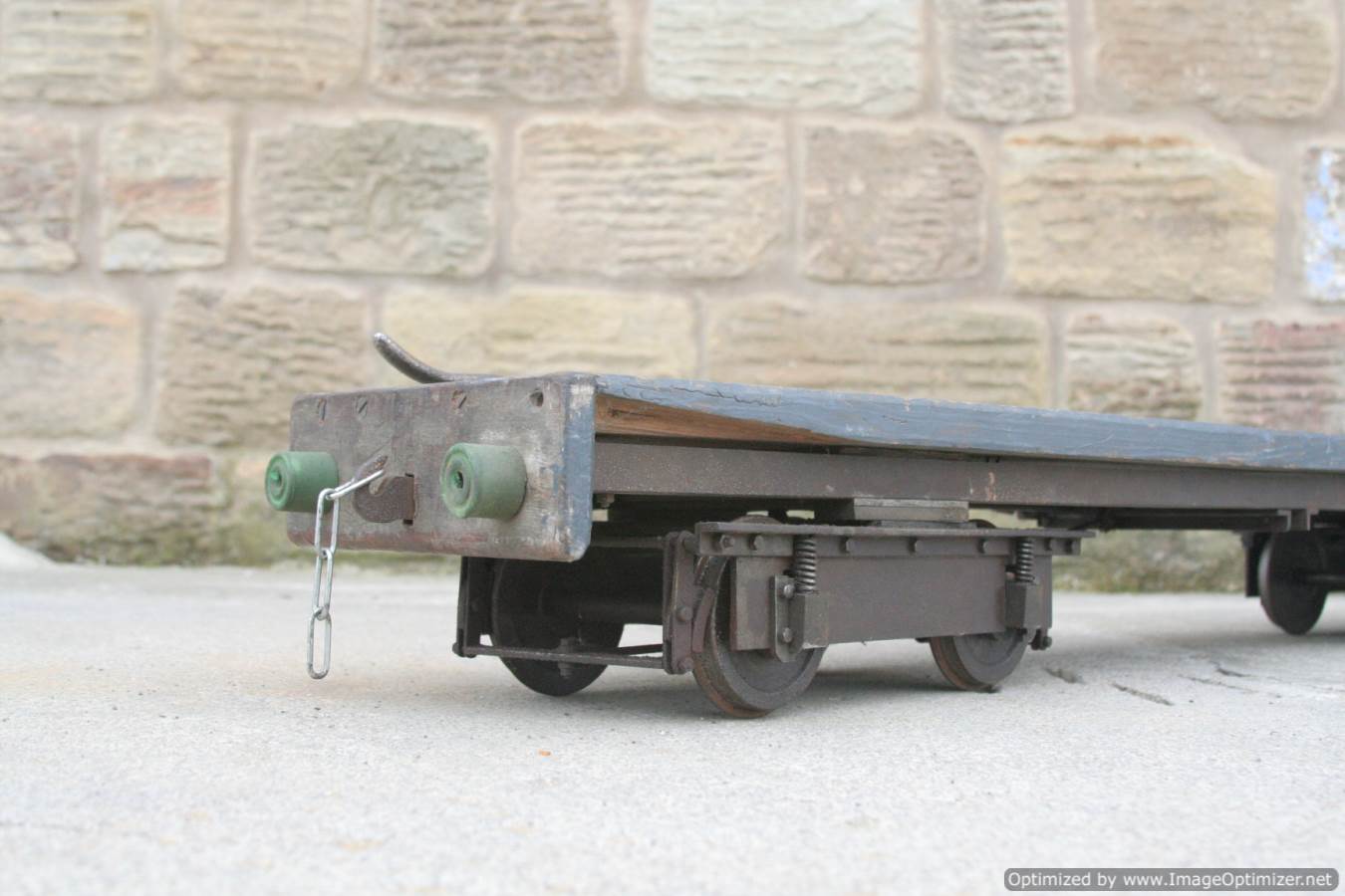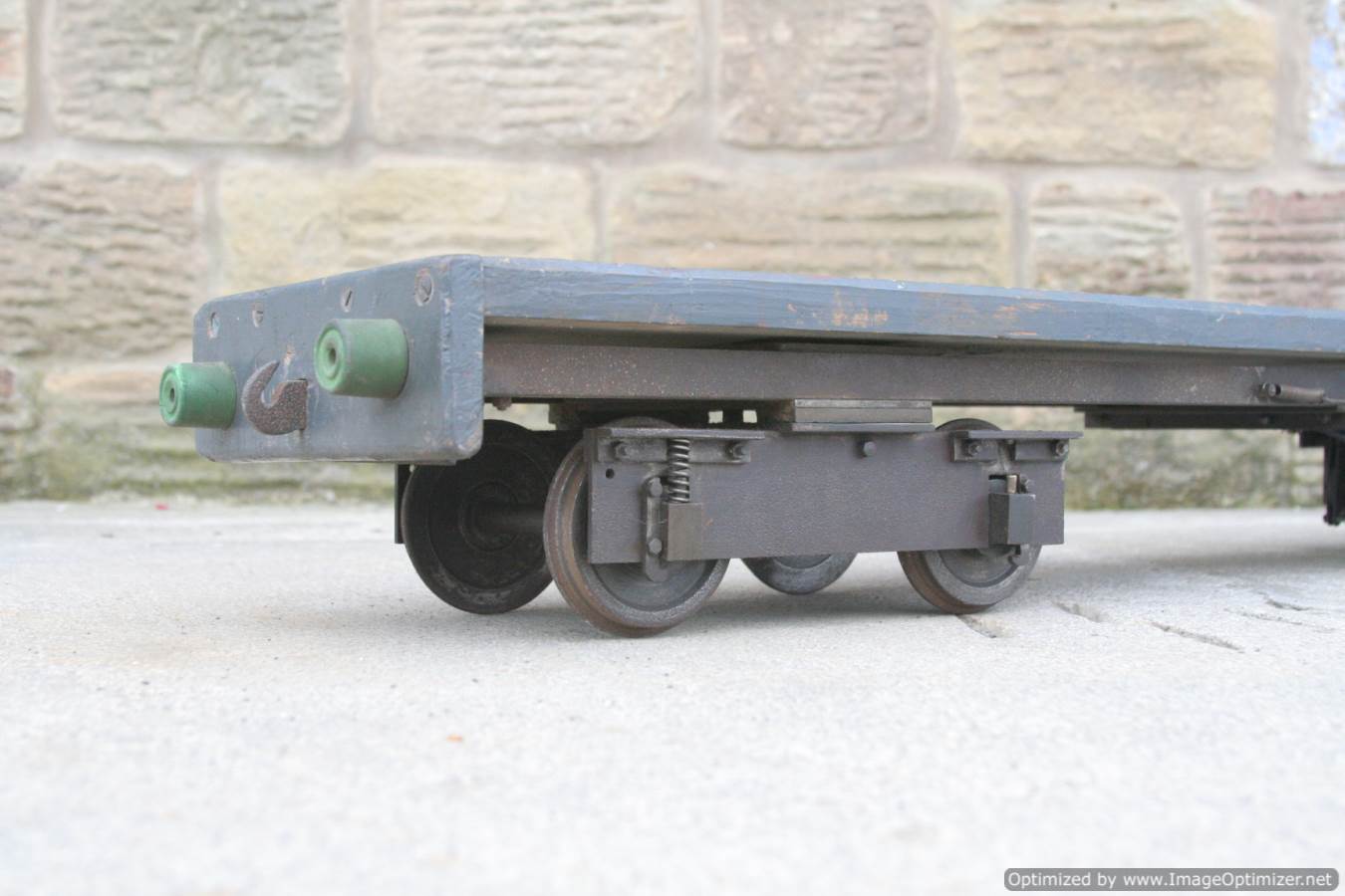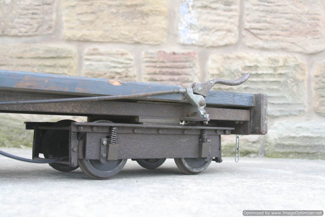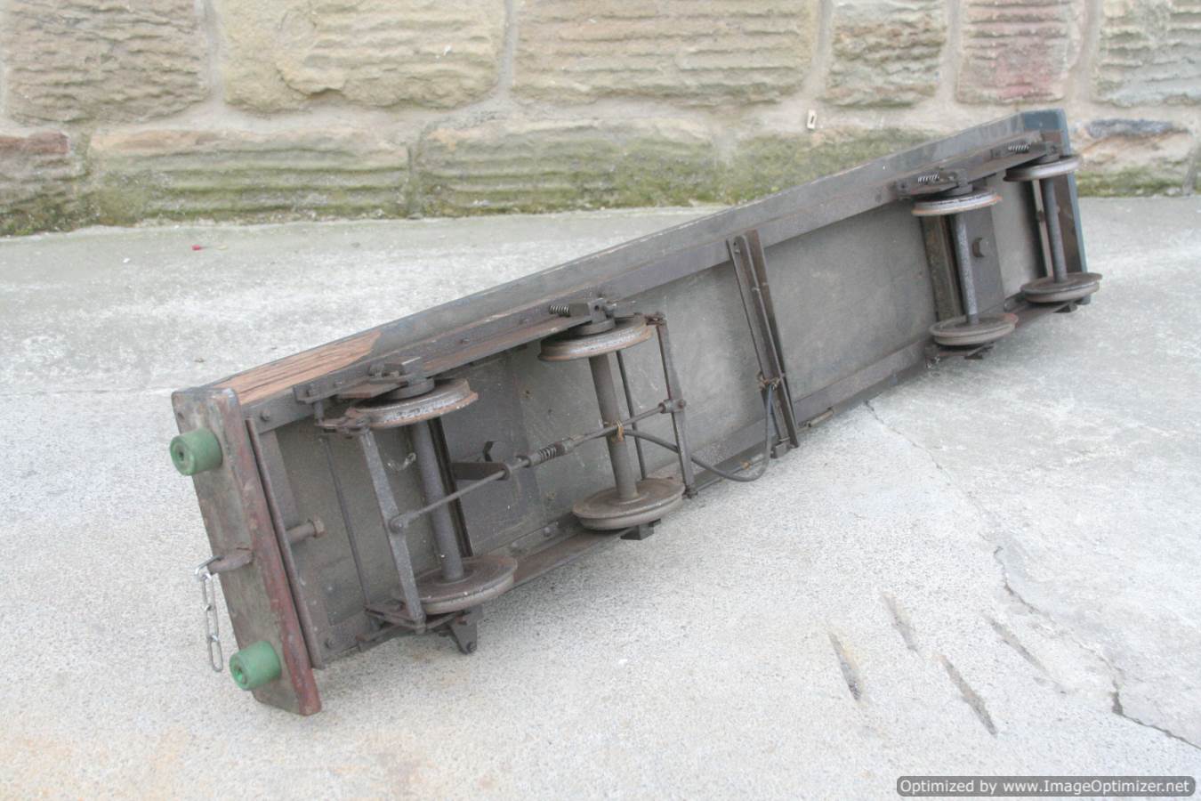 Here we have a solidly made 5" gauge braked, bogie riding truck. Braked to 1 bogie, and simply sprung with competently built bogies. There is a spring missing in the photos, but we have it,..... it just popped out during the photography session and we didn't notice until afterwards. Could be easily modified for either raised track use, or with a box on top and a bar through a couple of drilled holes in the frame for a more comfortable ground level use. A great start for someone to tart up as a nice riding or driving truck.