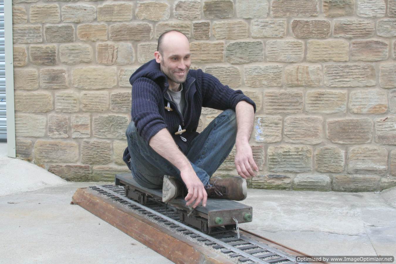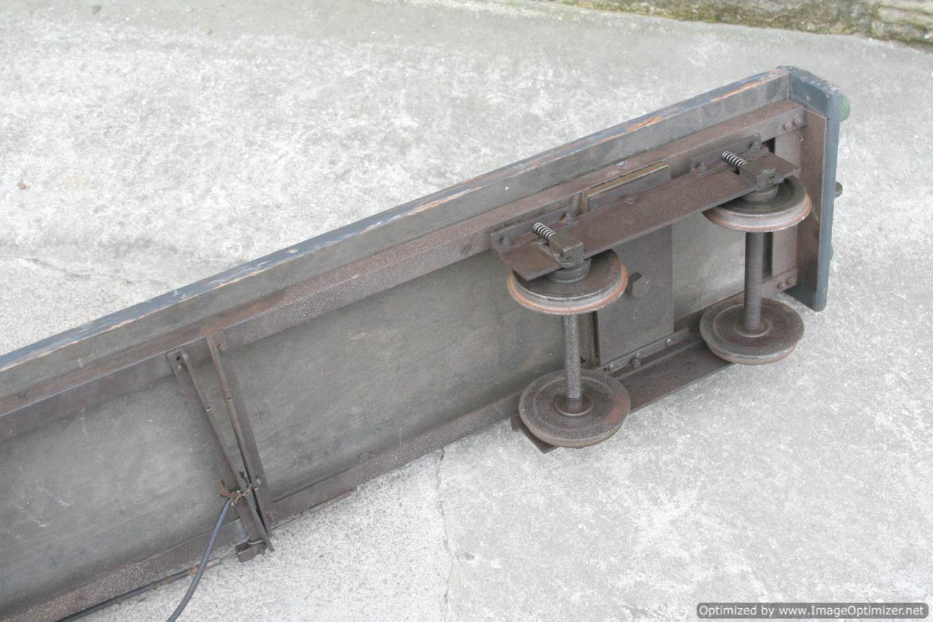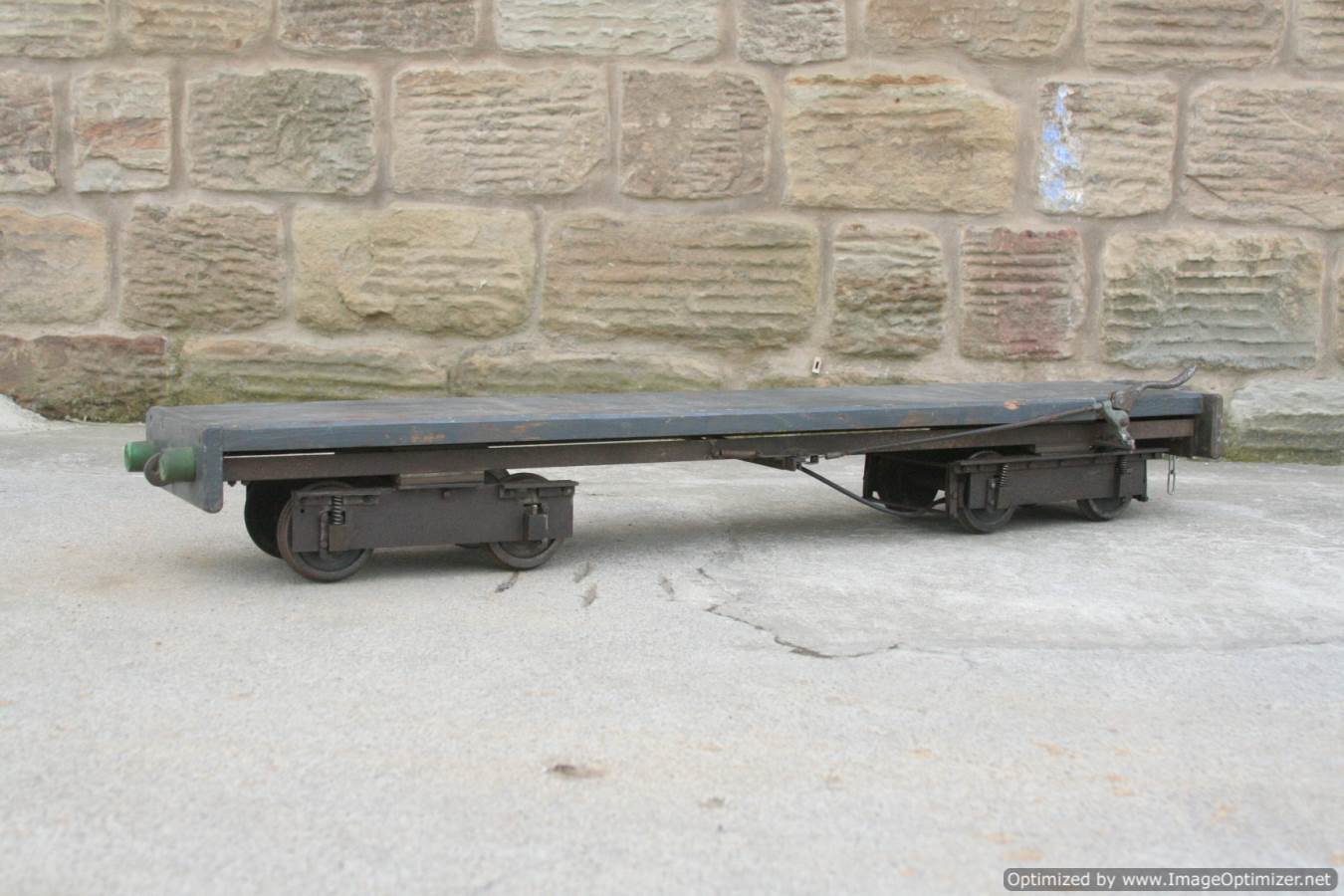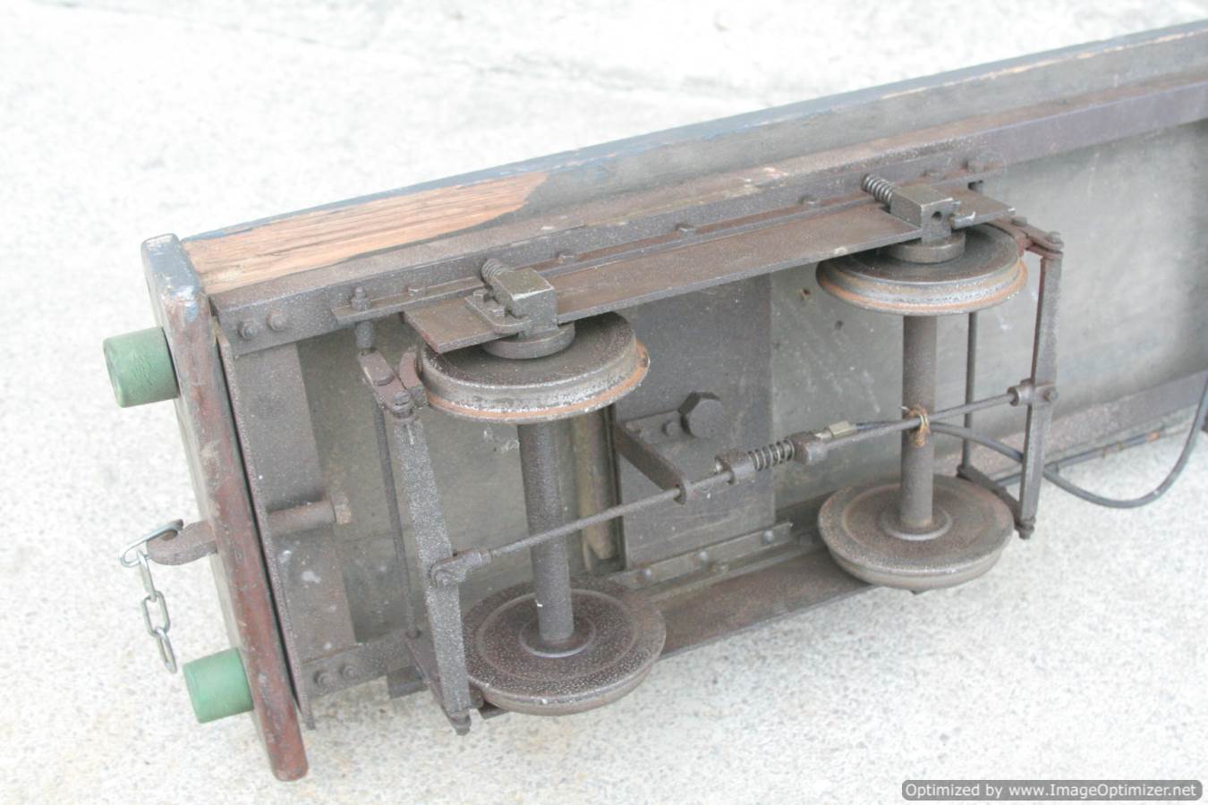 Here we have a solidly made 5" gauge braked, bogie riding truck. Braked to 1 bogie, and simply sprung with competently built bogies. There is a spring missing in the photos, but we have it,..... it just popped out during the photography session and we didn't notice until afterwards. Could be easily modified for either raised track use, or with a box on top and a bar through a couple of drilled holes in the frame for a more comfortable ground level use. A great start for someone to tart up as a nice riding or driving truck.