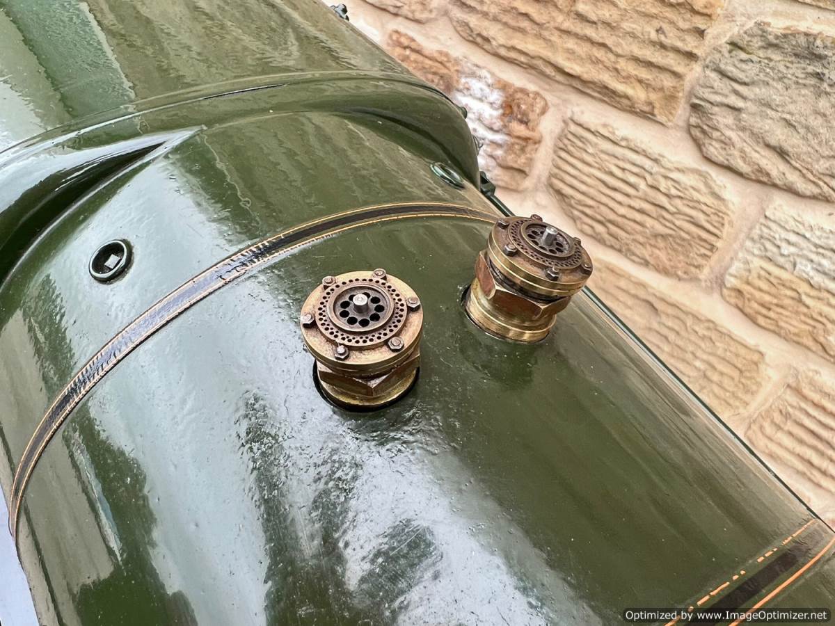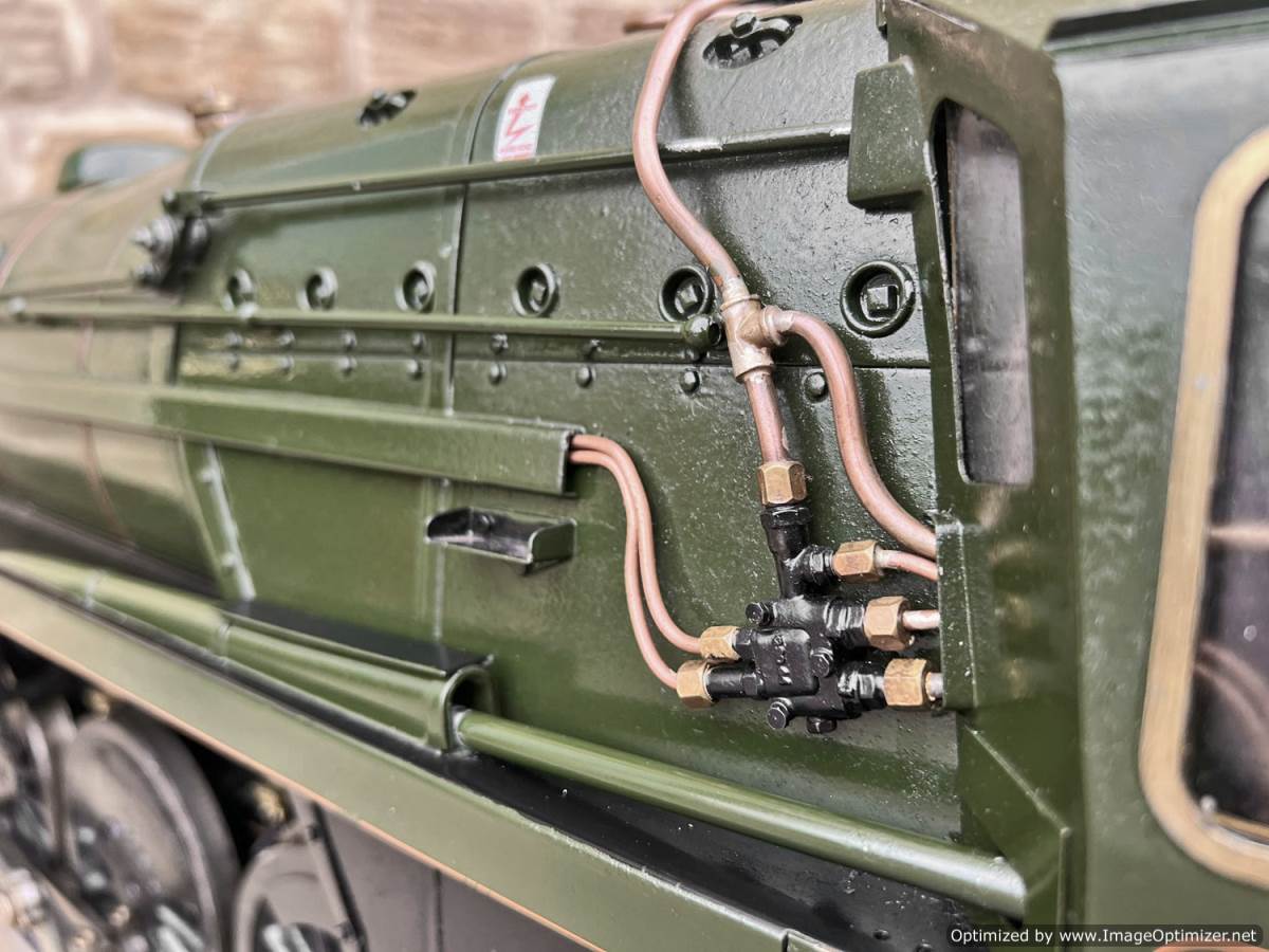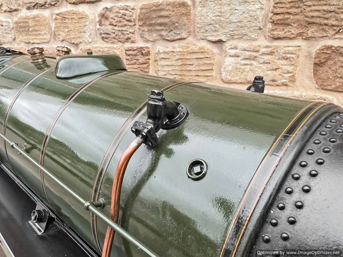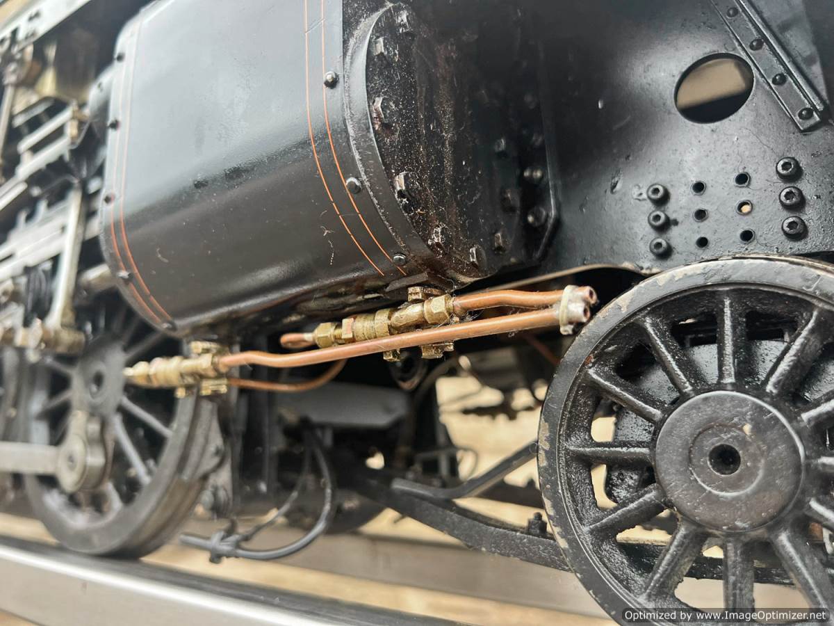 Fitted with an injector, an axle pump and of course a hand pump in the tender. Lubrication is mechanical and nicely don on the running boards in the appropriate prototypical location. Judging by the soot on the front tube plate where the copper is still visible, the loco has only been steamed once or twice, probably just for basic commissioning purposes.