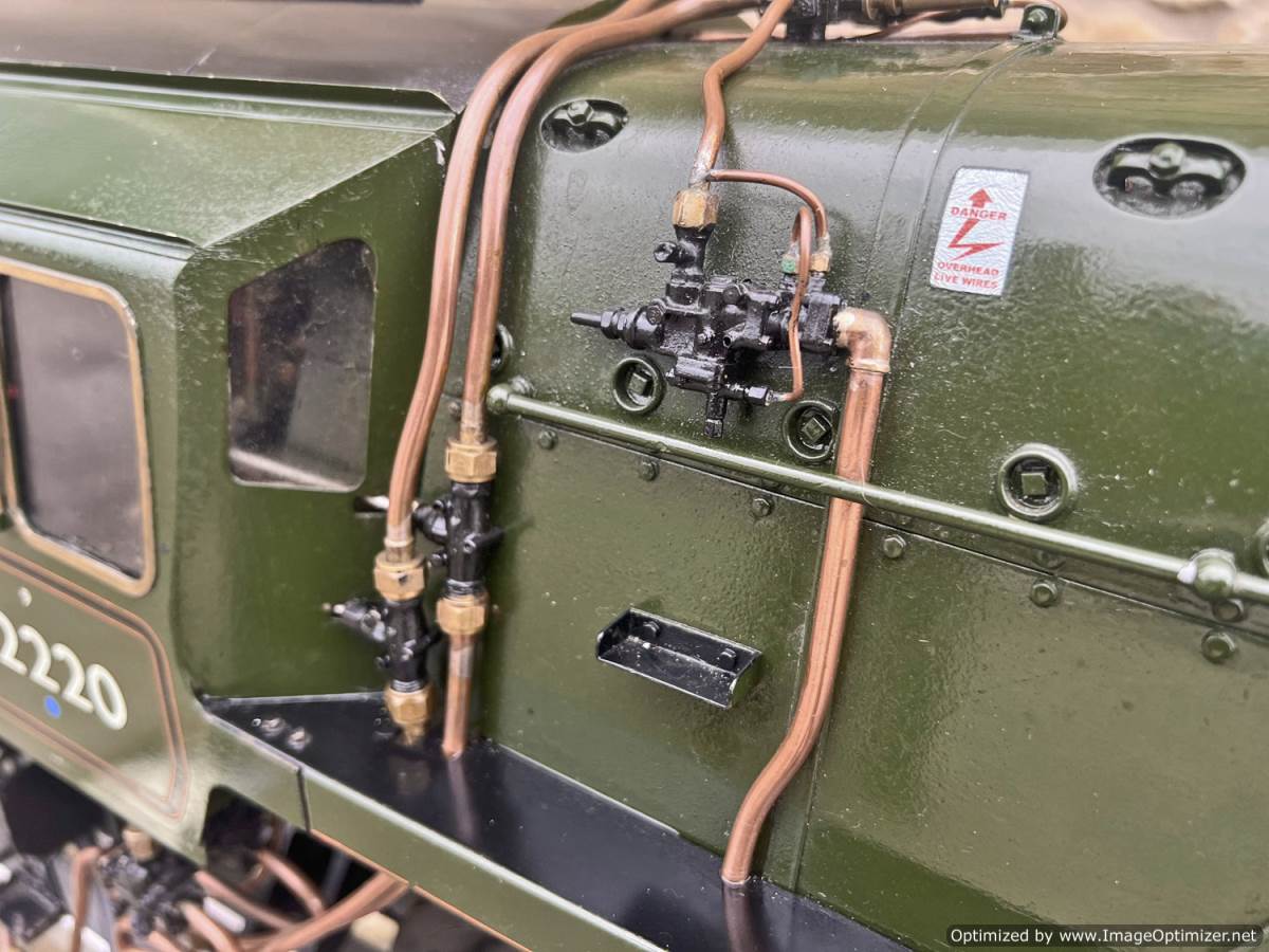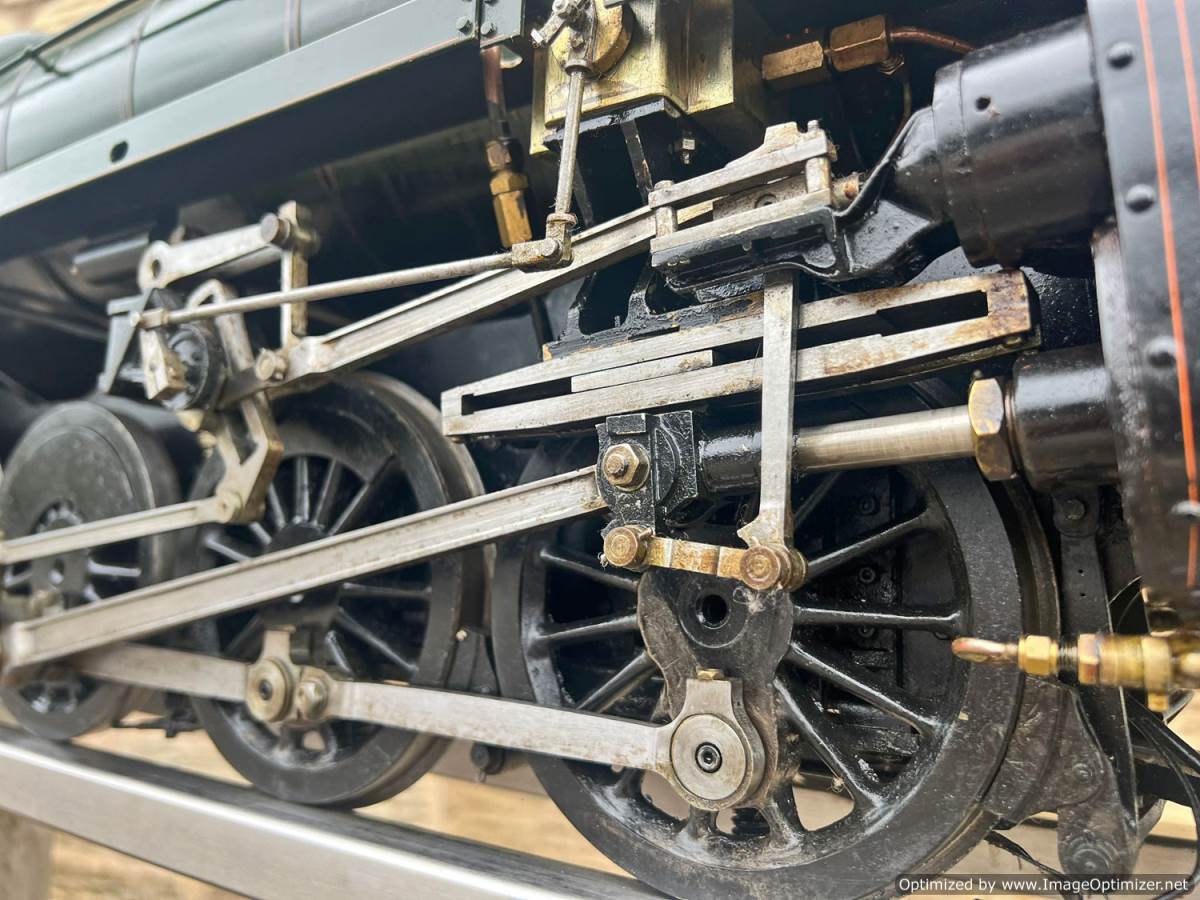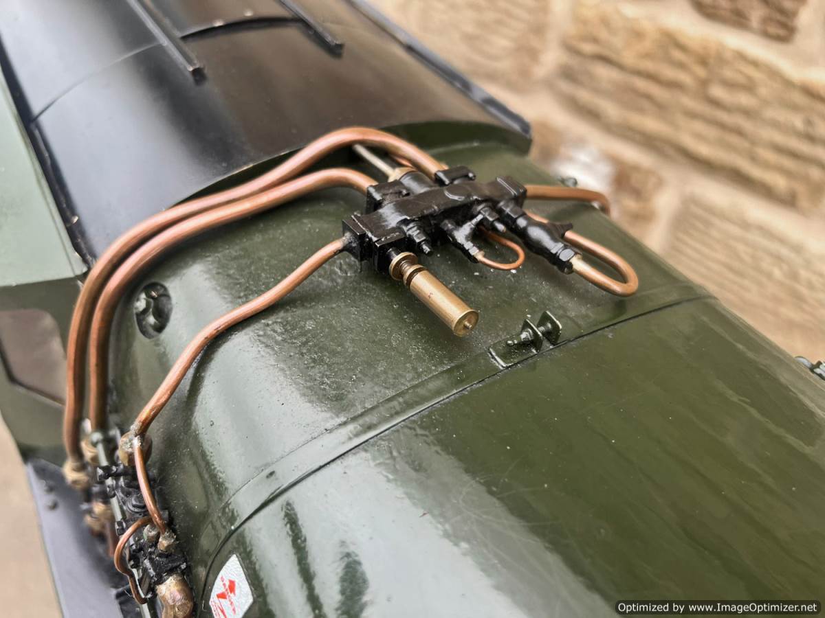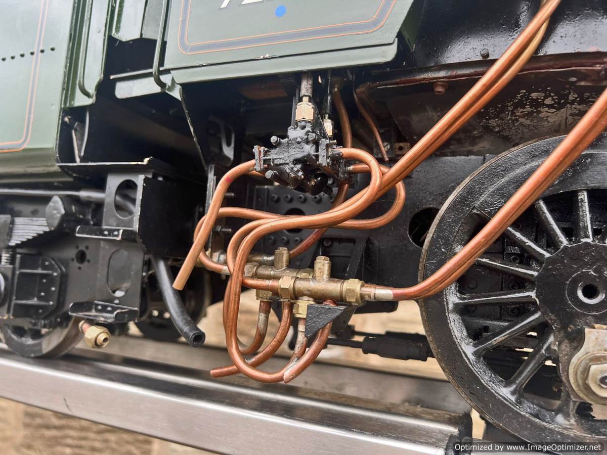Fitted with an injector, an axle pump and of course a hand pump in the tender. Lubrication is mechanical and nicely don on the running boards in the appropriate prototypical location. Judging by the soot on the front tube plate where the copper is still visible, the loco has only been steamed once or twice, probably just for basic commissioning purposes.