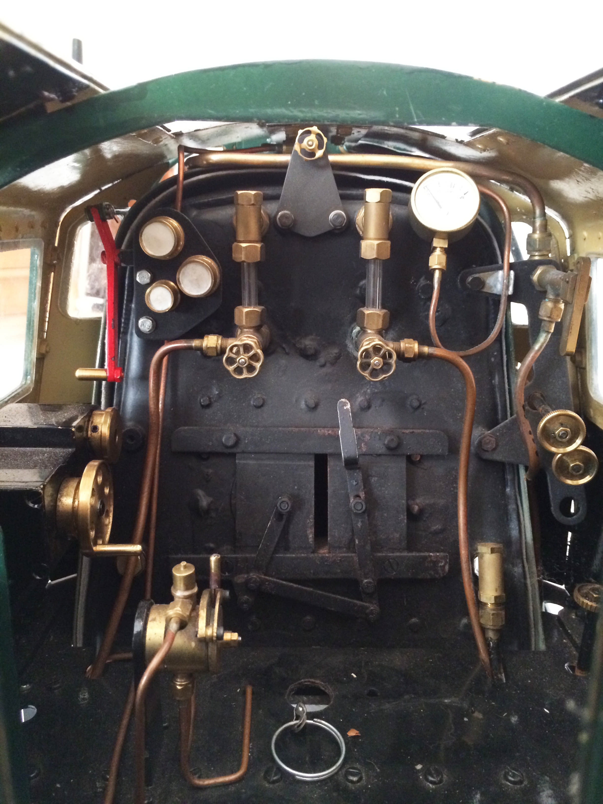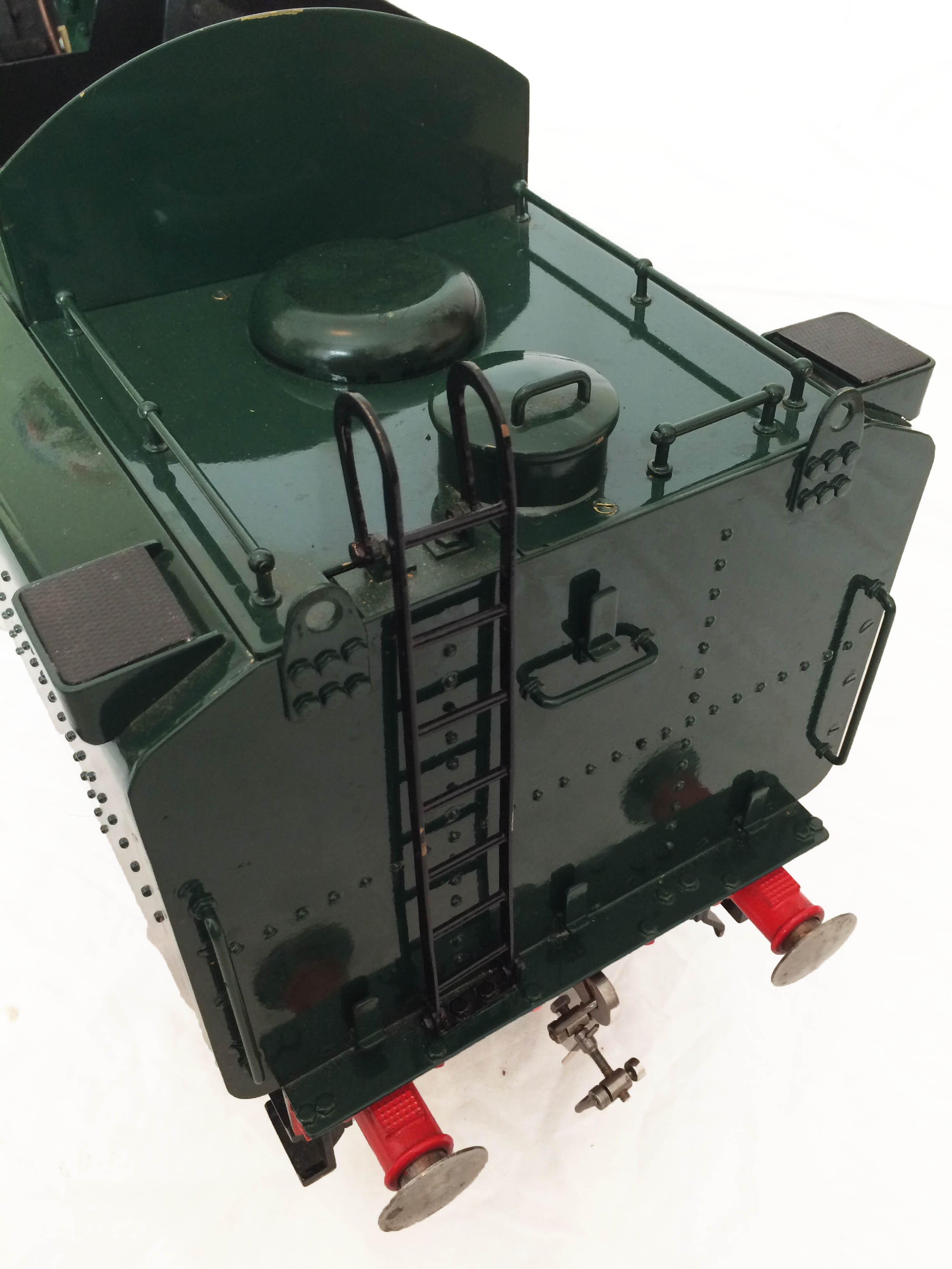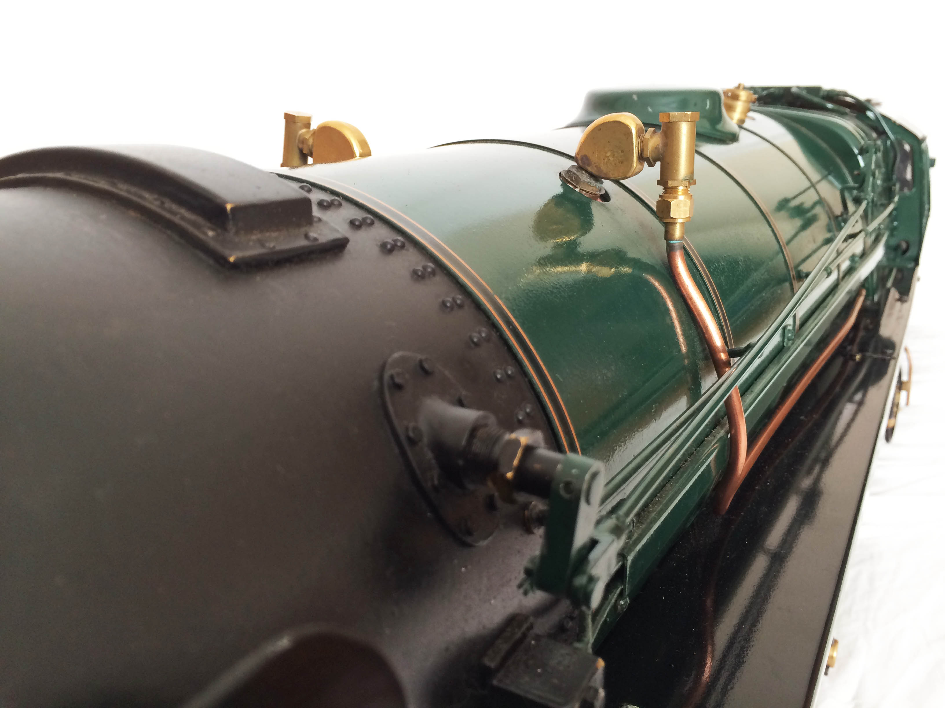 It has the usual professionally built silver soldered copper boiler with twin water gauges.  The drain cocks are the automatic pressure relief type, the motion is correctly fluted with the coupling rods unfluted as they should be.  She is fitted with two valve gear operated mechanical lubricators, one feeding each cylinder, there is an eccentric driven feed pump with a footplate operated water feed isolation valve.  The loco is fitted with an injector, and a footplate operated steam brake.  There is also the usual additional water feed emergency hand pump hidden in the tender.