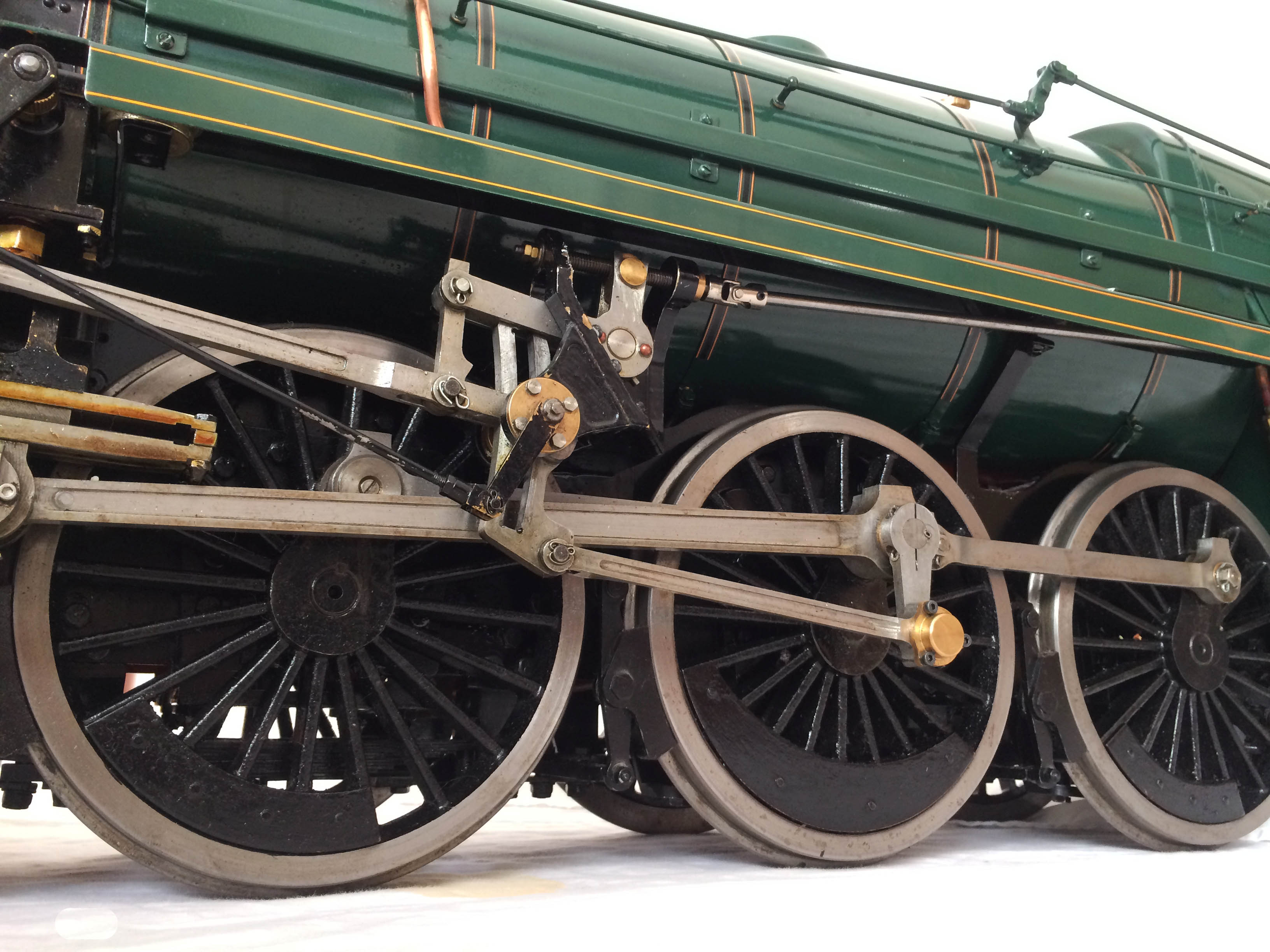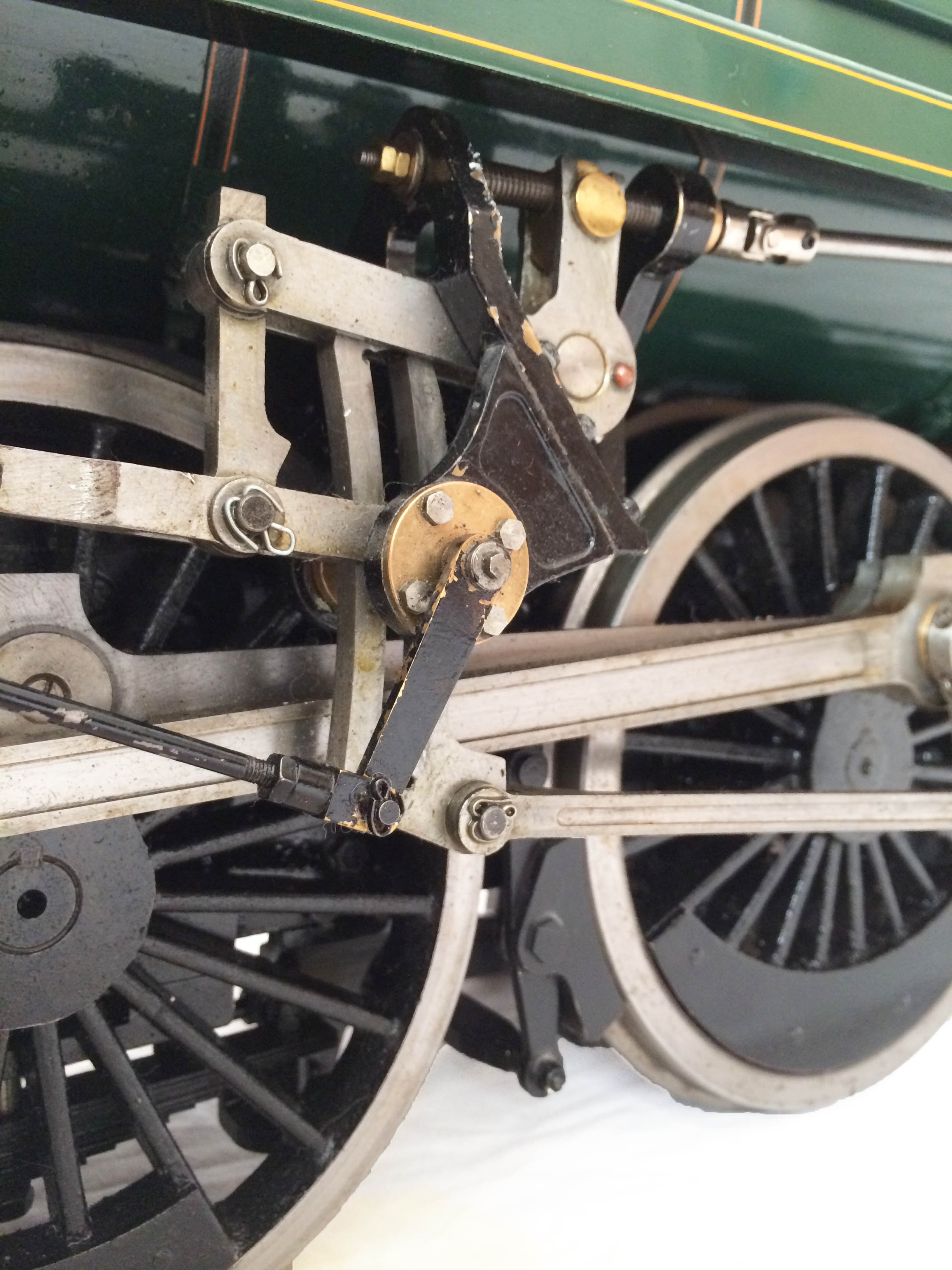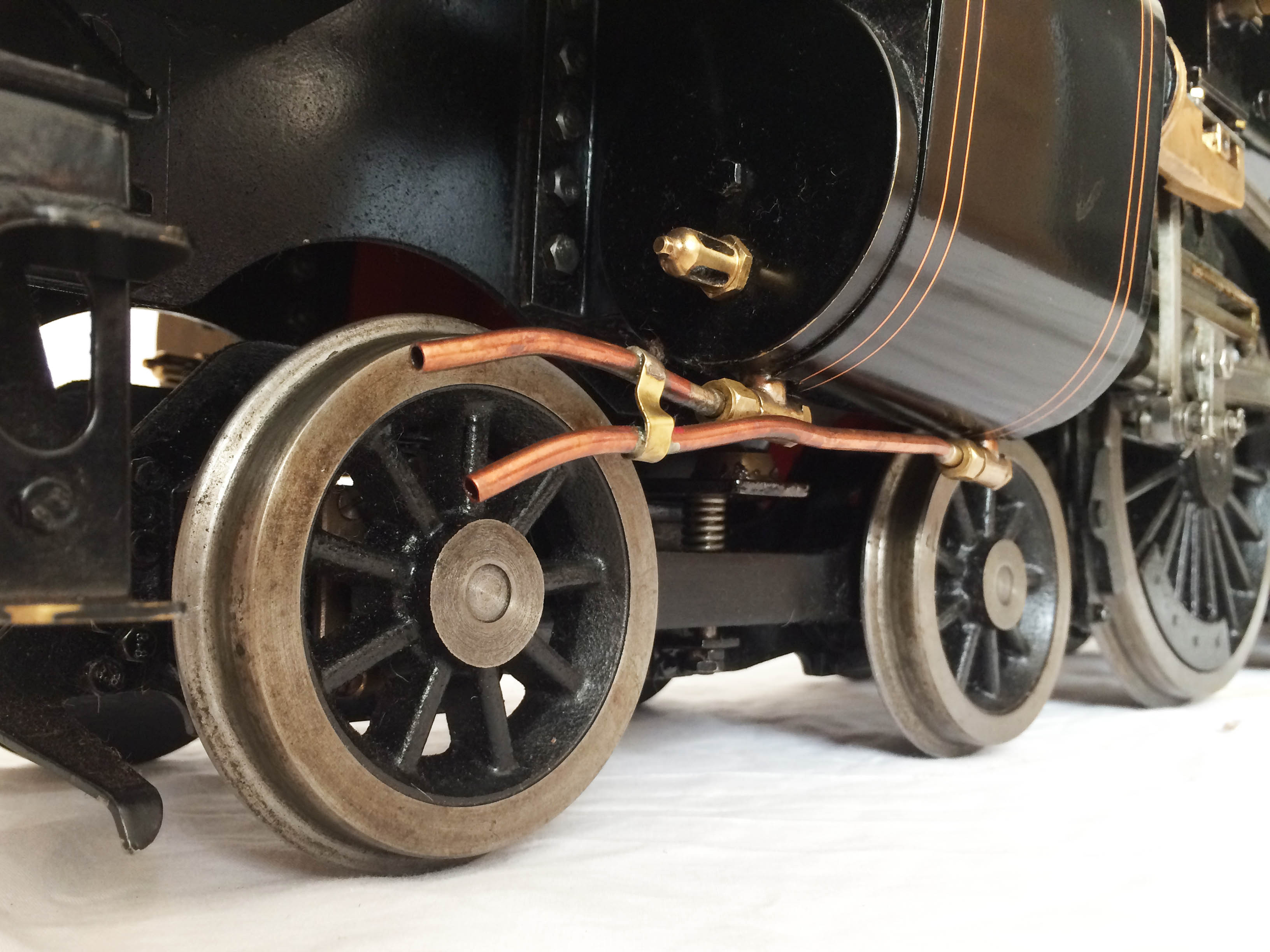 It has the usual professionally built silver soldered copper boiler with twin water gauges.  The drain cocks are the automatic pressure relief type, the motion is correctly fluted with the coupling rods unfluted as they should be.  She is fitted with two valve gear operated mechanical lubricators, one feeding each cylinder, there is an eccentric driven feed pump with a footplate operated water feed isolation valve.  The loco is fitted with an injector, and a footplate operated steam brake.  There is also the usual additional water feed emergency hand pump hidden in the tender.
