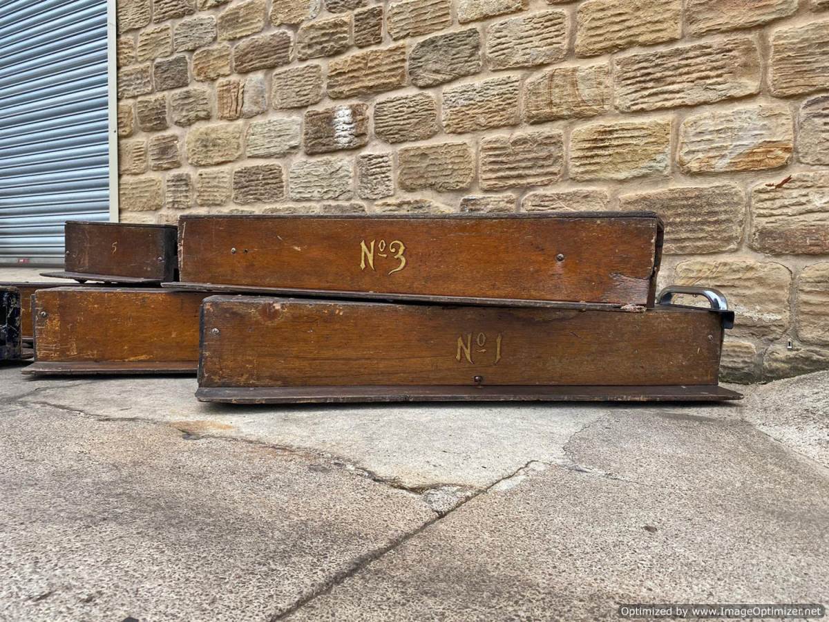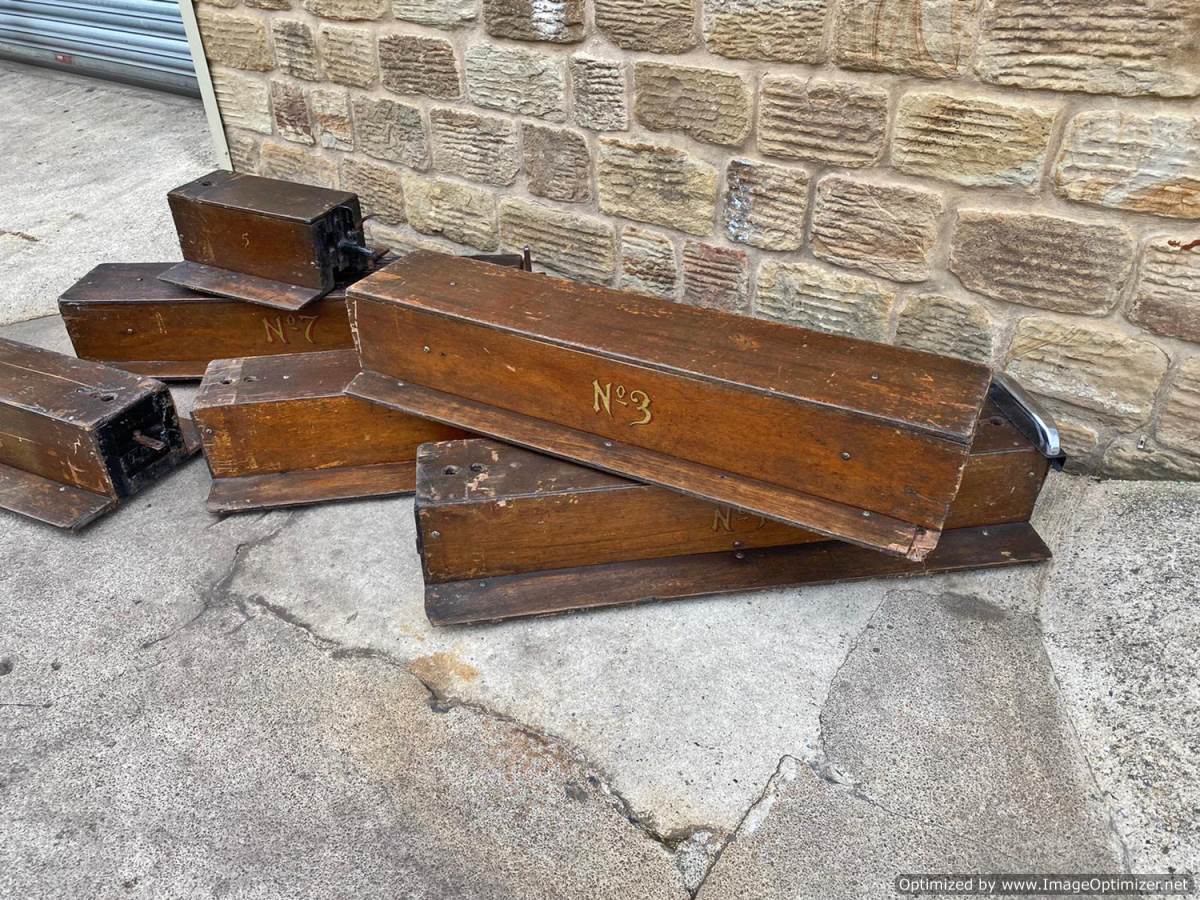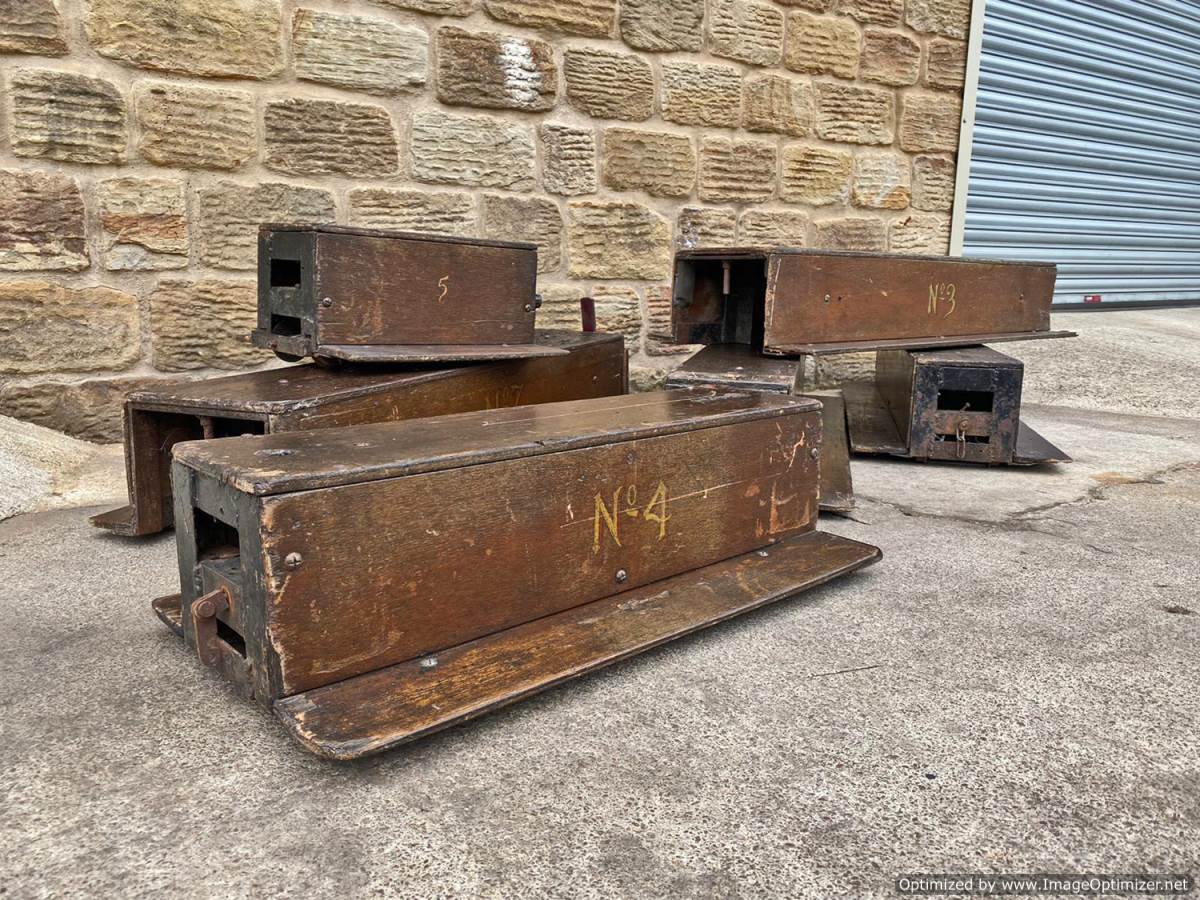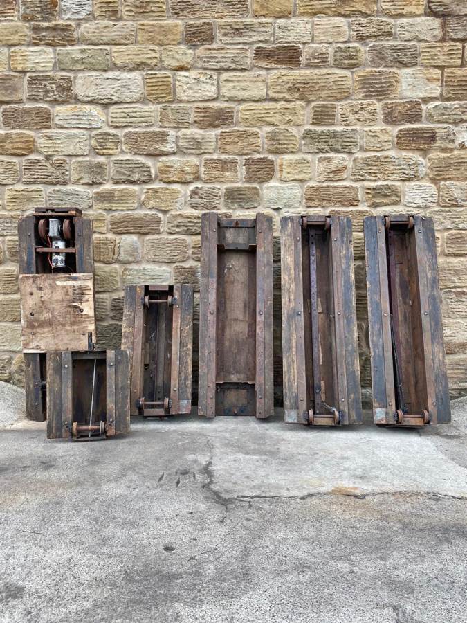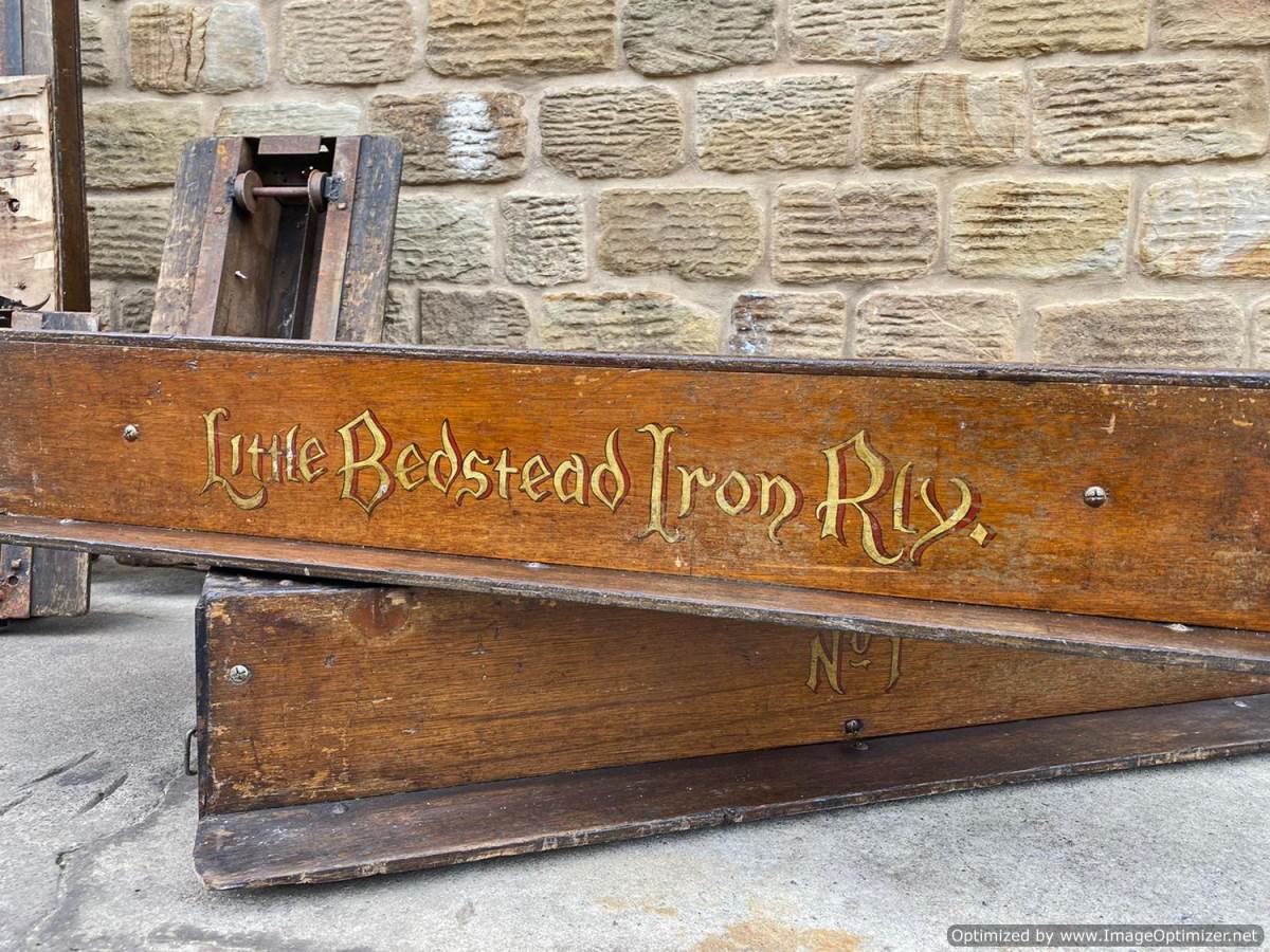 Here we have a mixed and interesting rake of ground level 5" gauge driving trucks and carriages. It's clearly an incomplete set of wagons that have originally made up a complete train. A mixture of independent ready to roll trucks and articulated, suspended centre sections, a motorised unit and a single axle trailer unit that appears to be designed to latch onto either the rear of a loco or indeed one of the carriages. They are all showing their age, but the woodwork is still both viable and attractive. The whole thing, whilst clearly requiring work to bring back to former glory, has a lovely old fashioned feel to it. It's a pretty little rake that deserves to find the TLC it needs.