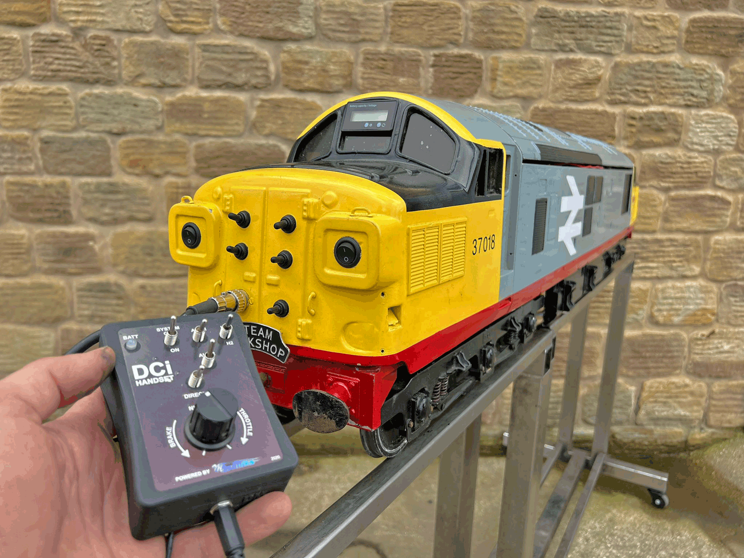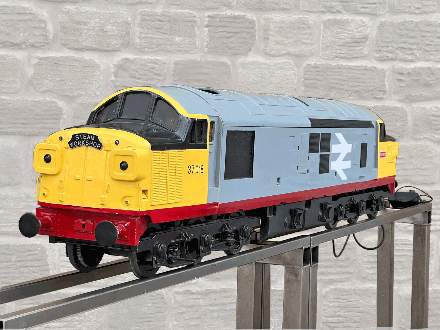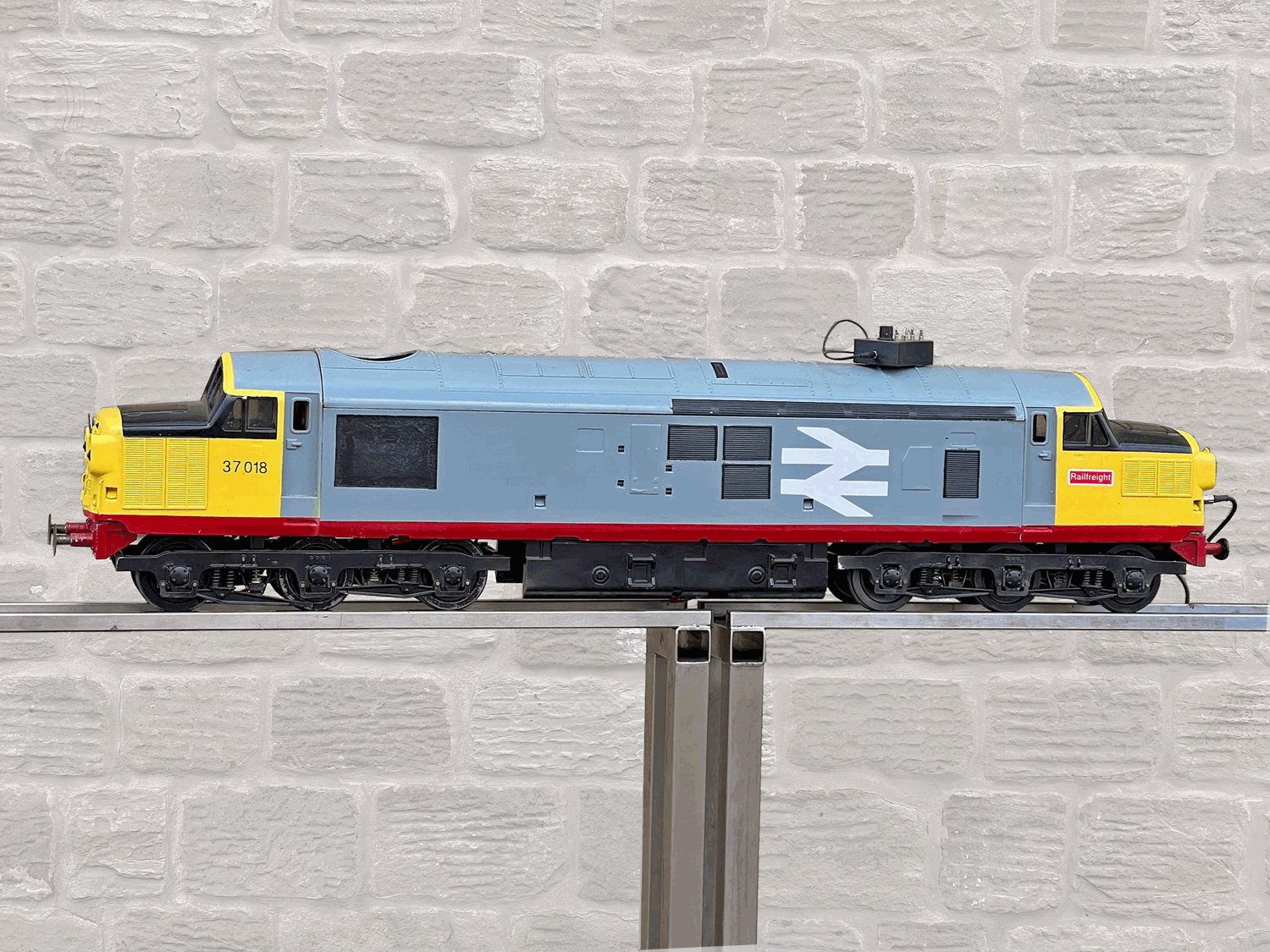 Here we have a 5" BR Class 37 battery electric loco. Complete with sound and lights, and well thought out controls and wiring by the previous owner. Fitted with 4 motors and the well respected M-Tronicks sound system and 4QD controller, with two brand new leisure batteries as well as a battery charger for both them and the auxiliary battery that operates the lights.