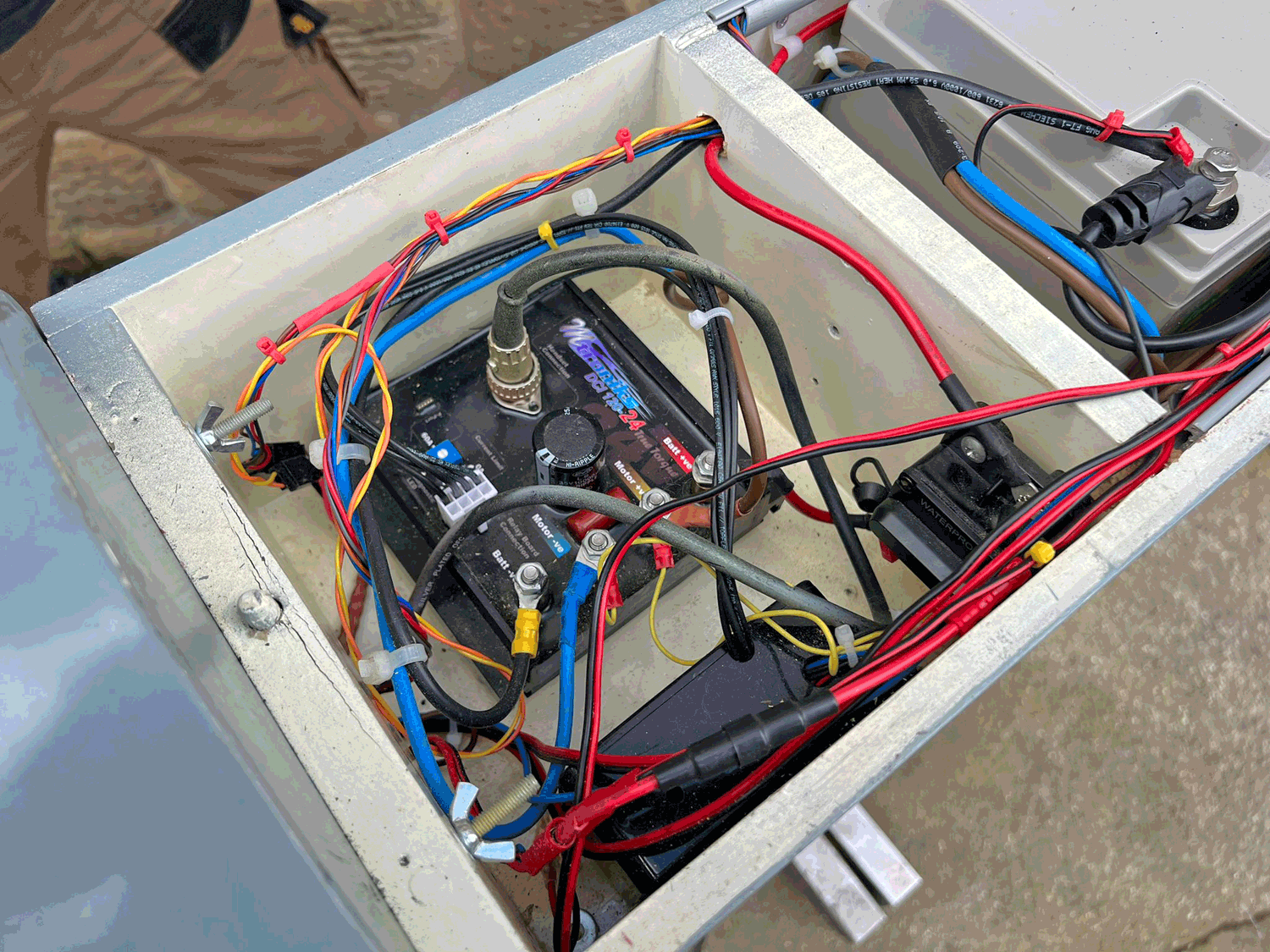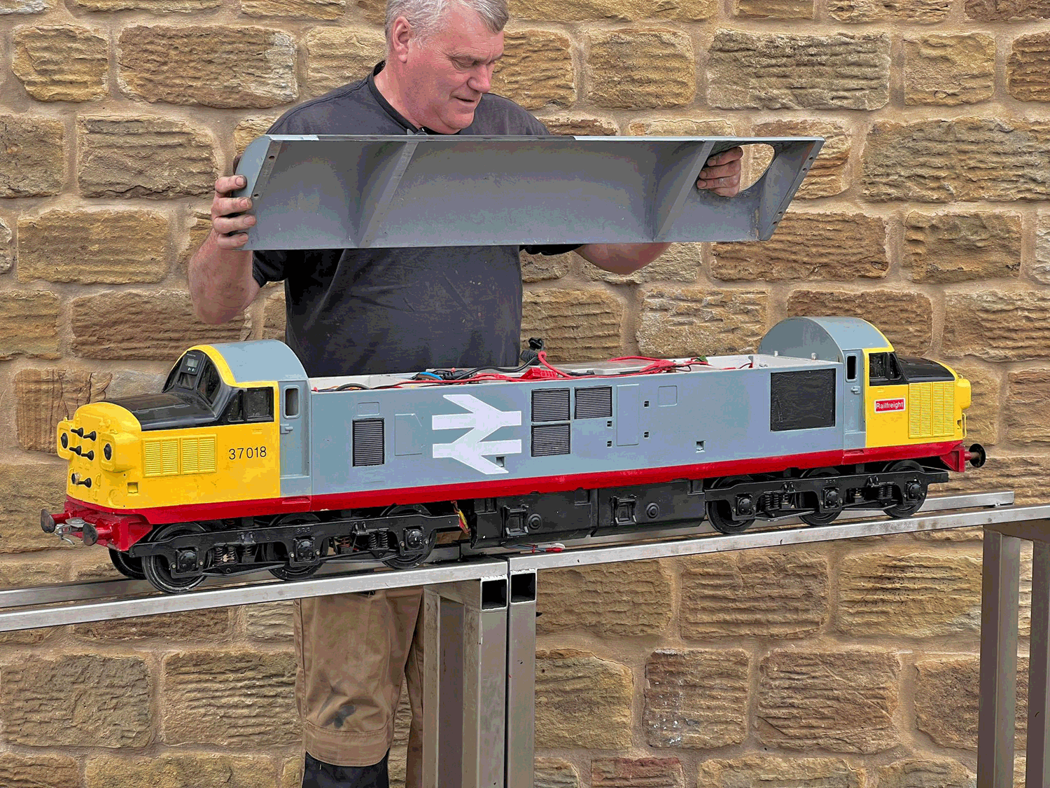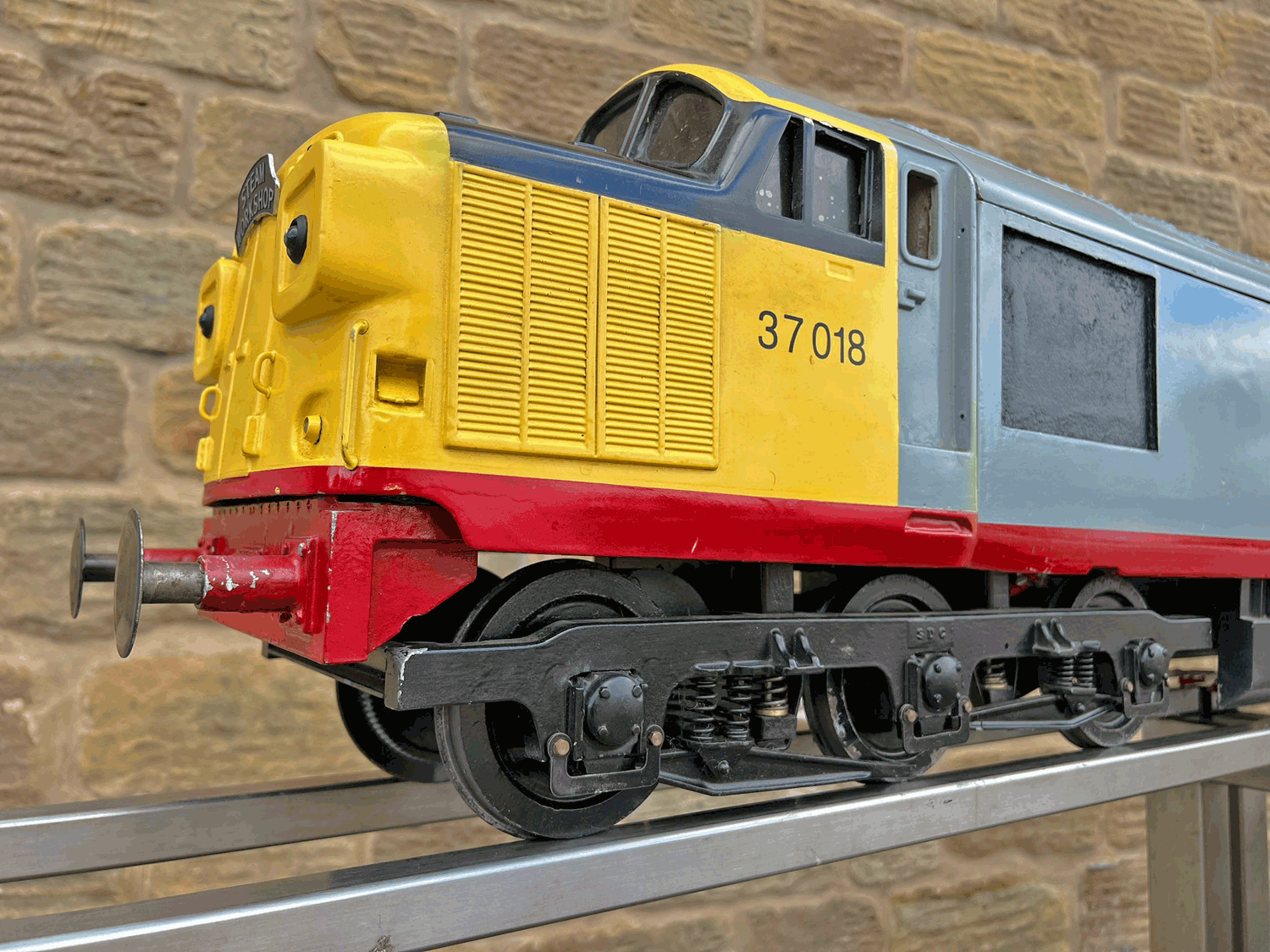 Here we have a 5" BR Class 37 battery electric loco. Complete with sound and lights, and well thought out controls and wiring by the previous owner. Fitted with 4 motors and the well respected M-Tronicks sound system and 4QD controller, with two brand new leisure batteries as well as a battery charger for both them and the auxiliary battery that operates the lights.