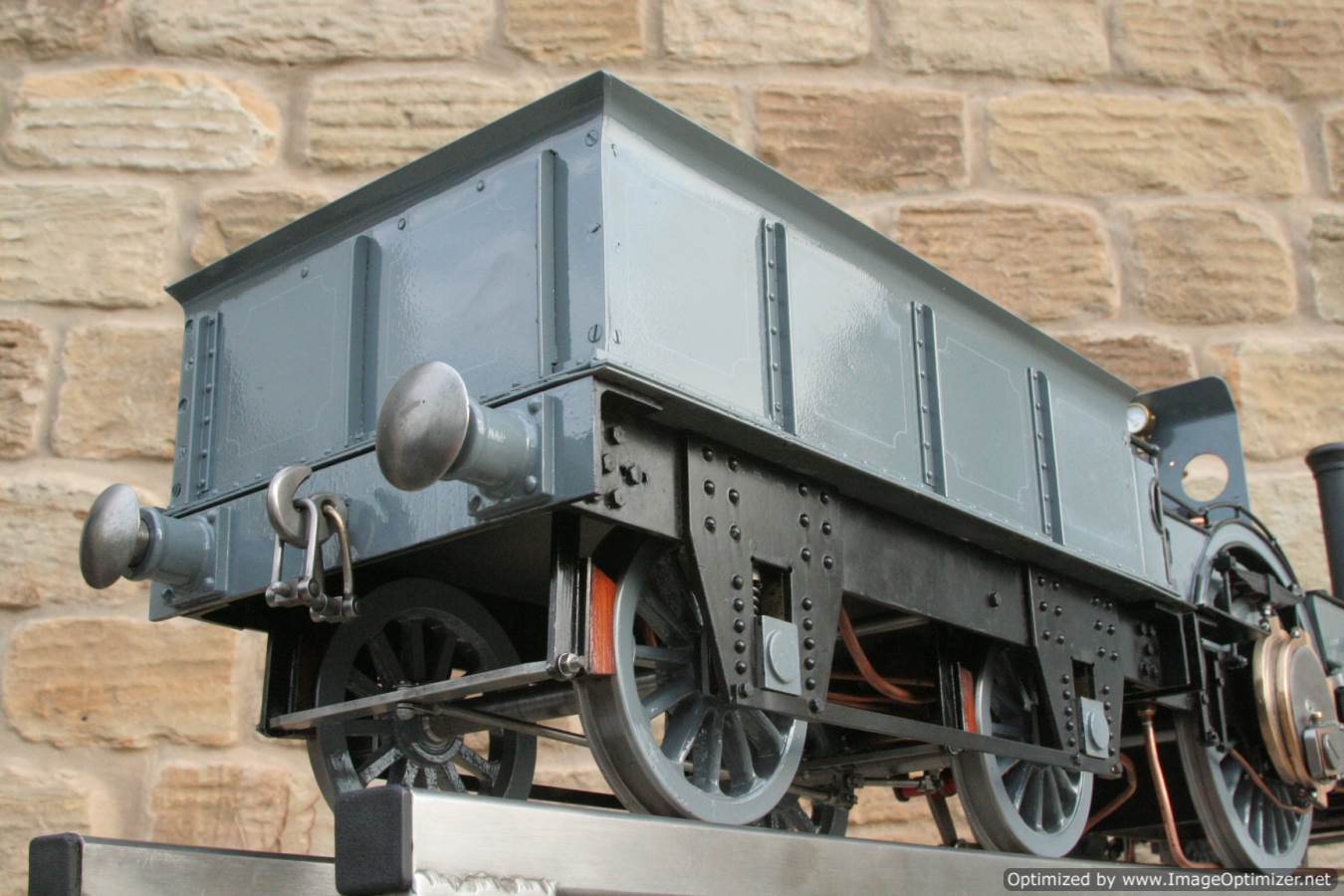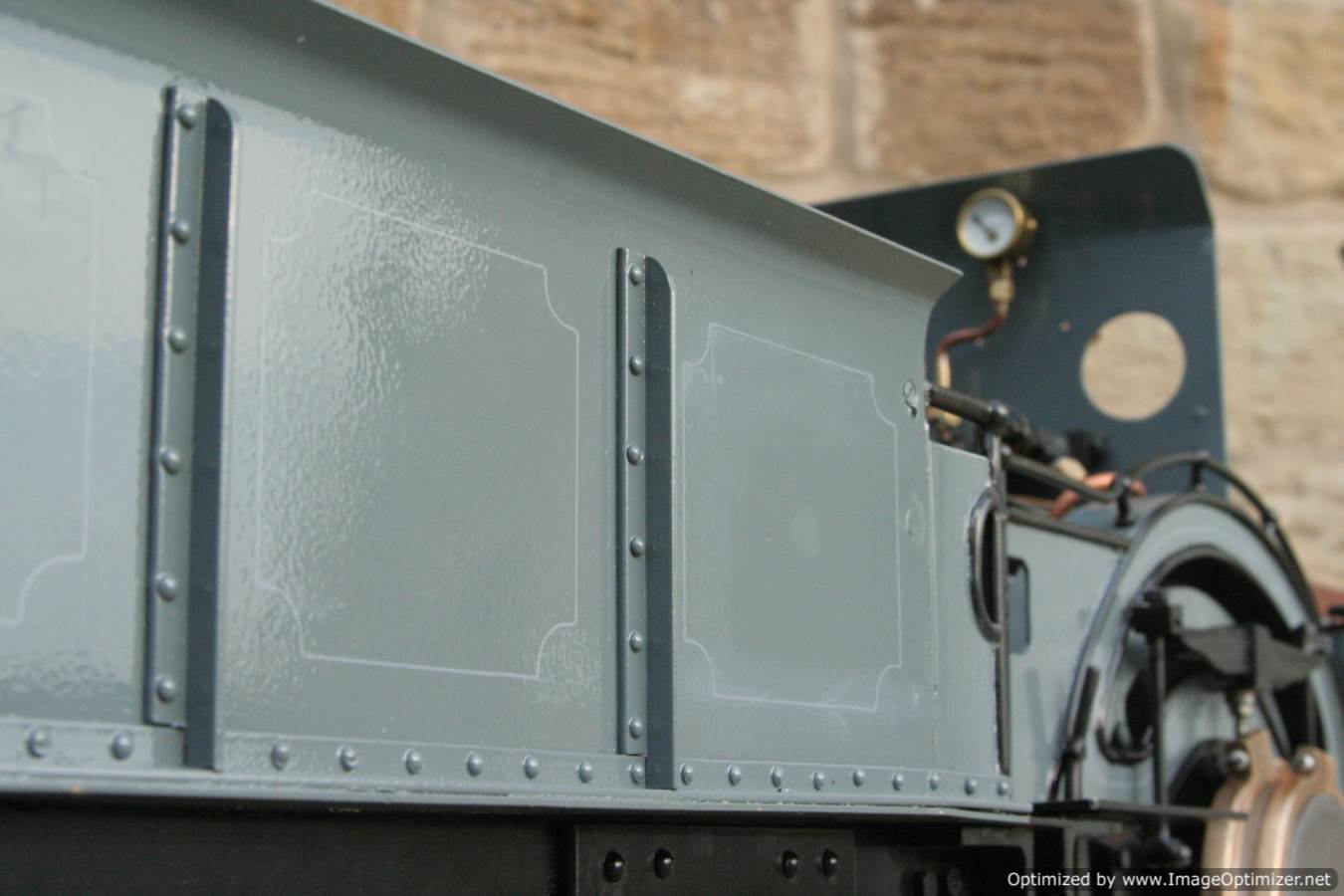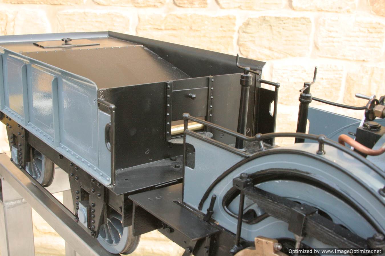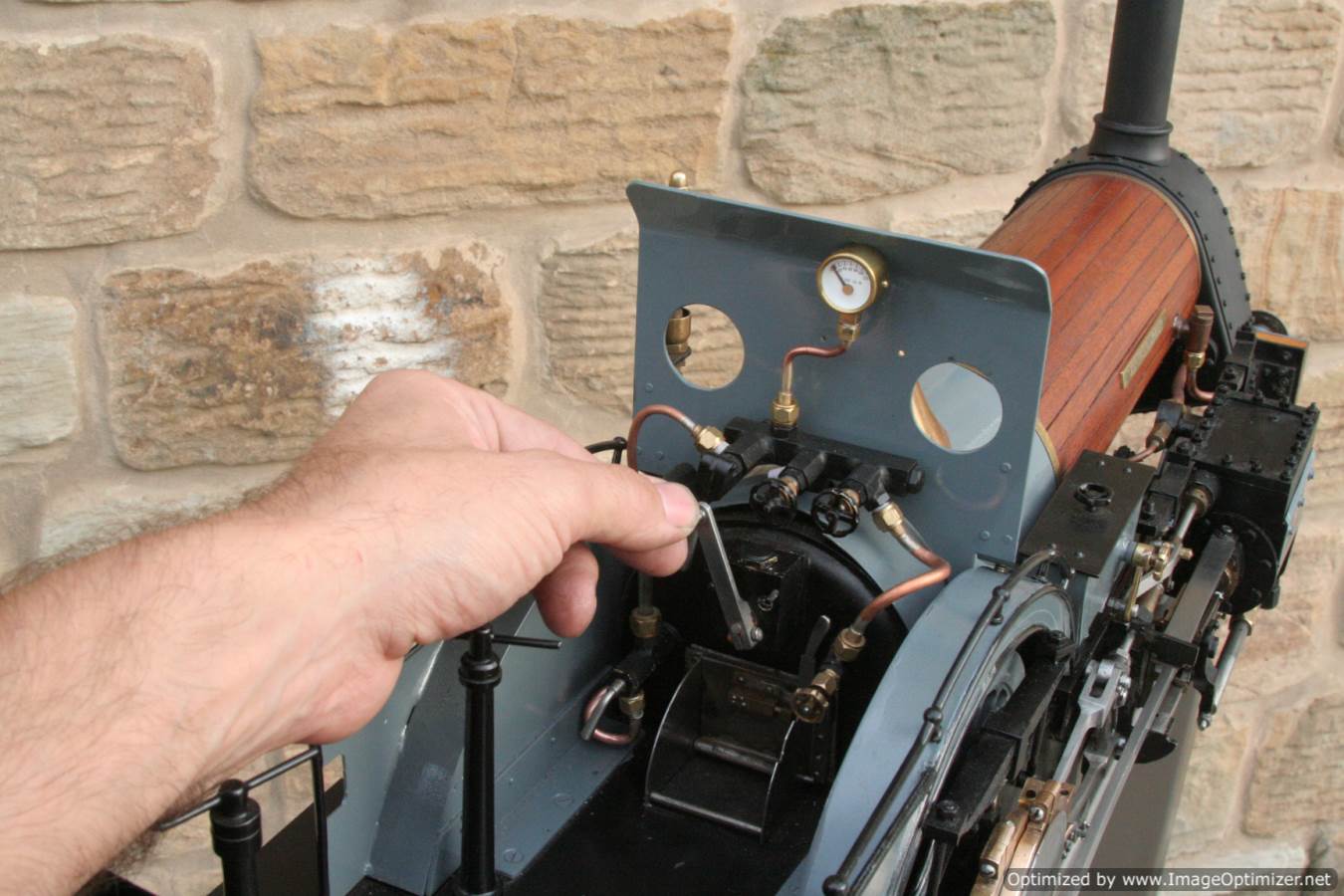 To the model!  This is one that we have had a little hand in.  When it cam in it was missing a few little bits and bobs and in a particularly odeous shade for insipid green!  So we took the decision to give it a quick strip down, re-paint and re-build, as we reckon there's not enough Cramptons out there with a decent finish on em!  For some reason they always seem to be a clumsy green colour, instead of something a little more Victorian and inspiring.  We've been waiting for the right loco to go into grey for some time now, and this one has become it!  So, mechanically she's had brand new pistons and rods, and a general strip down and re-build.  The injector set up is all brand new, and the water pump has been overhauled.  The boiler was tested outside the frames and unclad and comes with a full fresh 4 year hydraulic cert, and a fresh steam cert can be sorted as soon as she leaves.