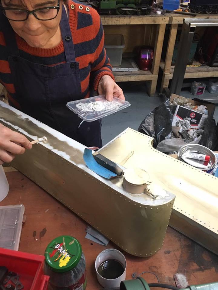 The body was then finished and locally repaired and filled wherever necessary so that a nice finish could be obtained when the paint went on...... this is Jenny, my mum here in the photos, Geoff's daughter working on the tanks.