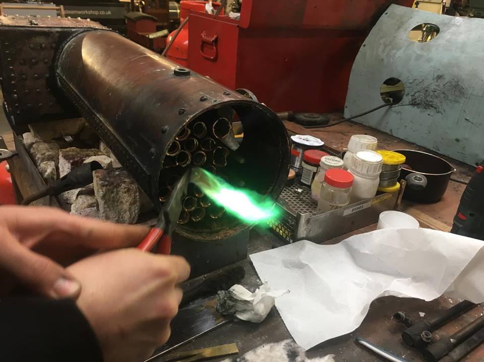 Then we cut and flanged up a new tubeplate (the first photo shows the new tubeplate disk and wooden former). The new tubes were expanded to fit tightly in the firebox end. The whole thing was thoroughly cleaned and then we silver soldered up the lot.