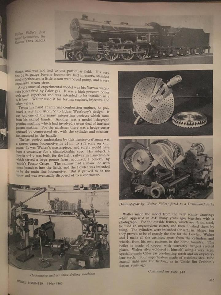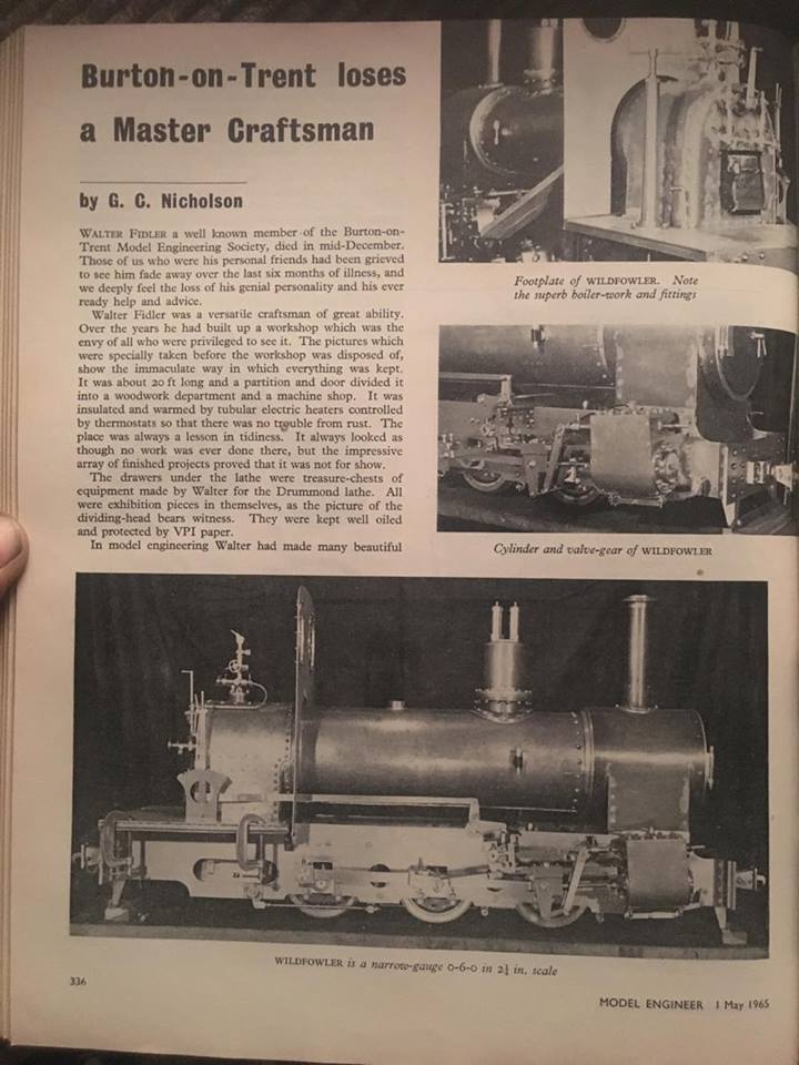 The model was built by Walter Fidler of Burton on Trent MES. Sadly Walter passed away in 1955 leaving the loco substantially finished but missing it's bodywork. Walter was a friend of my granddad Geoff Nicholson, who I remember mentioning him a few times over the years before he too passed away. Until recently a photograph of a rather lovely, but unidentified narrow gauge chassis that had passed into my ownership had been a mystery. The discovery of Granddad's obituary for Walter from the May 1955 Model Engineer, (Walter even making it to the cover) in which the photograph is re-produced has cleared up that chassis mystery nicely, as well as giving a really interesting look at the Fowler just before it was finished. We've included the ME article below,..... it even turns out Granddad helped Walter make the castings for the engine as well! We already had a big soft spot for this engine here at SW because it's just generally a pretty cool looking thing, but finding out these lovely bits of history has certainly added to the feeling of satisfaction at our being able to restore her to her former glory! I'm confident that Granddad and Walter would have approved!