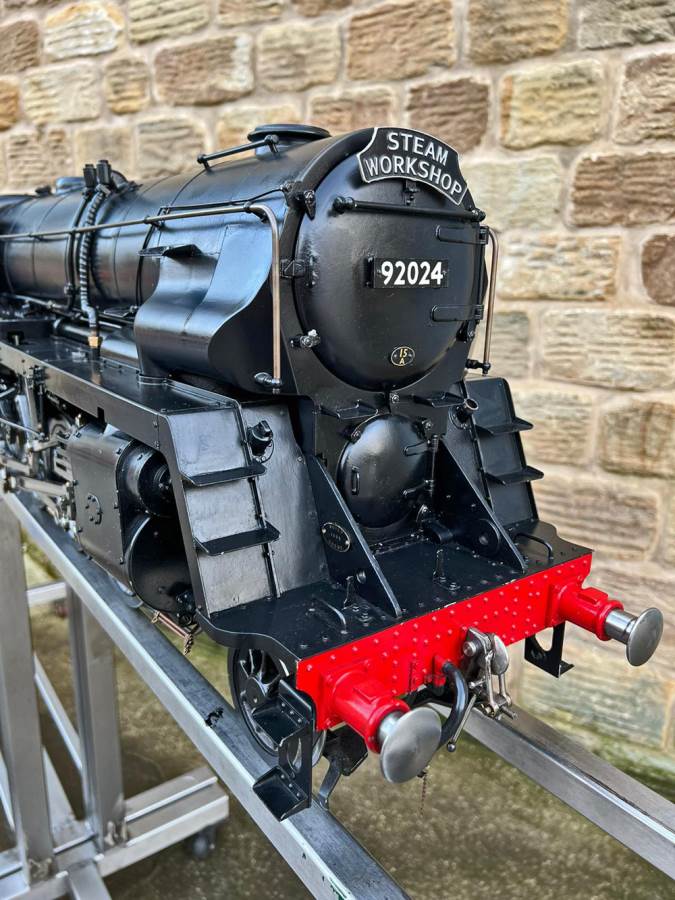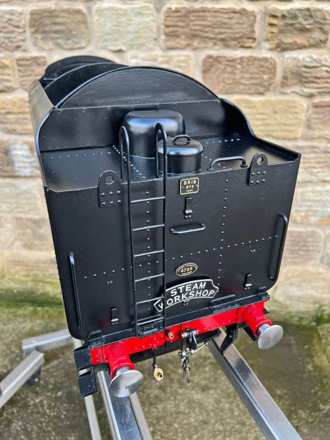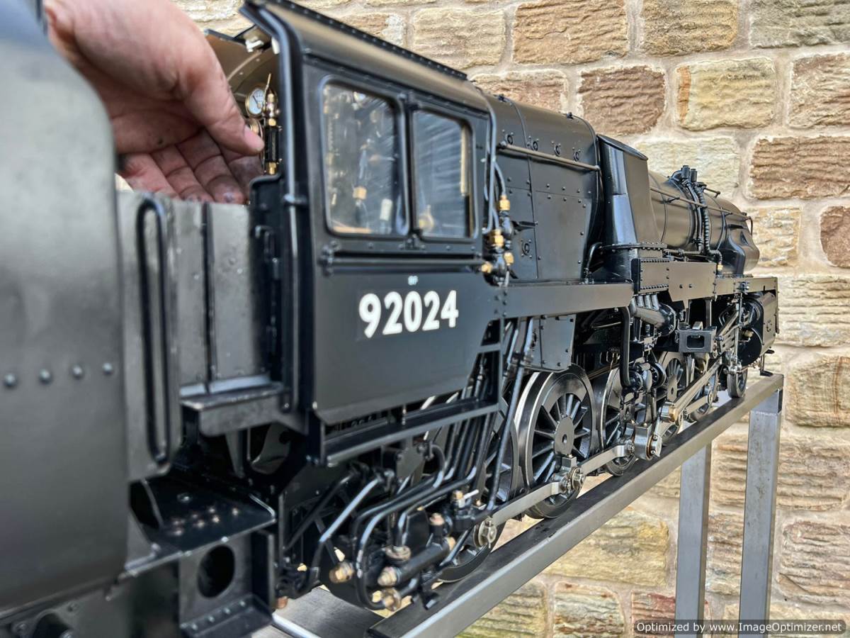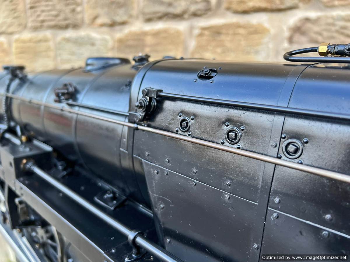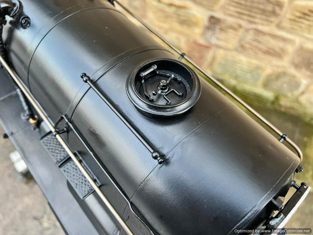 Here we have a rather stunning and certainly unique 5" gauge Franco-Crosti 9F!! For the uninitiated amongst us, The Franco-Crosti boiler system was designed in the 1930s by Attilio Franco and Dr Piero Crosti. It's basically a large secondary boiler, tucked (in this case) underneath the conventional 9F Boiler, and used as a feed water heater. The chimney on top of the smoke box is used for traditionally lighting up, but then has a 'mini' smoke box door inside it, and of course no blast pipe underneath it. The floor of the smoke box is essentially missing at the front, creating a chamber where the hot flue gasses are pulled downwards and returned backwards toward the cab through a second bunch of tubes (behind the smaller smoke box door) through the smaller Crosti boiler, to ultimately be exhausted by the quadruple blast pipes on the side of the rear of the boiler barrel! Or to put it simpler,..... it's really really cool!! Oh,.... and before you ask,..... no it isn't just a dummy! It's a real working model of the Crosti-boiler set up, although as yet this is a brand new and unsteamed model, so we are quite excited to see if it actually works in miniature!
