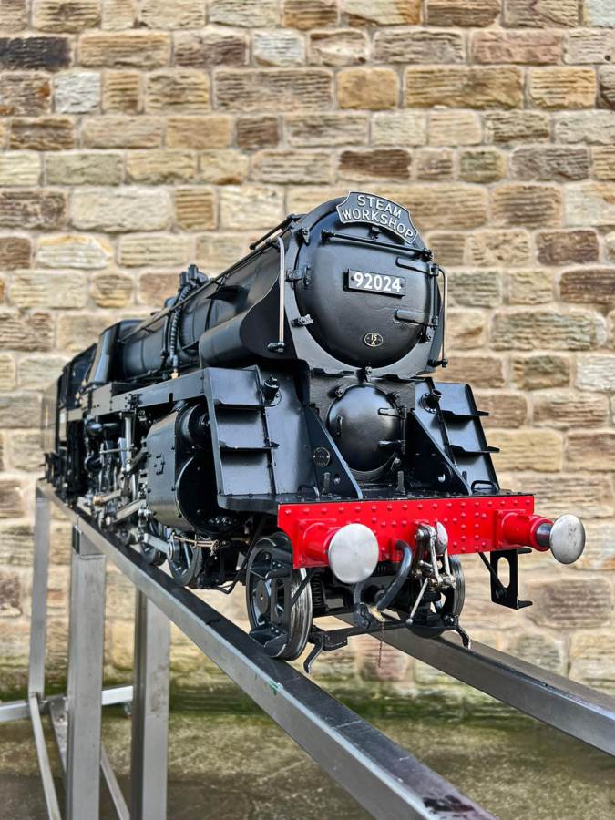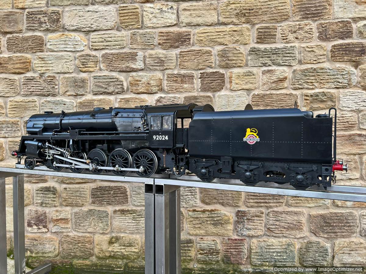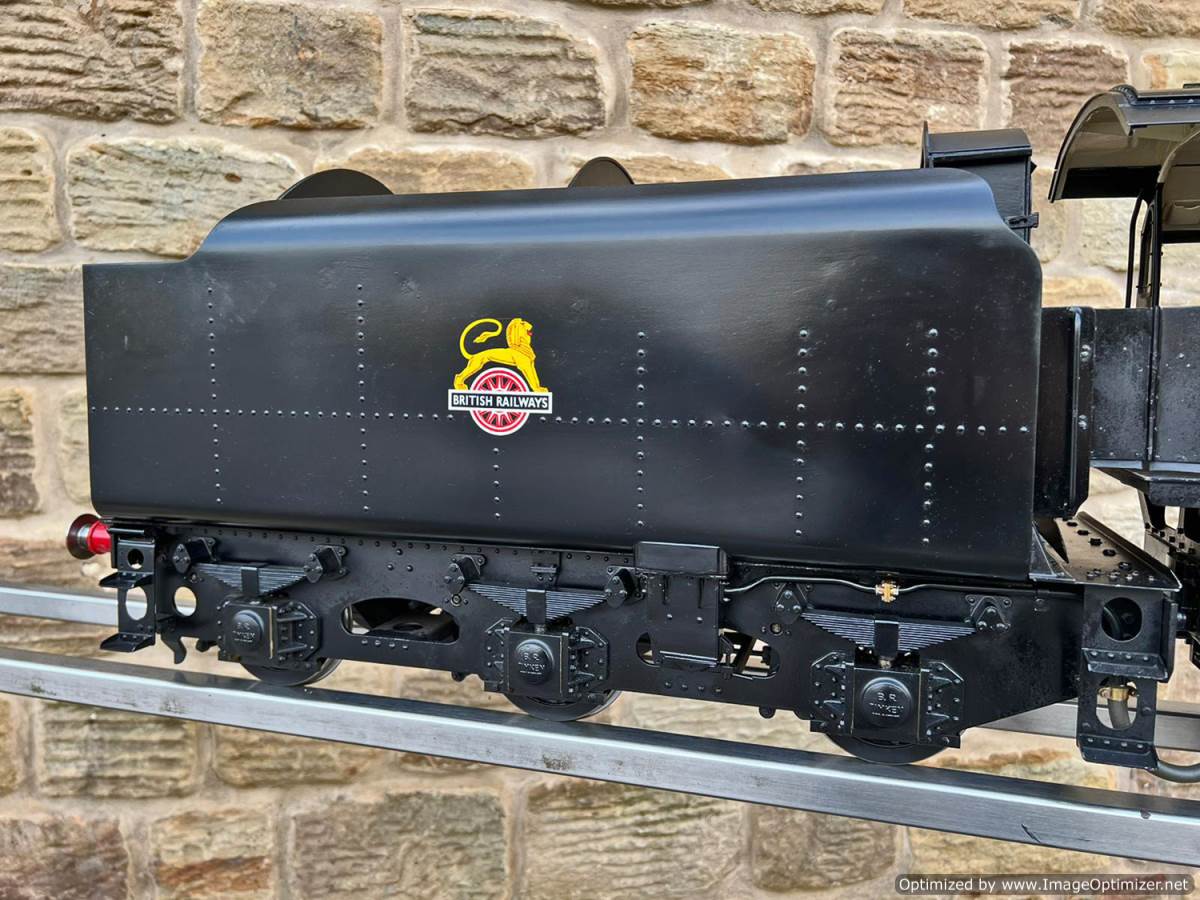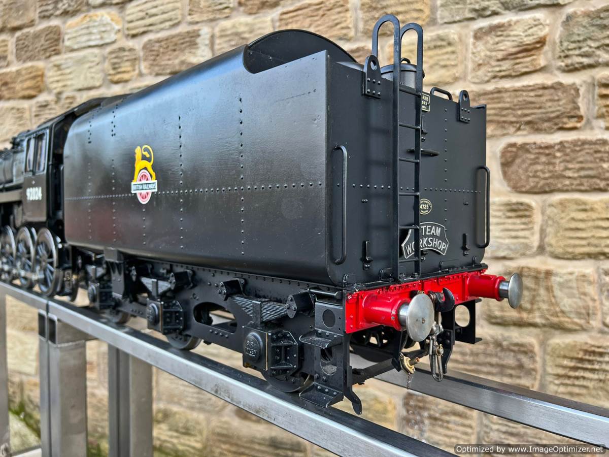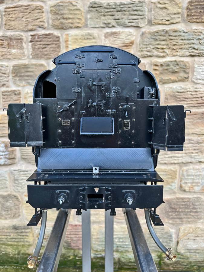 Here we have a rather stunning and certainly unique 5" gauge Franco-Crosti 9F!! For the uninitiated amongst us, The Franco-Crosti boiler system was designed in the 1930s by Attilio Franco and Dr Piero Crosti. It's basically a large secondary boiler, tucked (in this case) underneath the conventional 9F Boiler, and used as a feed water heater. The chimney on top of the smoke box is used for traditionally lighting up, but then has a 'mini' smoke box door inside it, and of course no blast pipe underneath it. The floor of the smoke box is essentially missing at the front, creating a chamber where the hot flue gasses are pulled downwards and returned backwards toward the cab through a second bunch of tubes (behind the smaller smoke box door) through the smaller Crosti boiler, to ultimately be exhausted by the quadruple blast pipes on the side of the rear of the boiler barrel! Or to put it simpler,..... it's really really cool!! Oh,.... and before you ask,..... no it isn't just a dummy! It's a real working model of the Crosti-boiler set up, although as yet this is a brand new and unsteamed model, so we are quite excited to see if it actually works in miniature!