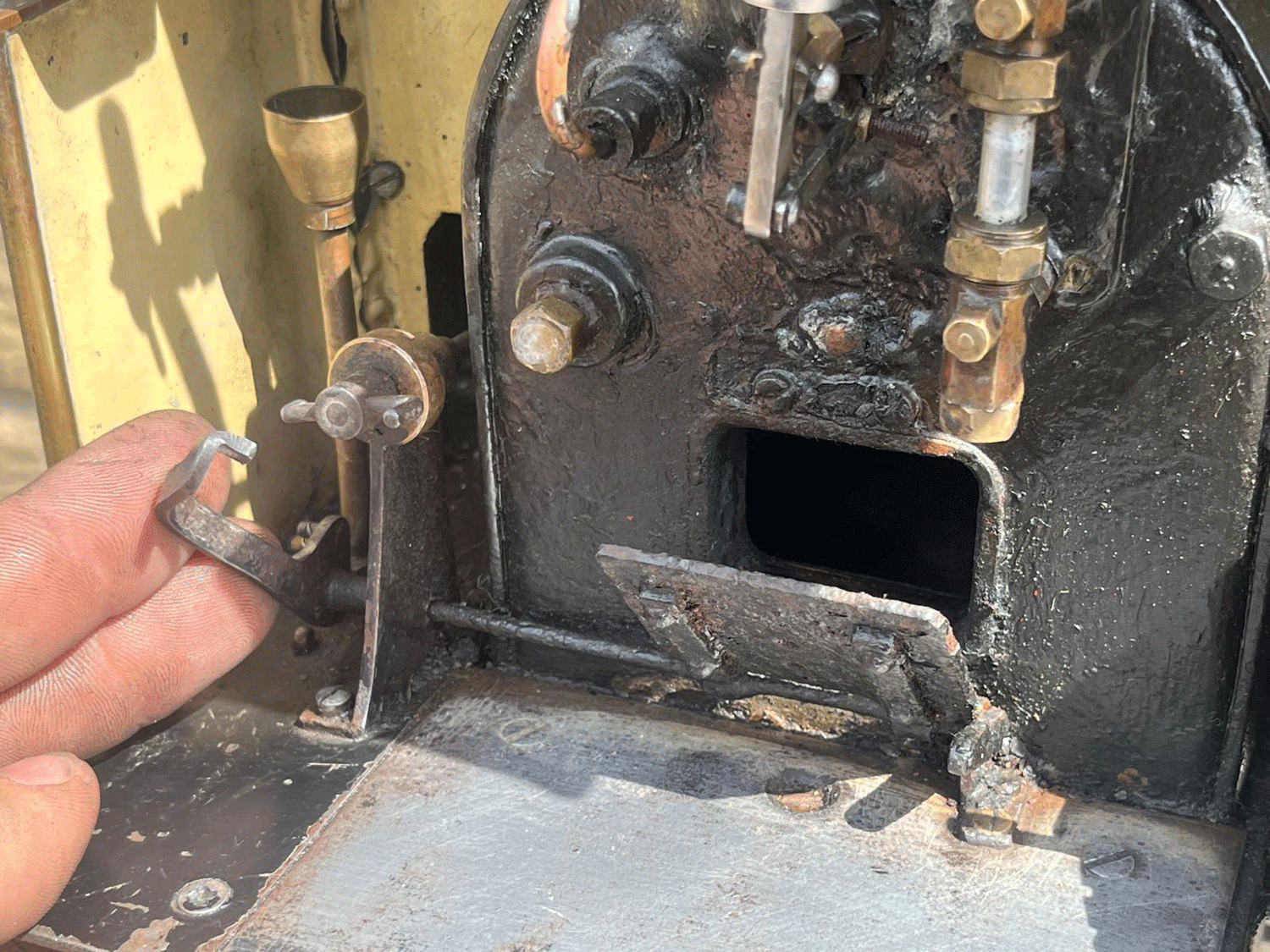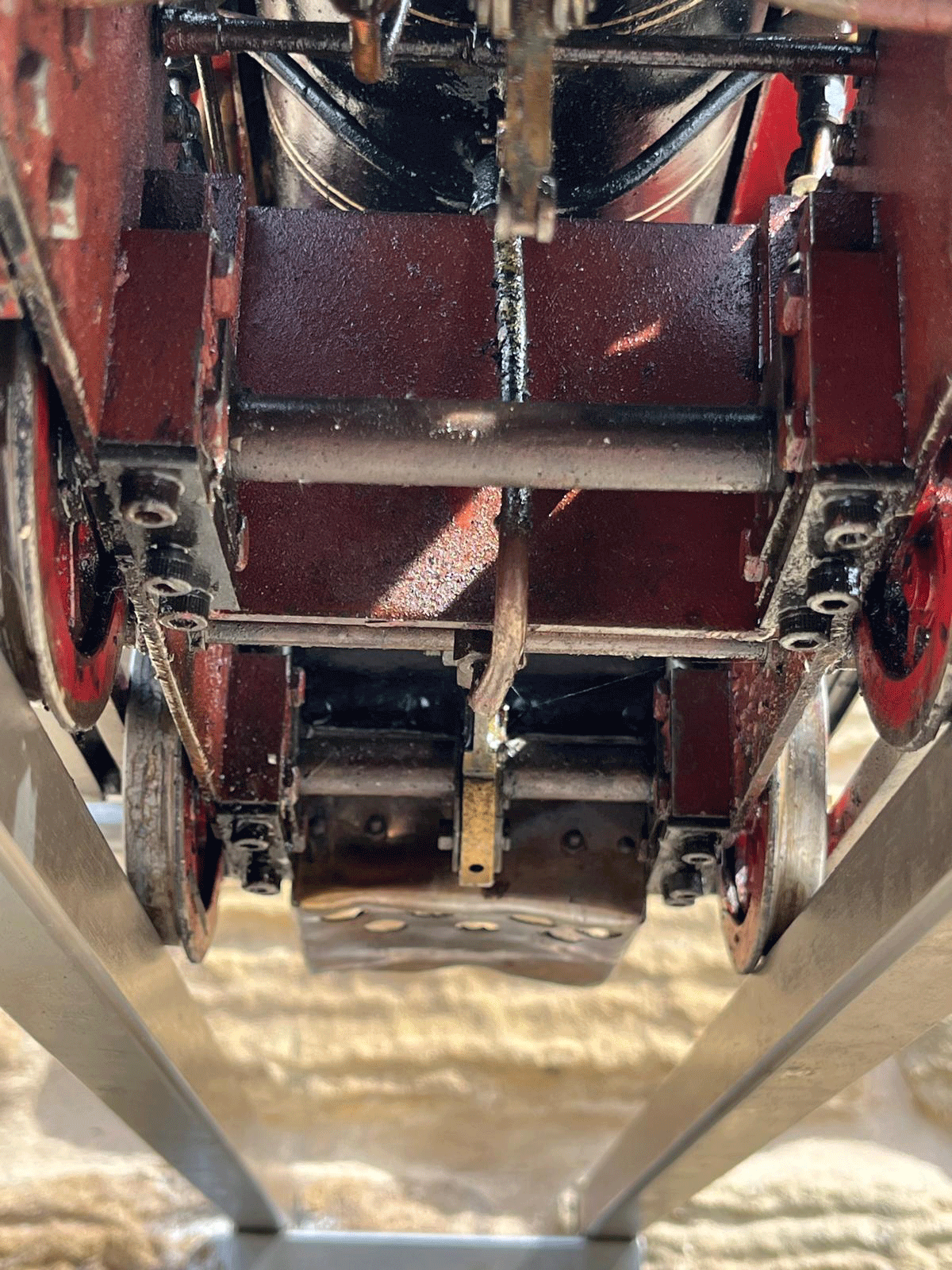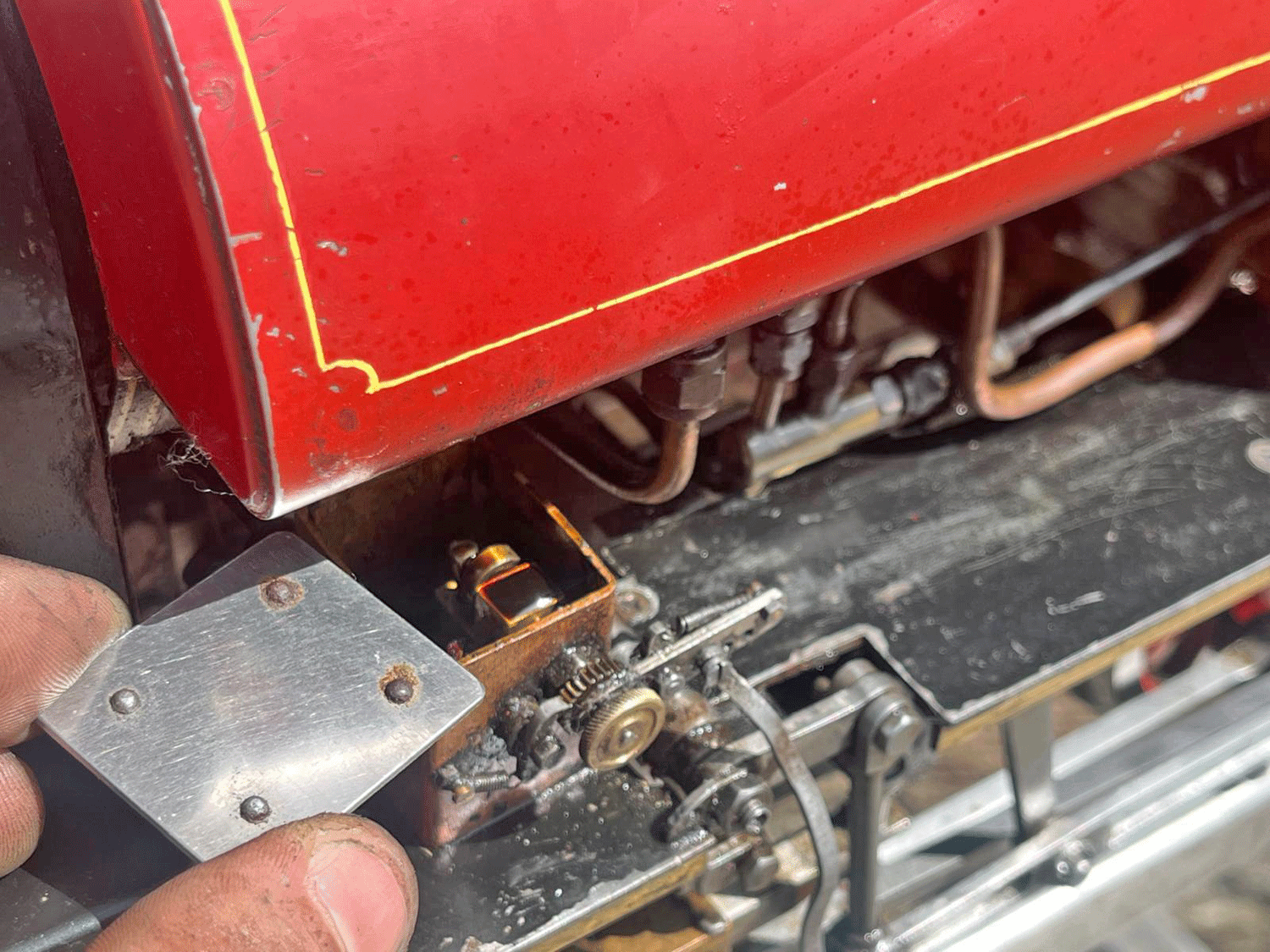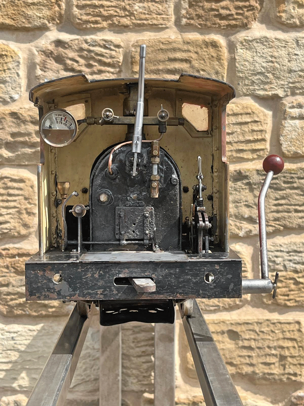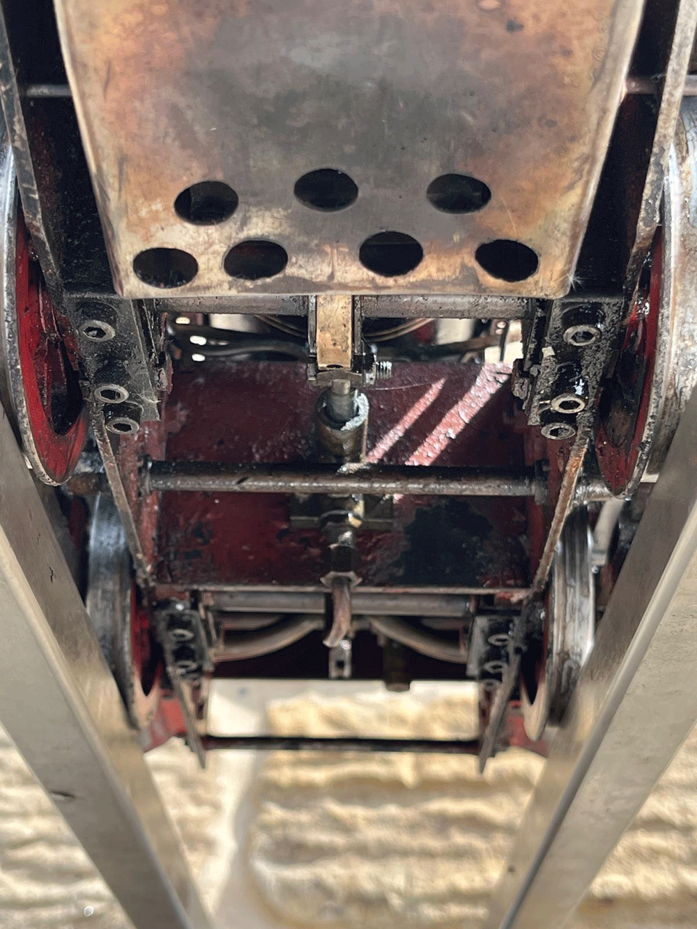 The silver soldered copper boiler can of course come with fresh twice working pressure shell tests as well as a fresh steam test so that you know everything is working and sound. As you can see, some of the plumbing has been removed in the photos, but we will remake all of that, so the loco will have an axle pump with footplate mounted bypass valve as well as an injector fitted, which we can route to feed from either the saddle tank or a driving truck, to your preference. Lubrication is mechanical and on the running board.