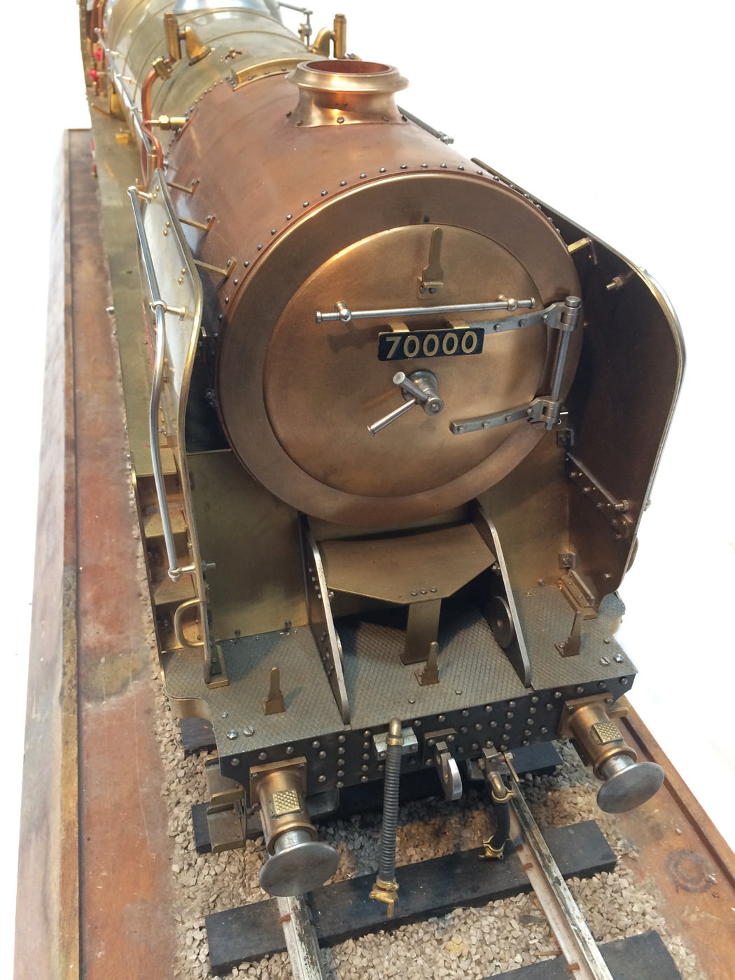 Well here we have a very well made, brand new and as yet unsteamed 5" Gauge BR Britannia. We had this one come through around a year ago, and she's just come back into the workshop as a part exchange against the finished and painted Britt. Apart from finishing the tiny link piece between the regulator reach rod and the regulator valve in the smoke box she's essentially complete and ready for a fire (although there may be something small that we haven't spotted). Obviously there are also a few little detail bits included that it would be great to finish off, tender windows, sanders, that sort of thing, but this really is a very well engineered, machined and detailed model of the ever popular Britt. The boiler is a brand new professional one with it's original hydraulic certs.