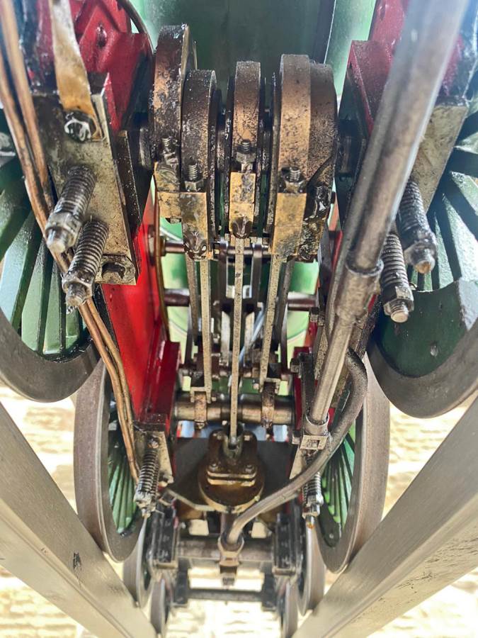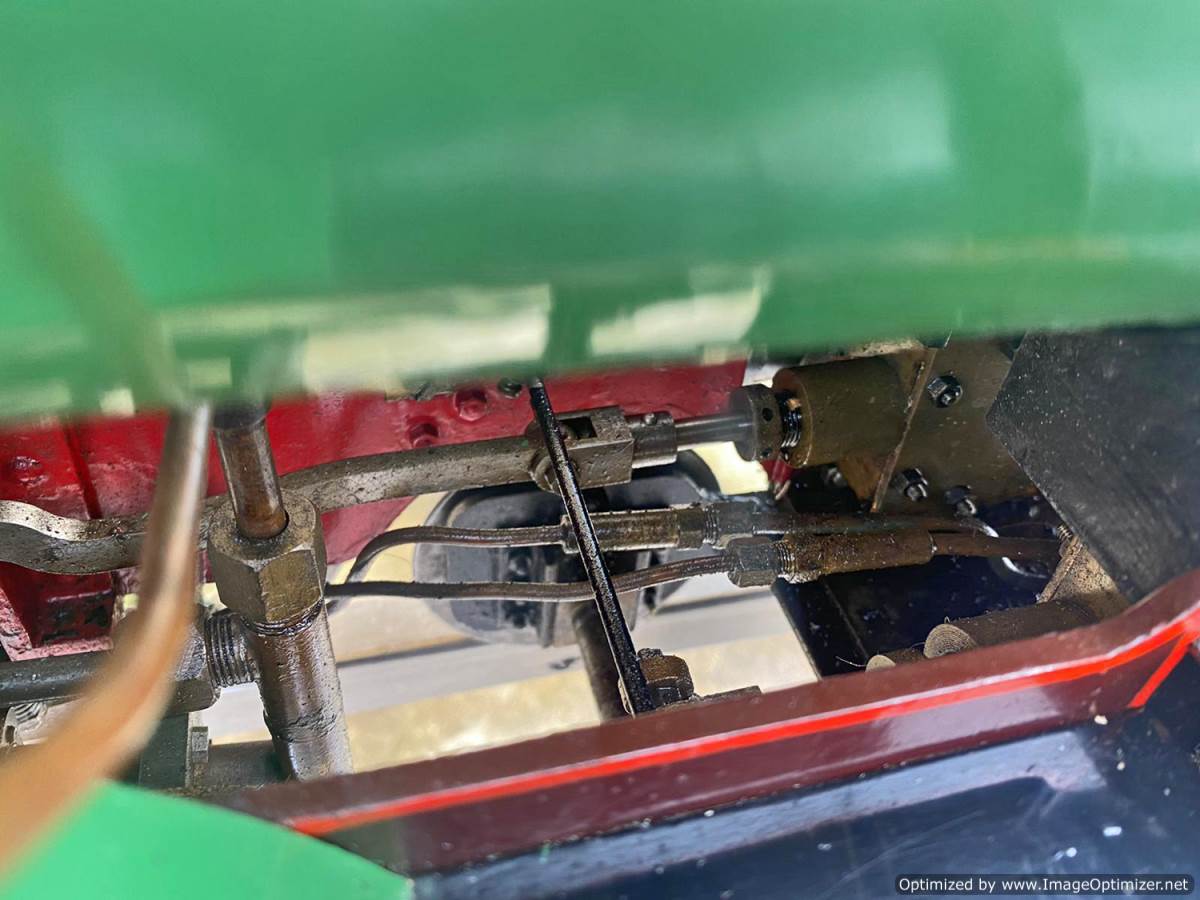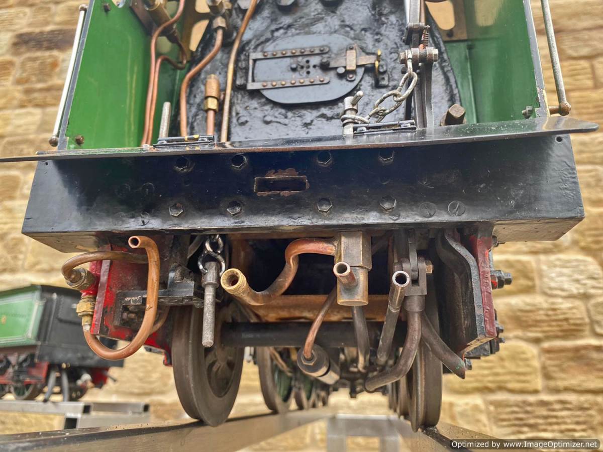Fitted with an injector, an axle pump with footplate mounted bypass valve as well as the hand pump in the tender. Lubrication is displacement and tucked away under the cab footplate, and it feeds through a sight feed on the footplate so you can see exactly how much oil is being used.