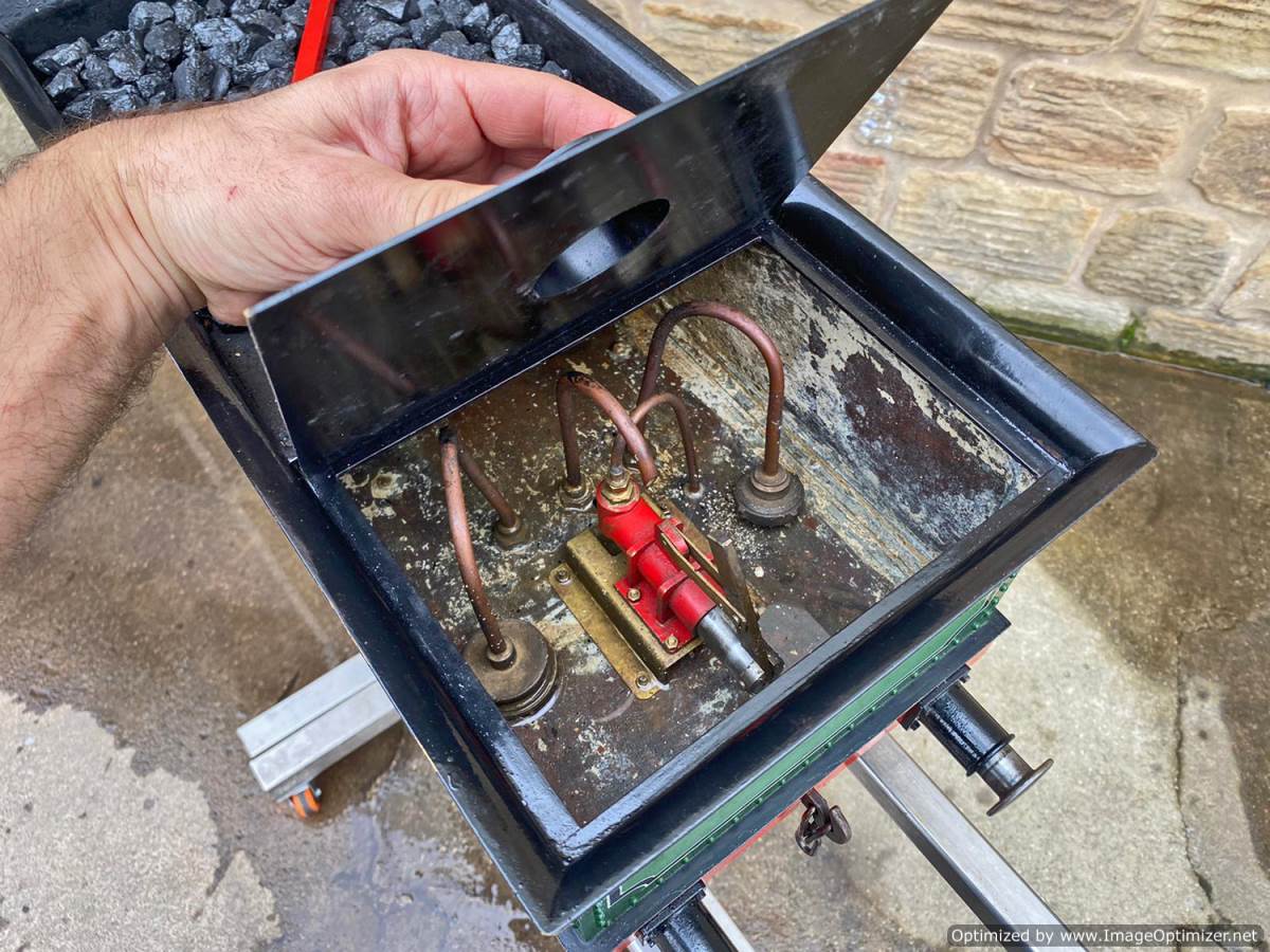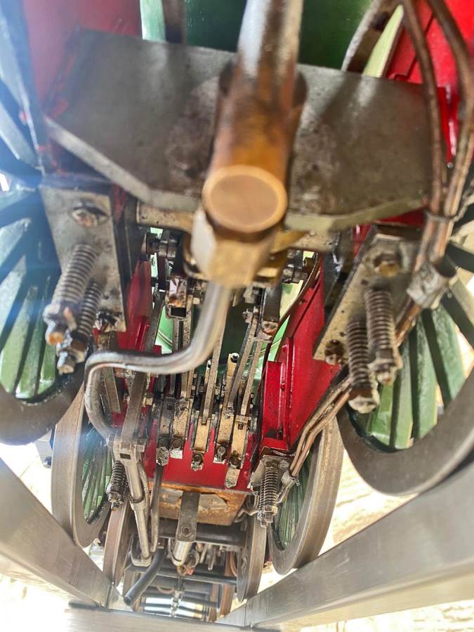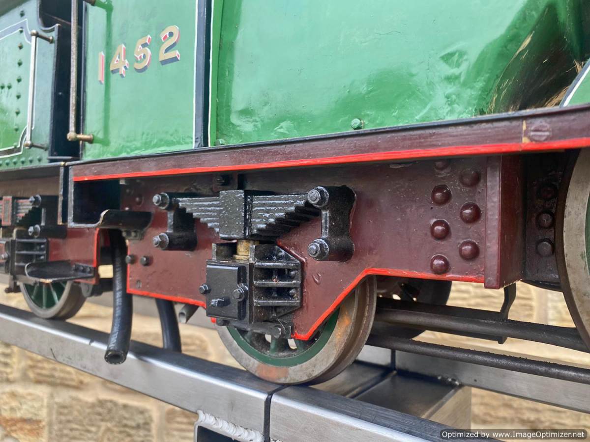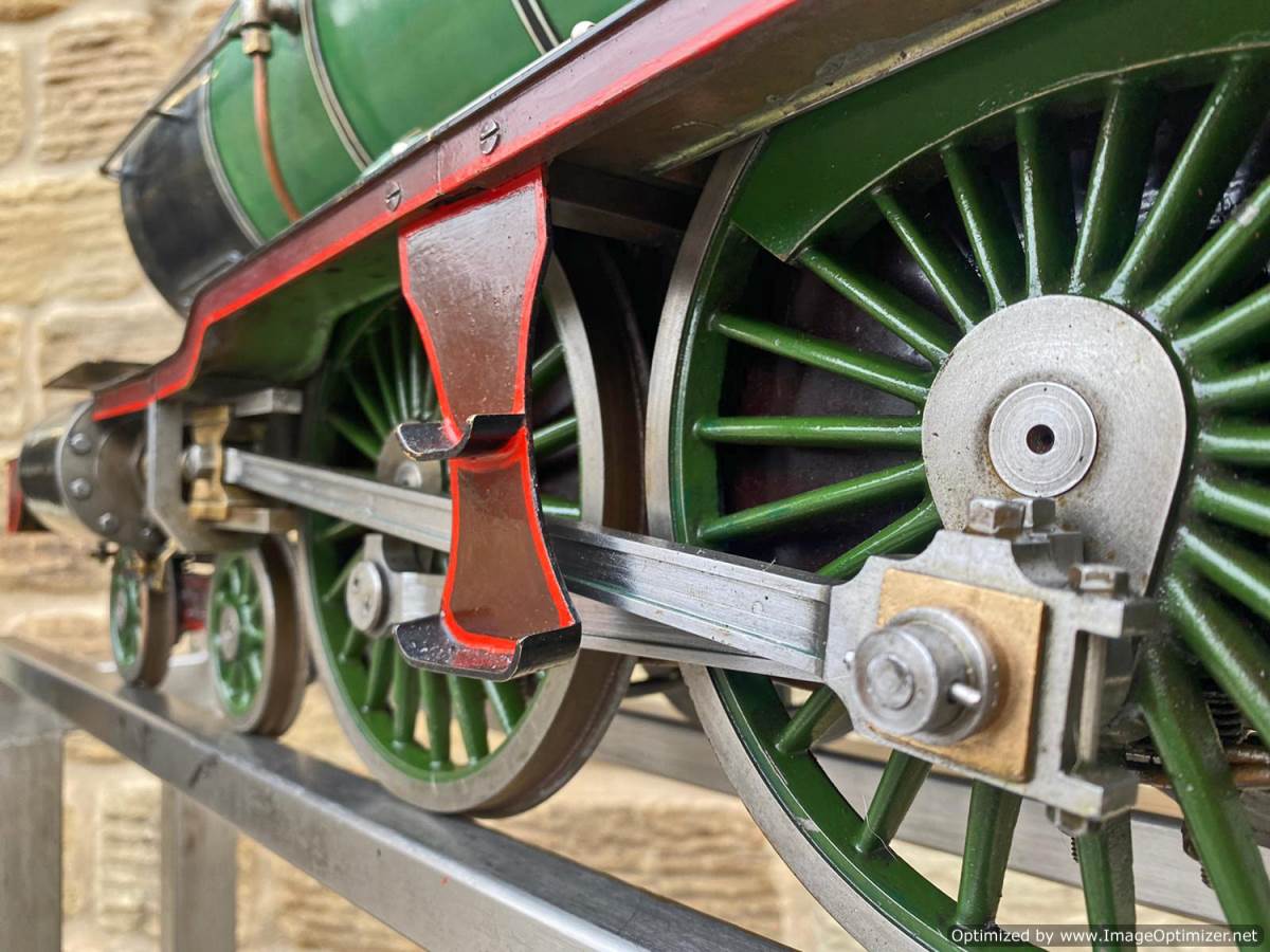 Fitted with an injector, an axle pump with footplate mounted bypass valve as well as the hand pump in the tender. Lubrication is displacement and tucked away under the cab footplate, and it feeds through a sight feed on the footplate so you can see exactly how much oil is being used.