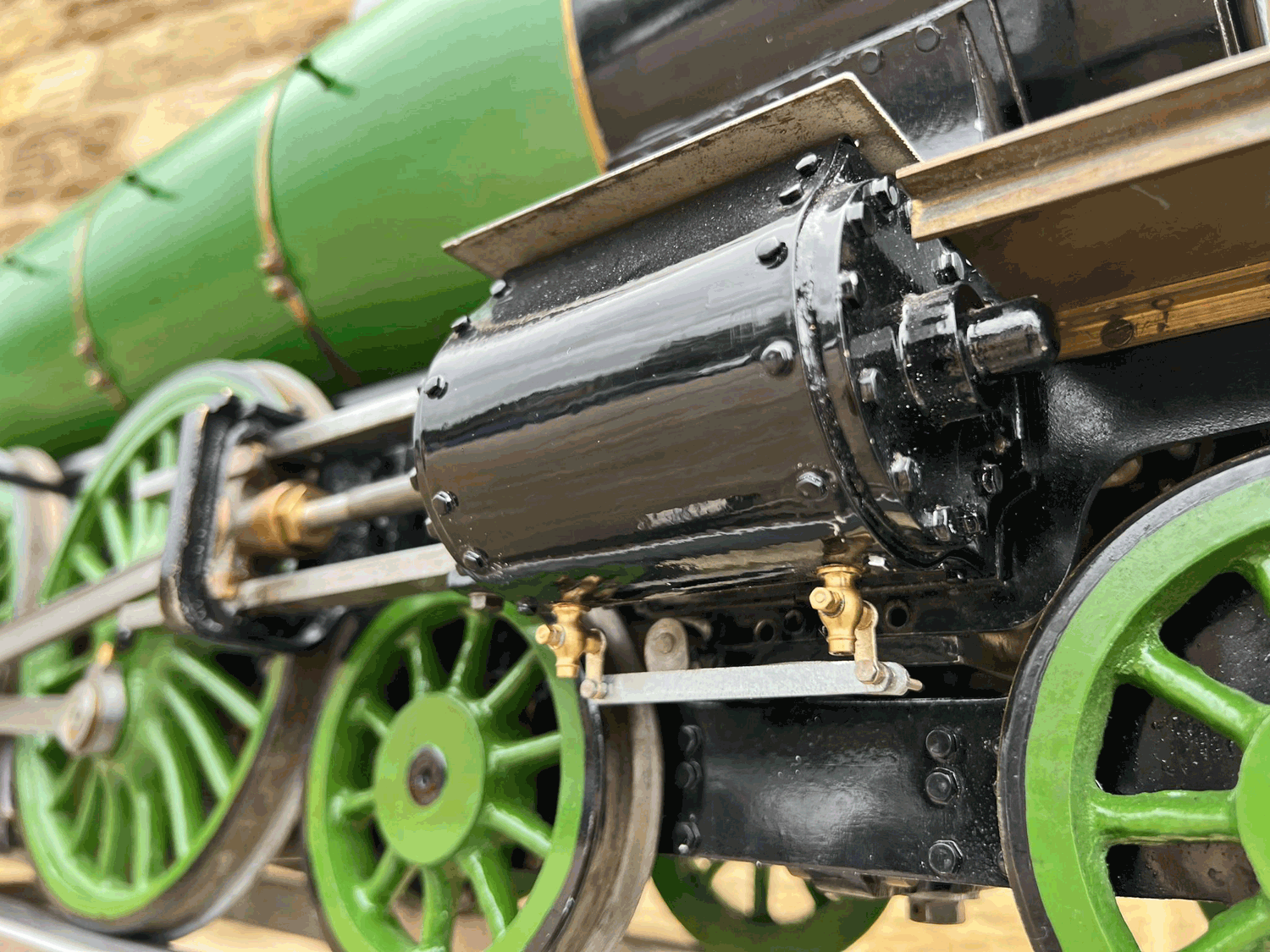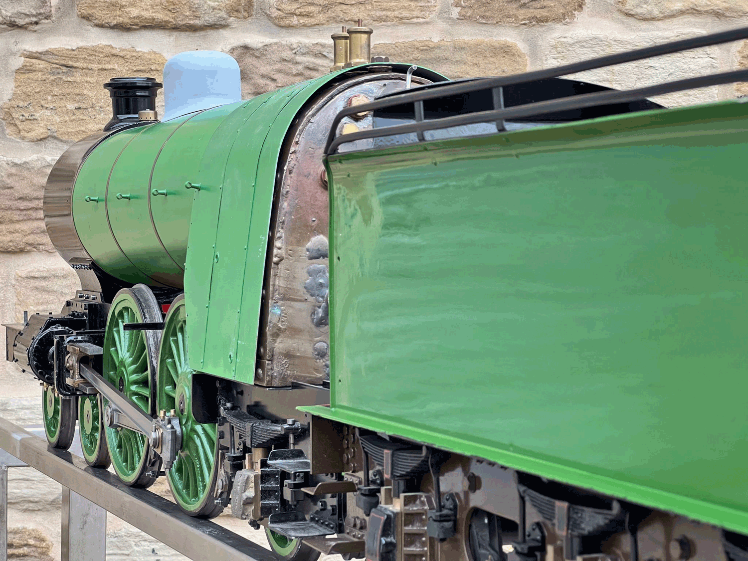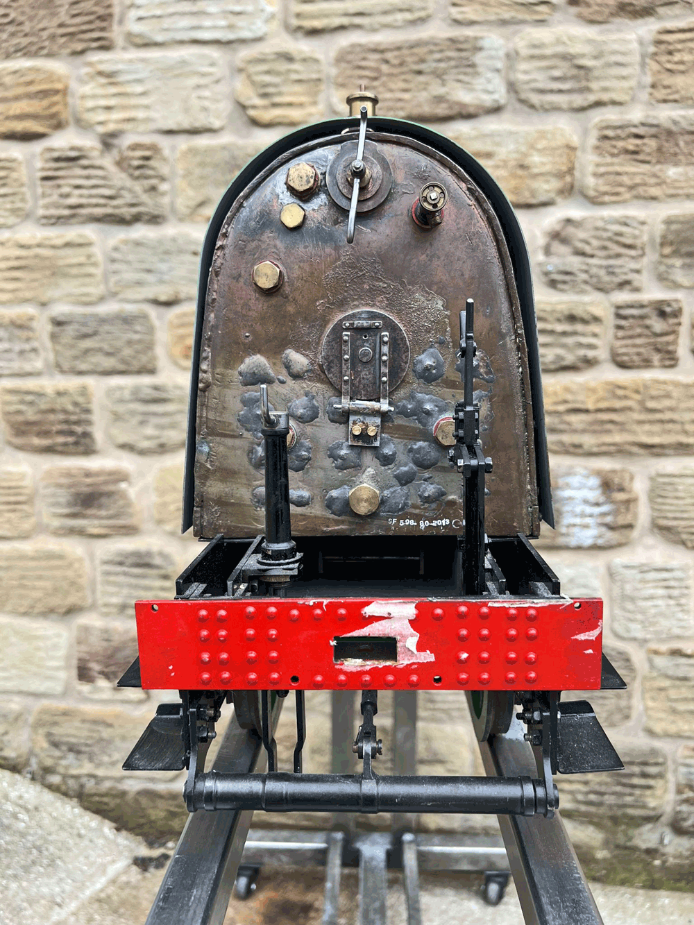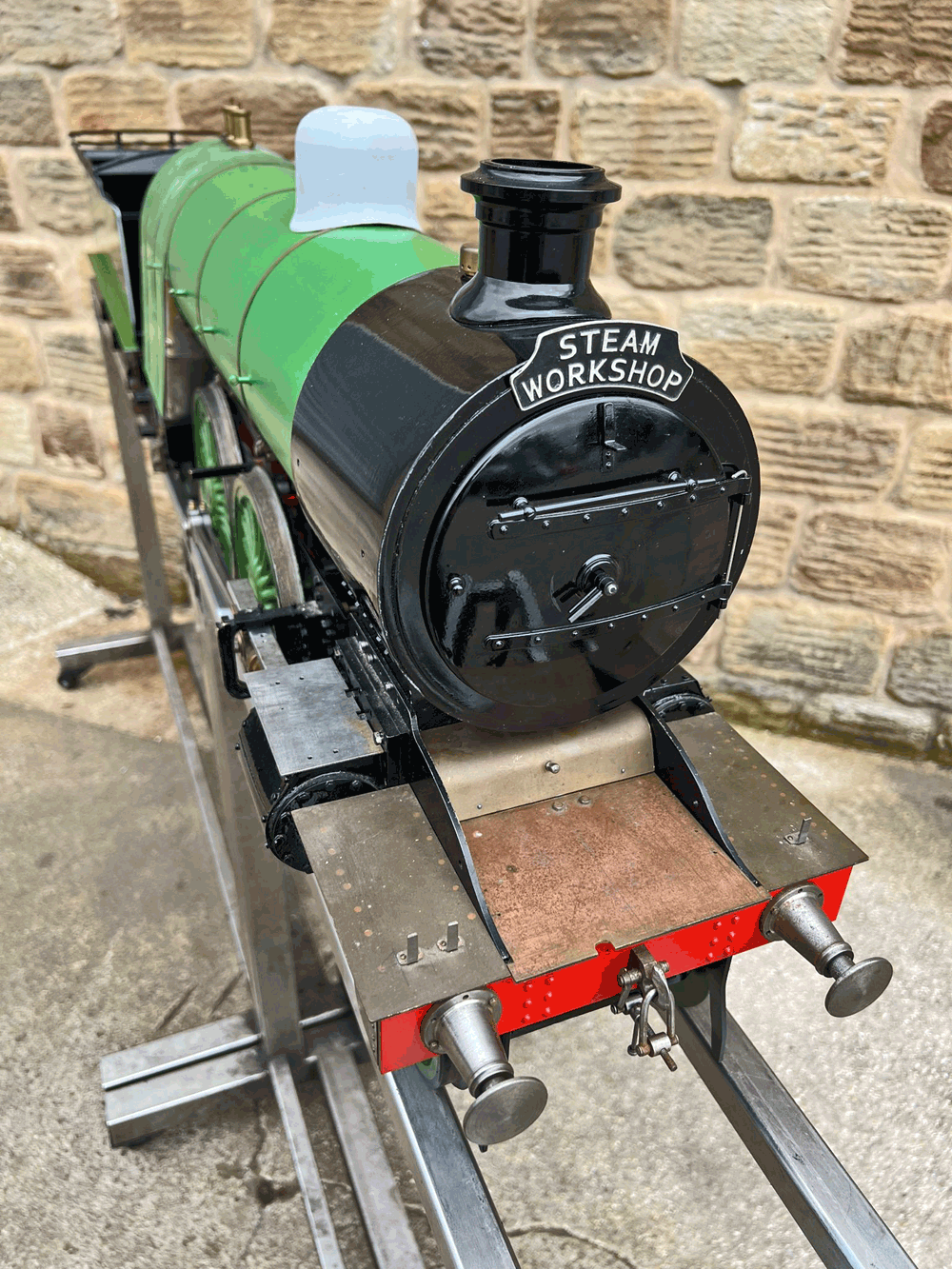 Here we have a 5" gauge GNR Atlantic. Again, we haven't seen many of these come up over the last 14 years, this being only the second, and the other one was presented as an LBSC Marsh Atlantic rather than an Ivatt as in this case. The silver soldered copper boiler, brand new, un-steamed and comes with it's initial club shell test certificate so it's hydraulically tight, but upon examination there's clearly a collapsed superheater tube, and the superheater has one flue blanked off. That aside, this looks to be ostensibly a nearly finished loco with what appears to be just some cosmetics and a bit of plumbing to complete.