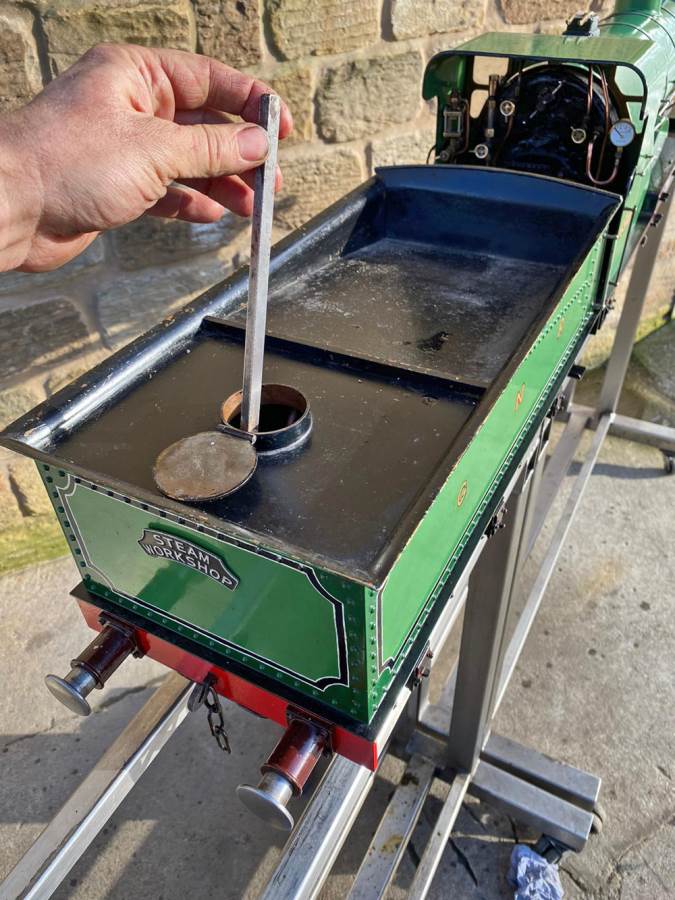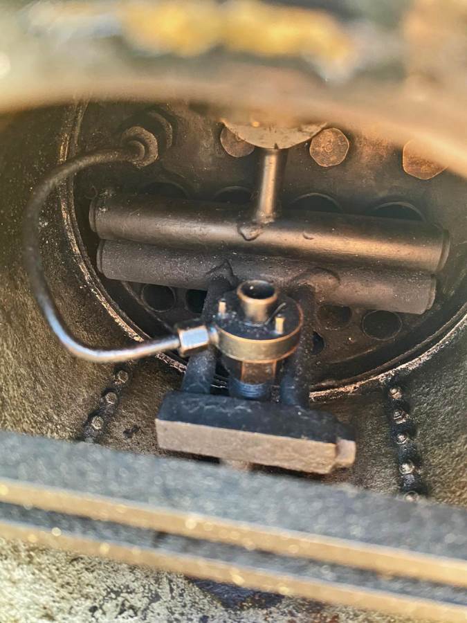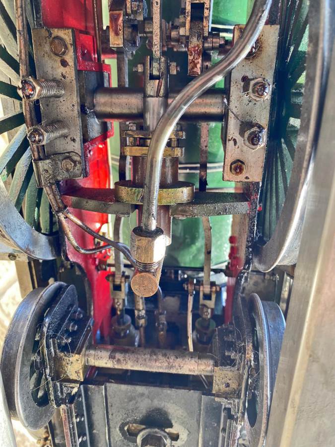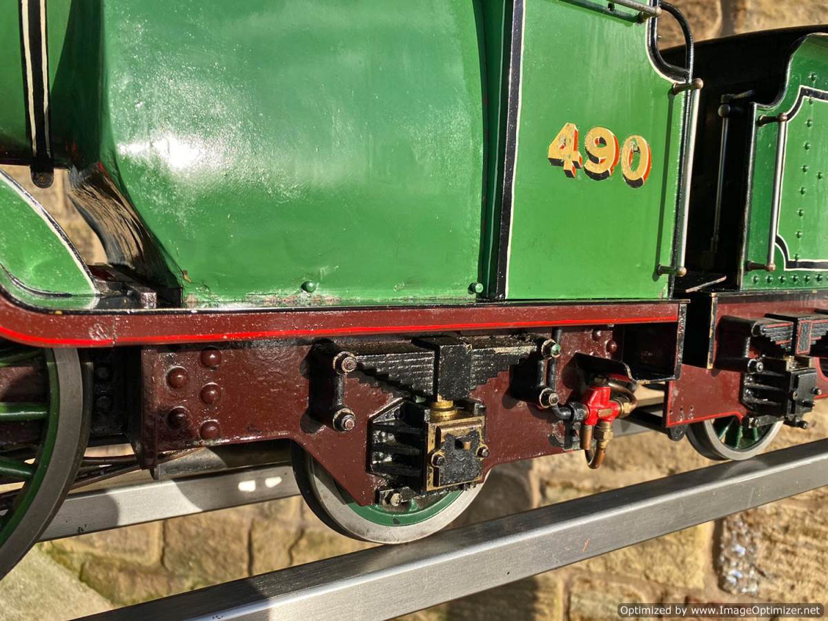 Fitted with an injector, an axle pump with footplate mounted bypass valve as well as the hand pump in the tender. Lubrication is displacement and tucked away under the cab footplate, and it feeds through a sight feed on the footplate so you can see exactly how much oil is being used.
