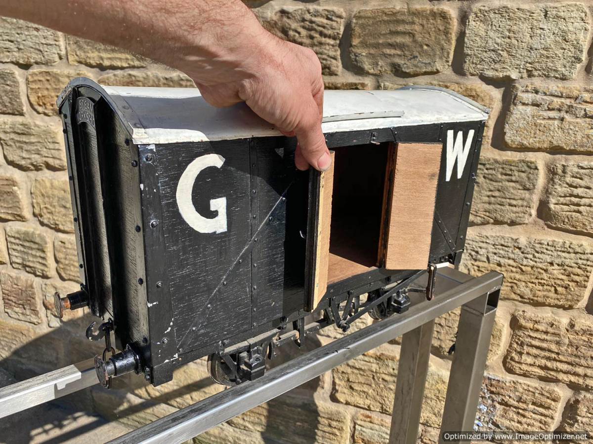 Here we have a 5" gauge Great Western parcels van. A little on the chunky side detail wise, so not quite up to the super detail level of a Doug Hewson or Dave Noble scale wagon, but certainly a nice little thing to have in your rake. As you can see the doors open up and there is a nice bit of detail in the chassis too. Steel wheels so an ideal basis for a load bearing driving truck if you fancy a little tweaking!
