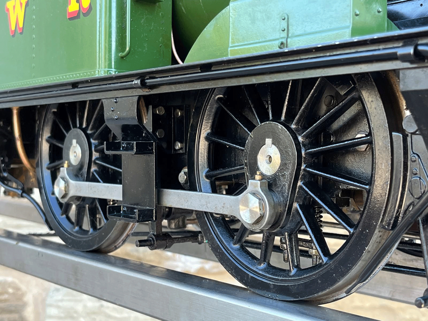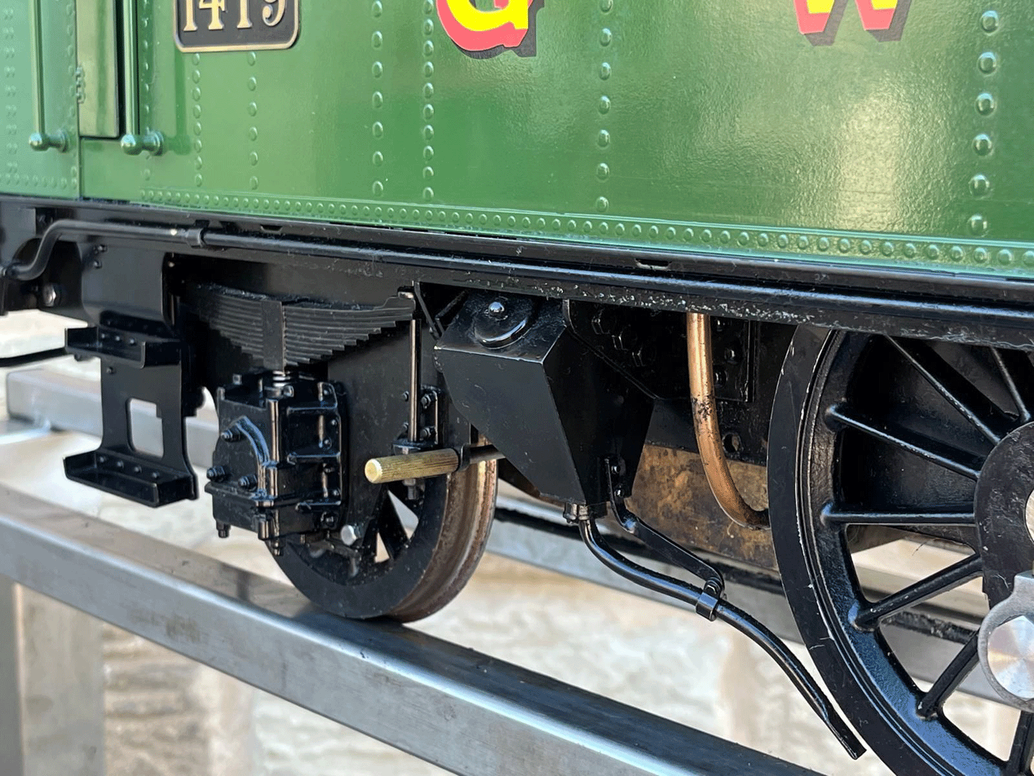 As we've come to expect from Kingscale, this is a very pretty looking model with loads of nice detailing, the boiler is professionally silver soldered copper and very neatly done, and the loco has only been steamed a couple of times so it's more or less as new. Everything essentially works, so you can just get straight out on track and it'll all do what it was designed to do,..... however,.... (and we know you could sense the 'but' coming),.... the machining tolerances, the general fit of the bushes and valve gear, and indeed certain of the material choices on the bottom end are not quite the same as you'd expect from a new model built by a traditional model engineer. That all said, the smaller, 2 cylinder slide valve models Kingscale produces lend themselves to their manufacture processes more than the larger, more complex piston valve prototypes. A slide valve can accommodate a broader machining tolerance and the smaller valve gear lengths, smaller wheel diameters, lower forces and indeed a general increased simplicity all play to the manufacturer's strengths and result in a great value little model.