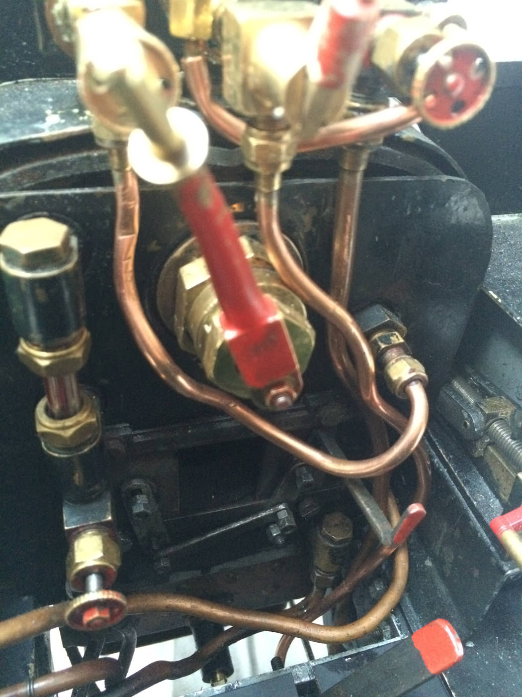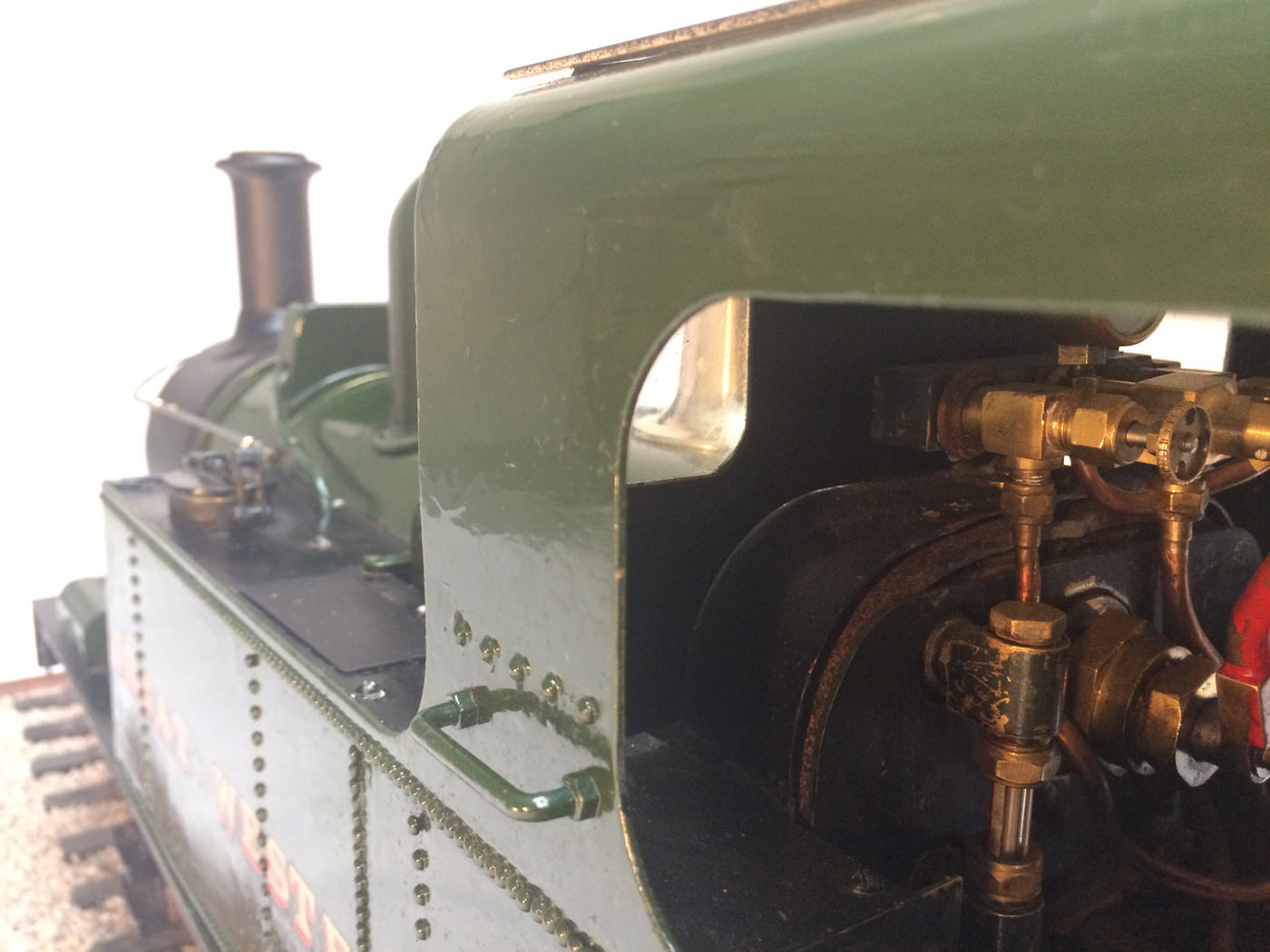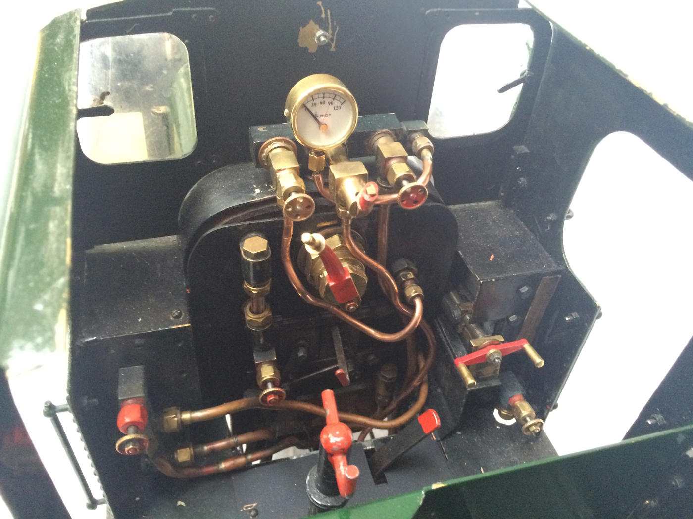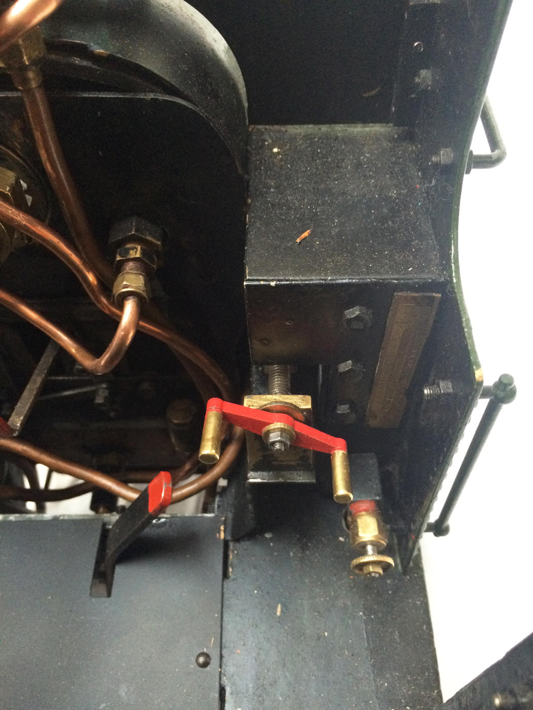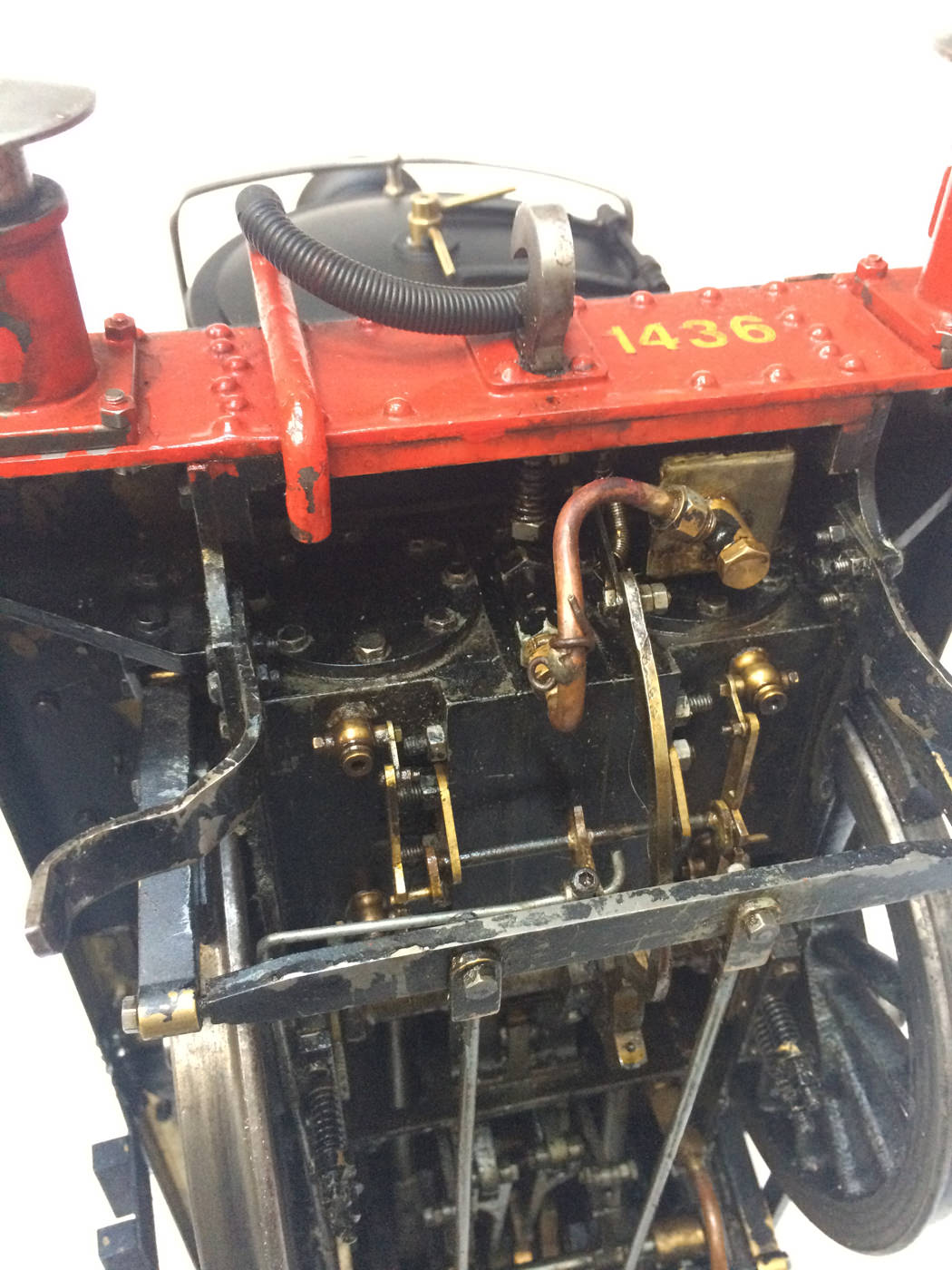 It's been fitted with a decent mechanical lubricator under the front footplate rather than the standard Modelworks one in the coal bunker! Happily the valve gear shows the tell tale signs of having been 'tweaked' to make it run properly as well. There is an injector fitted, as well as the mechanical crosshead pump between the frames (bypass valve on the footplate), and then there is the ubiquitous hand pump hidden in the right hand tank. Draincocks are proper jobs, (the modelworks ones having been ditched), and control is again from the footplate.