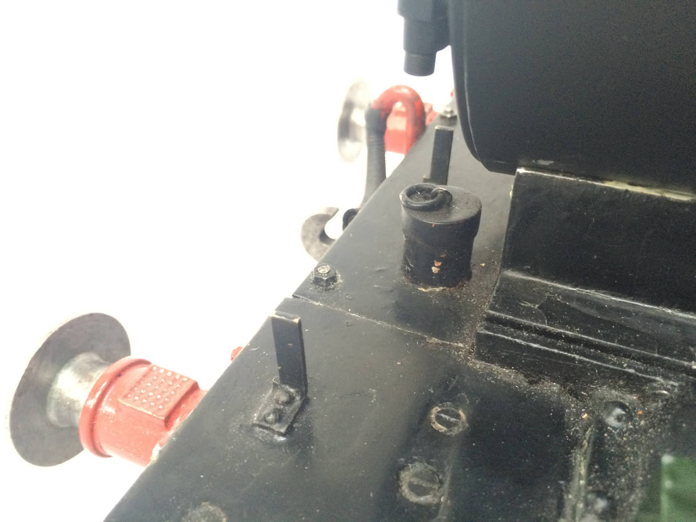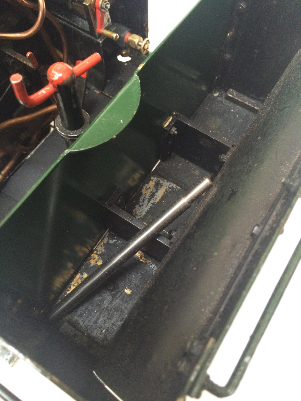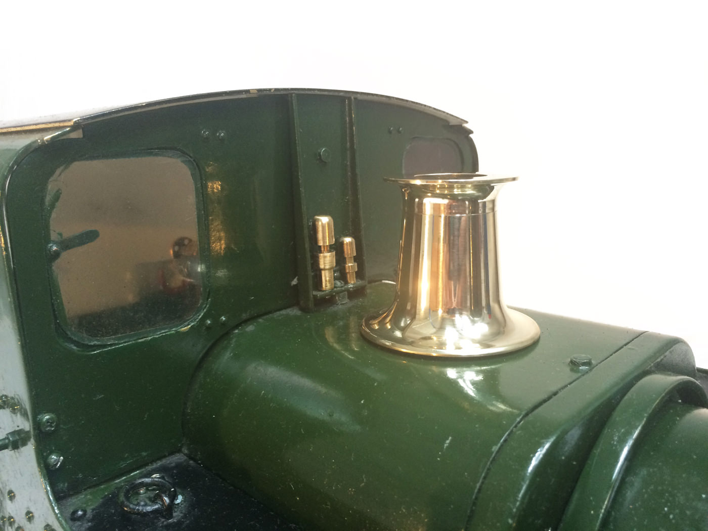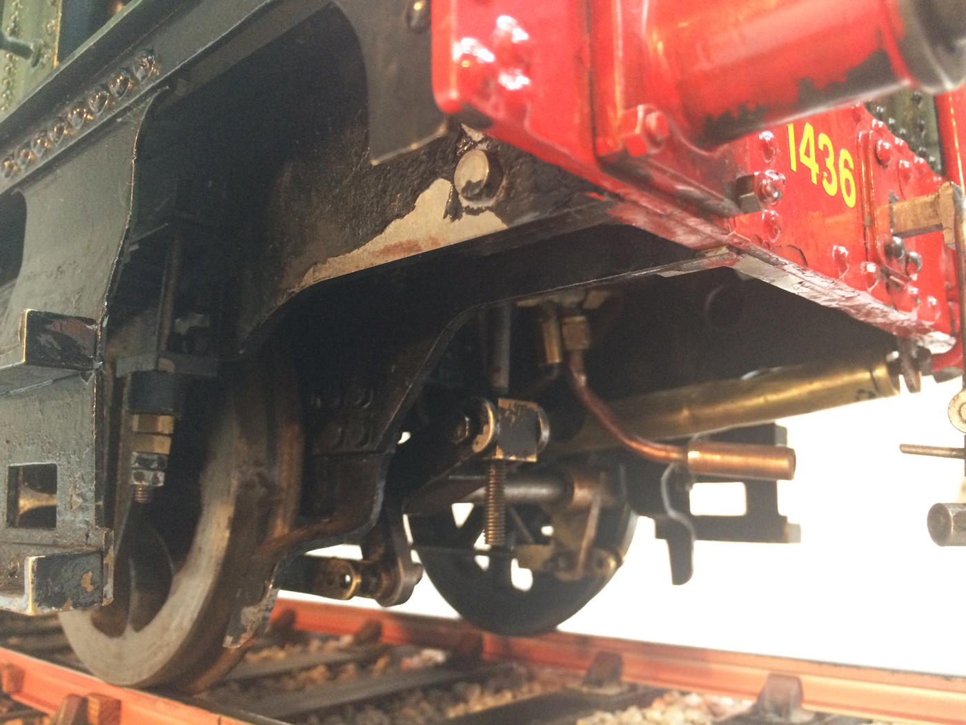 It's been fitted with a decent mechanical lubricator under the front footplate rather than the standard Modelworks one in the coal bunker! Happily the valve gear shows the tell tale signs of having been 'tweaked' to make it run properly as well. There is an injector fitted, as well as the mechanical crosshead pump between the frames (bypass valve on the footplate), and then there is the ubiquitous hand pump hidden in the right hand tank. Draincocks are proper jobs, (the modelworks ones having been ditched), and control is again from the footplate.