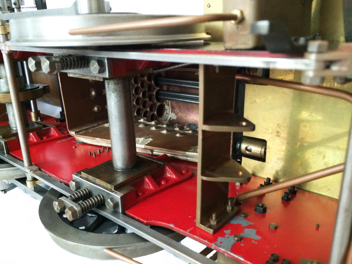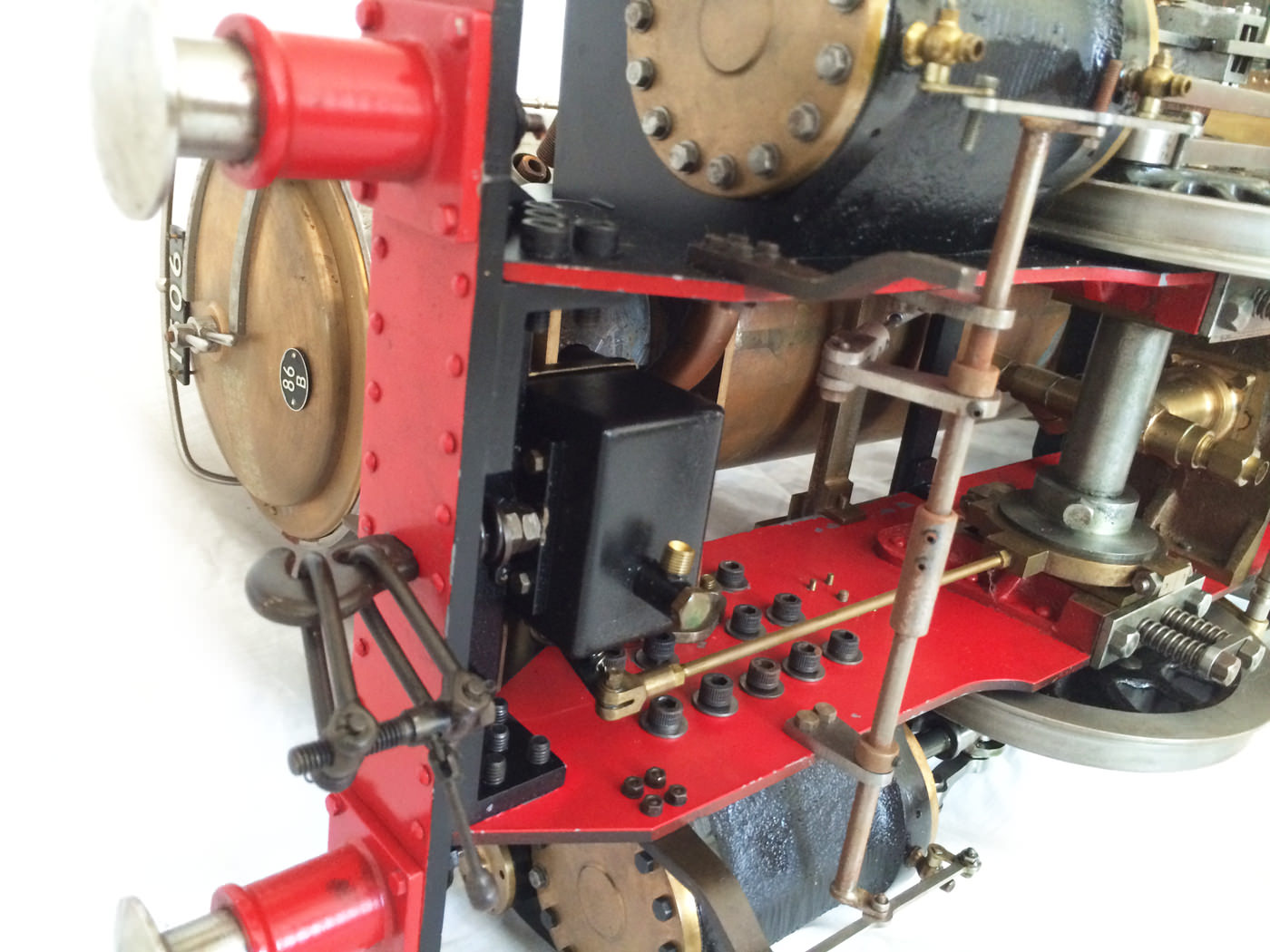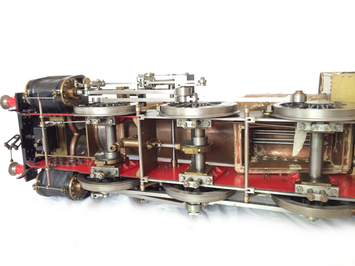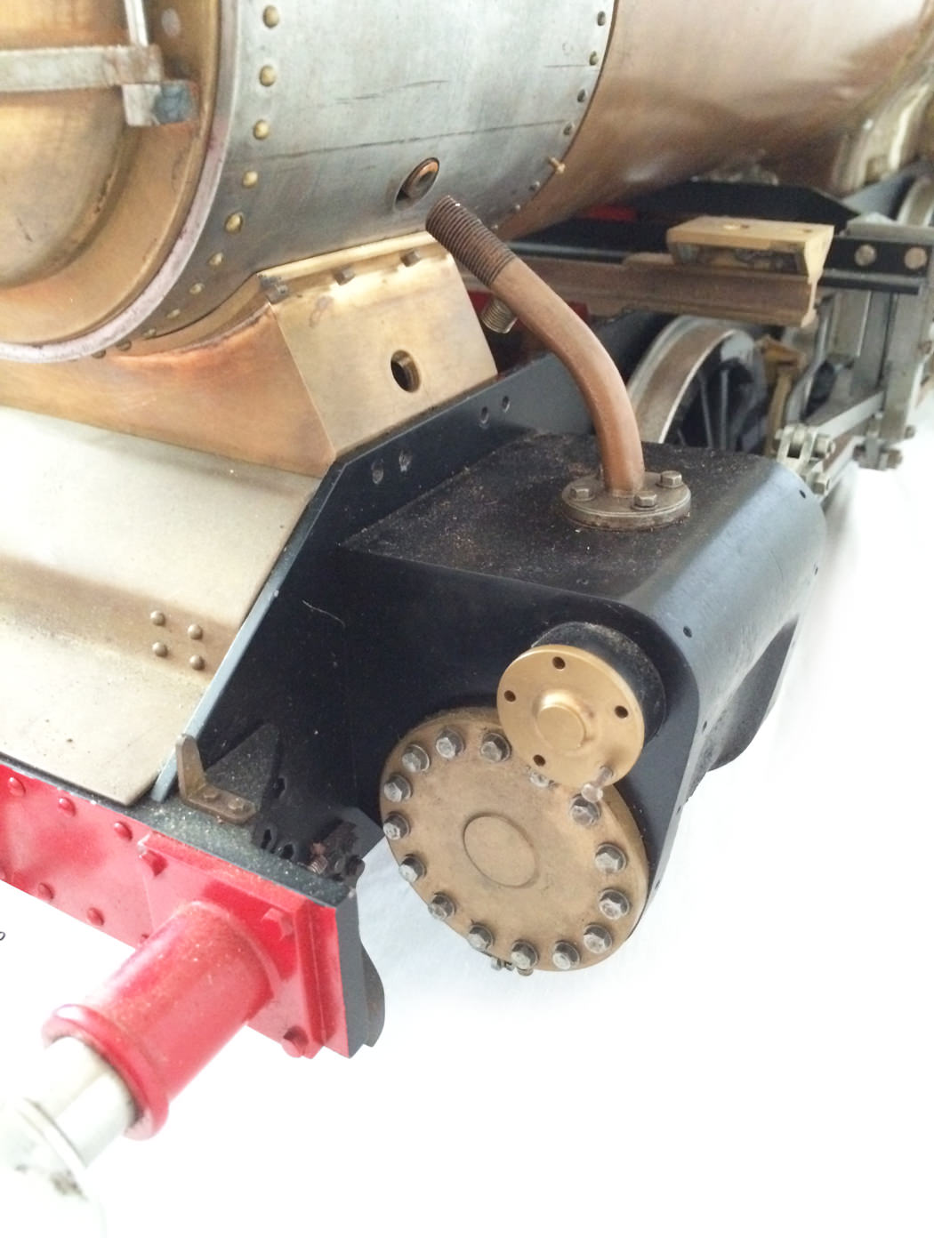 The model is probably 95% there, with the vast majority of the work is done,. As a short, but probably not exhaustive list we would say that only the ashpan (for which there is a cardboard pattern included), various jobs to the left hand pannier tank, plumbing up of the remaining pipework and a small amount of platework at the front end remains before the engine can be test steamed, stripped, primed and painted. A very nice model it will make as well. The boiler is very solidly made by the builder, and we have shell tested it to twice working pressure to ensure that it is good to go. You can also see from the photos that she is fitted with stainless superheaters.