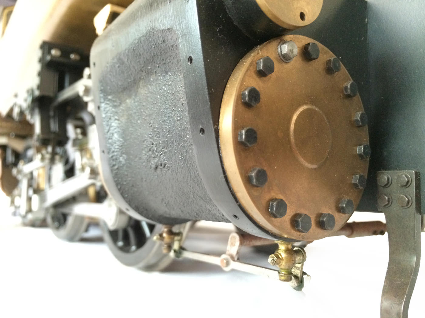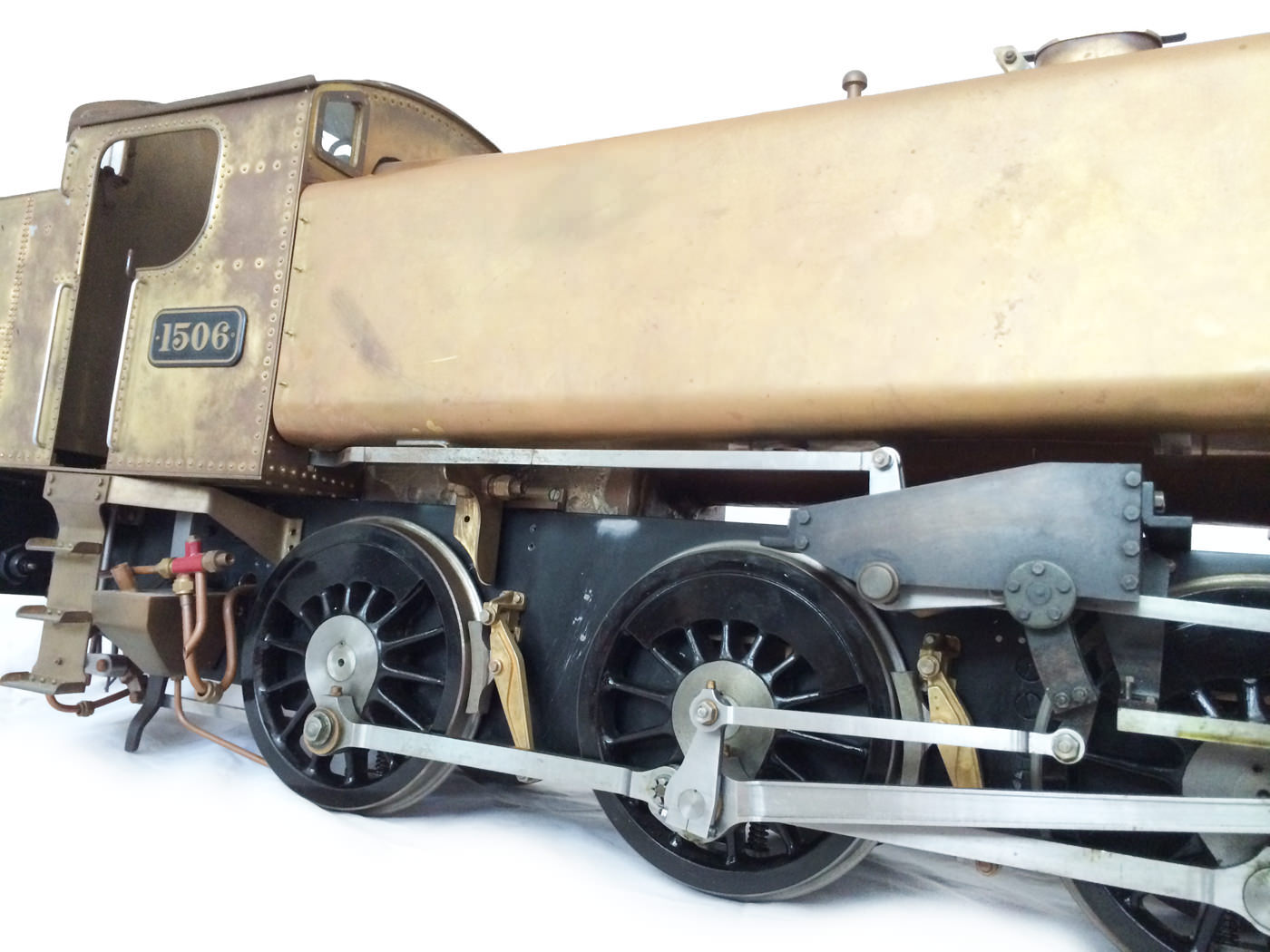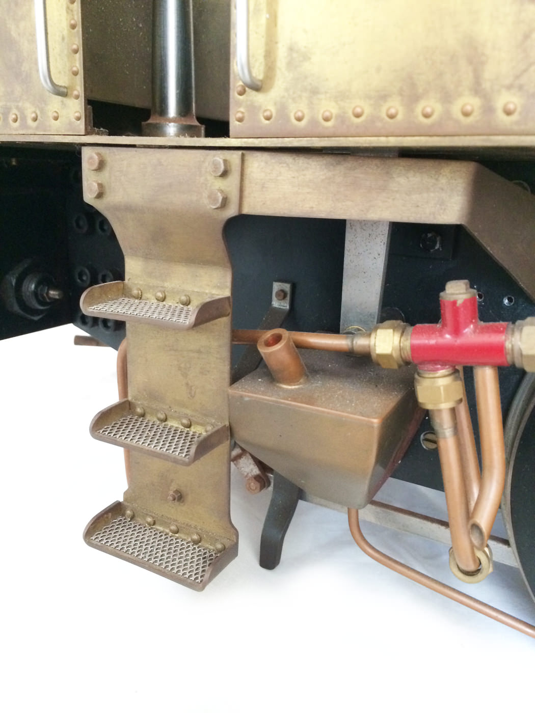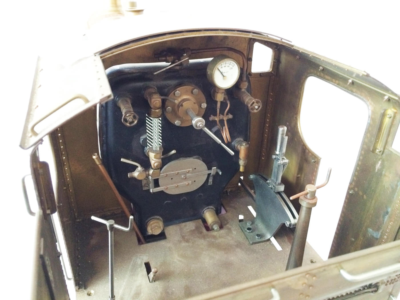 The model is probably 95% there, with the vast majority of the work is done,. As a short, but probably not exhaustive list we would say that only the ashpan (for which there is a cardboard pattern included), various jobs to the left hand pannier tank, plumbing up of the remaining pipework and a small amount of platework at the front end remains before the engine can be test steamed, stripped, primed and painted. A very nice model it will make as well. The boiler is very solidly made by the builder, and we have shell tested it to twice working pressure to ensure that it is good to go. You can also see from the photos that she is fitted with stainless superheaters.