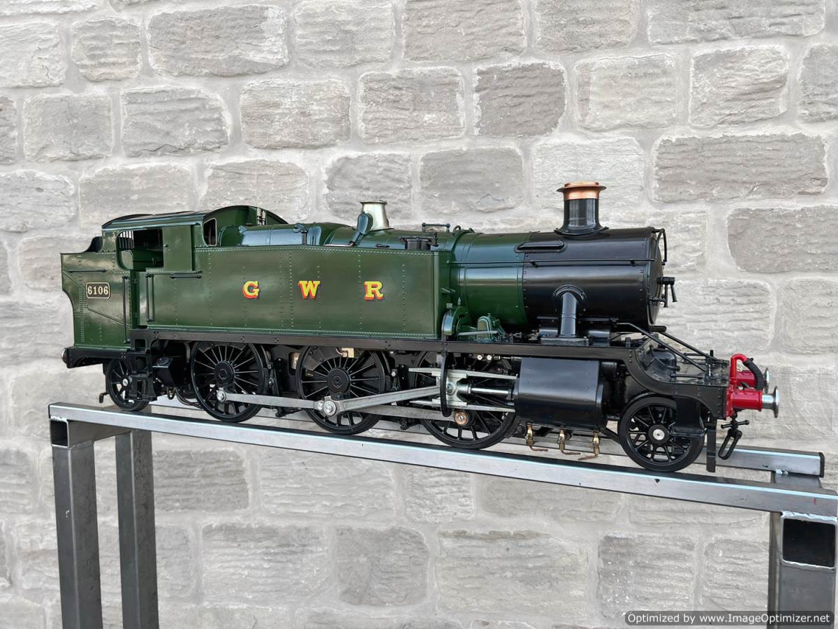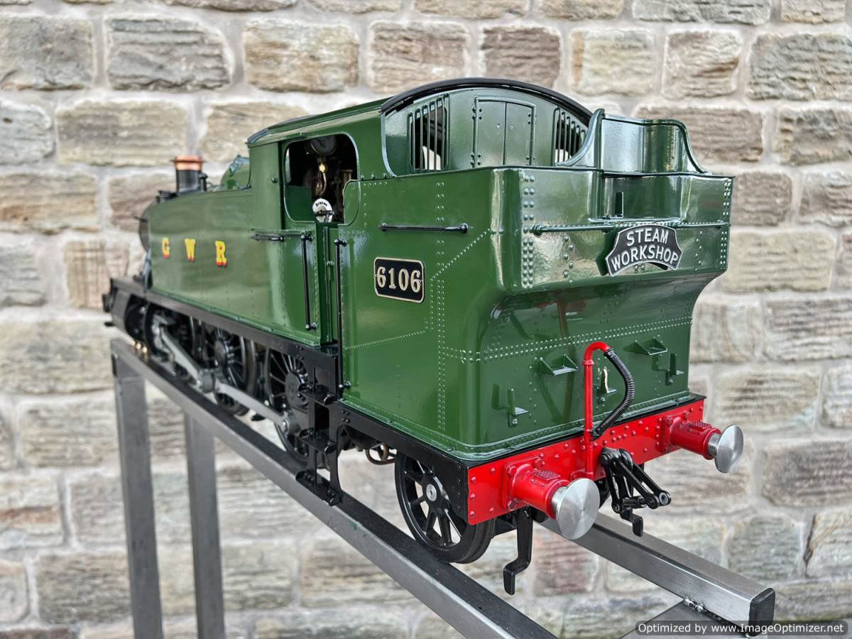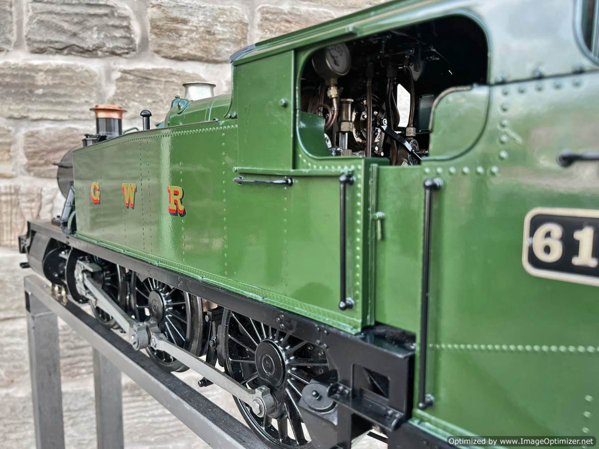 Here we have a 5" gauge GWR 61xx Large Prairie from Kingscale. Only steamed on a couple of occasions, essentially it's a brand new model. The level of detail on this latest offering from Kingscale is just superb. The sanding gear, the folding driver seats and opening footplate doors,..... it's a really beautiful looking model, and if it were a model engineer built large Prarie to the Trevor Shortland design with this level of detail it could easily be over twice this price. We think this one is actually Kingscale's Pilot model, because delivery of the production run from the manufacturer has only just started, and as such It's still got the usual manufacturing tolerance issues on the valve gear and bottom end generally, and so everything is a bit loose and sloppy down there. That said. it looks like it runs freely enough, and everything will essentially work. We're confident that if you want to pull yourself round the club track a few sunny Sundays in the year it'll do the job beautifully, but ultimately it's not robust enough to be put into intensive passenger hauling service without a good bit of attention to tighten up some of the slop in the rods and boxes.