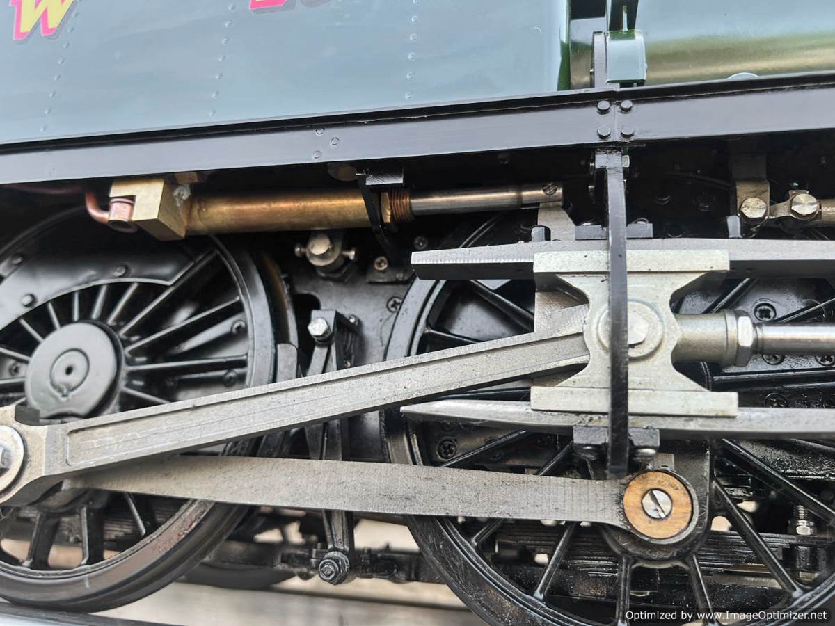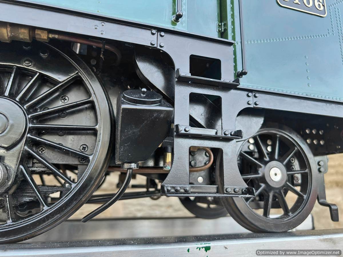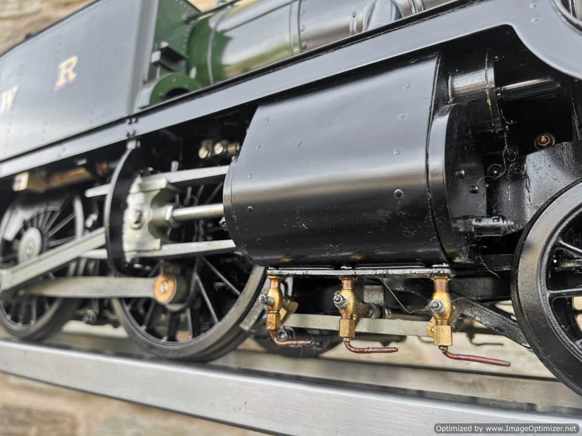 Here we have a 5" gauge GWR 61xx Large Prairie from Kingscale. Only steamed on a couple of occasions, essentially it's a brand new model. The level of detail on this latest offering from Kingscale is just superb. The sanding gear, the folding driver seats and opening footplate doors,..... it's a really beautiful looking model, and if it were a model engineer built large Prarie to the Trevor Shortland design with this level of detail it could easily be over twice this price. We think this one is actually Kingscale's Pilot model, because delivery of the production run from the manufacturer has only just started, and as such It's still got the usual manufacturing tolerance issues on the valve gear and bottom end generally, and so everything is a bit loose and sloppy down there. That said. it looks like it runs freely enough, and everything will essentially work. We're confident that if you want to pull yourself round the club track a few sunny Sundays in the year it'll do the job beautifully, but ultimately it's not robust enough to be put into intensive passenger hauling service without a good bit of attention to tighten up some of the slop in the rods and boxes.