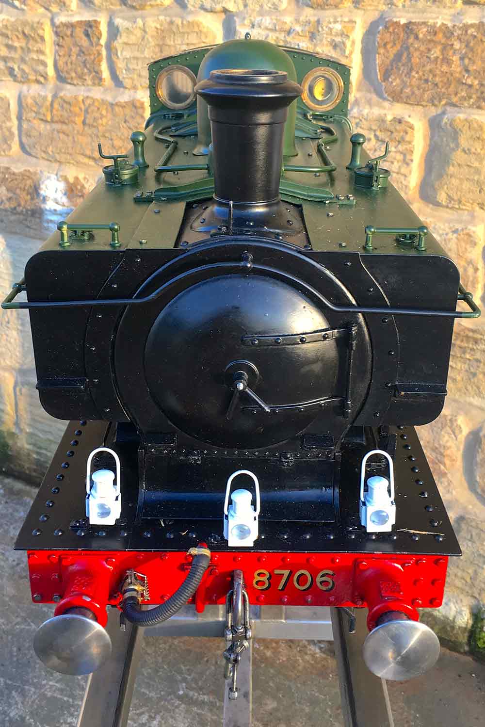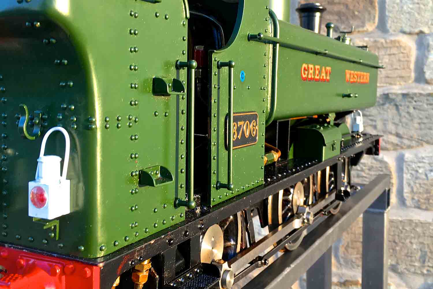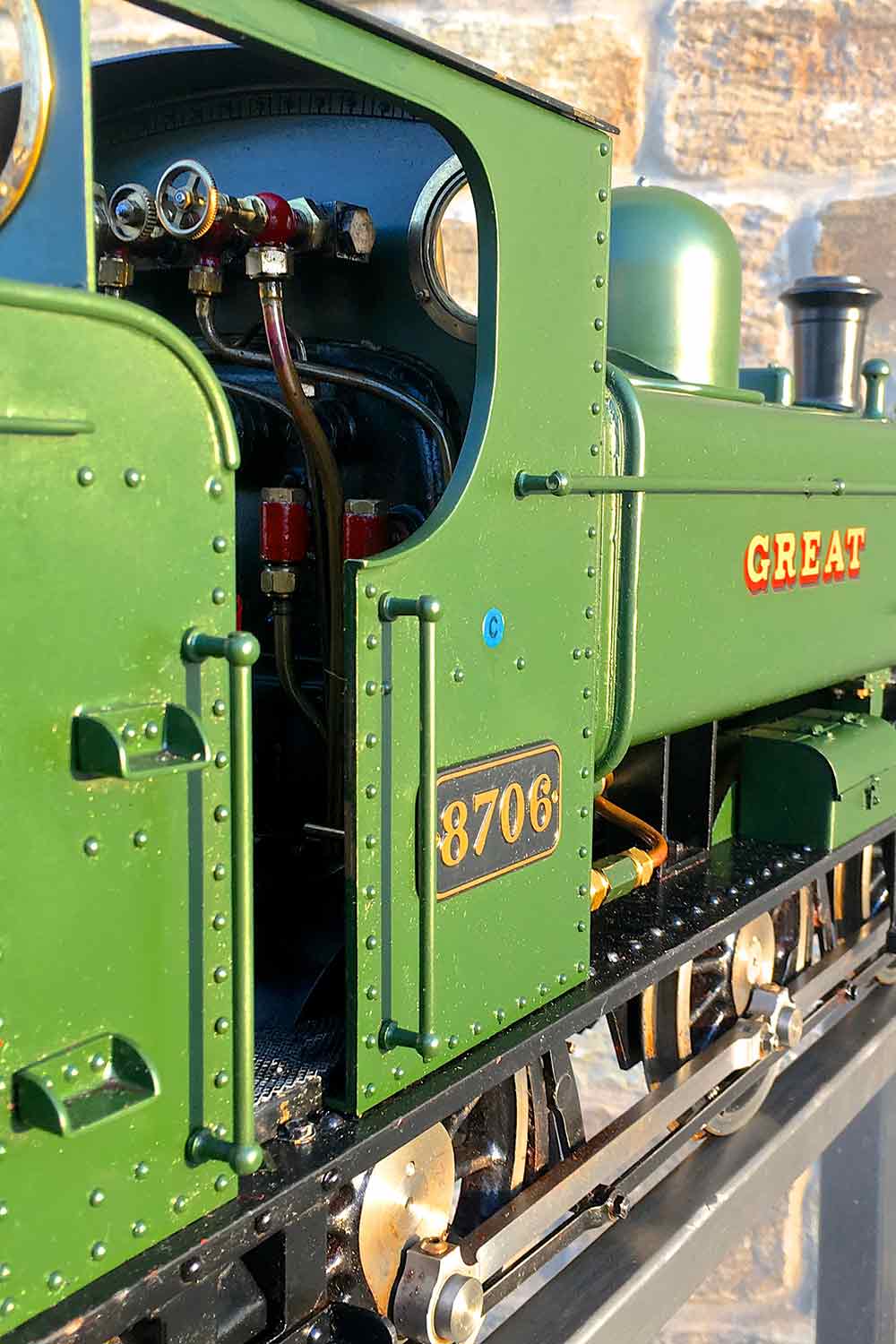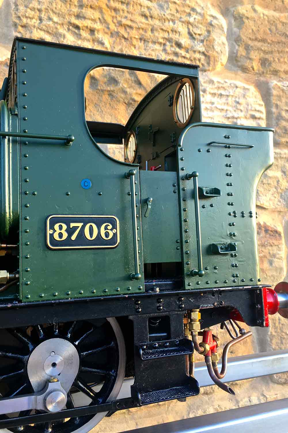 Here we have a particularly neat and well made 5" gauge GWR Pannier tank. 8706. Lots of detail on this one, and the bunker, so often just a square edged attempt, is formed beautifully and well riveted. The paint too is done with skill and attention to detail and the net result is a very tidy and well presented locomotive.