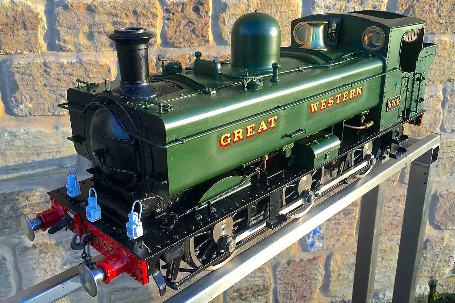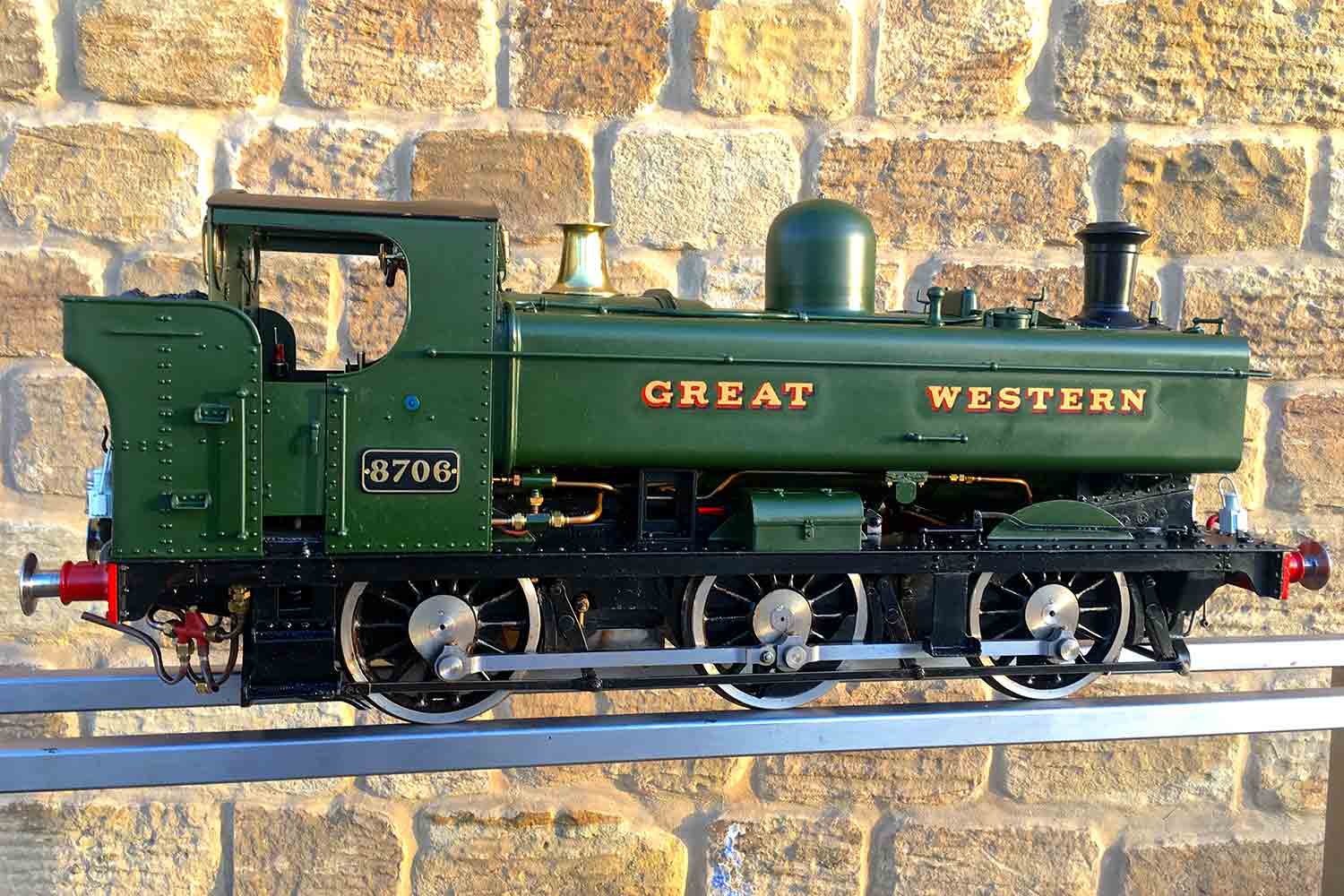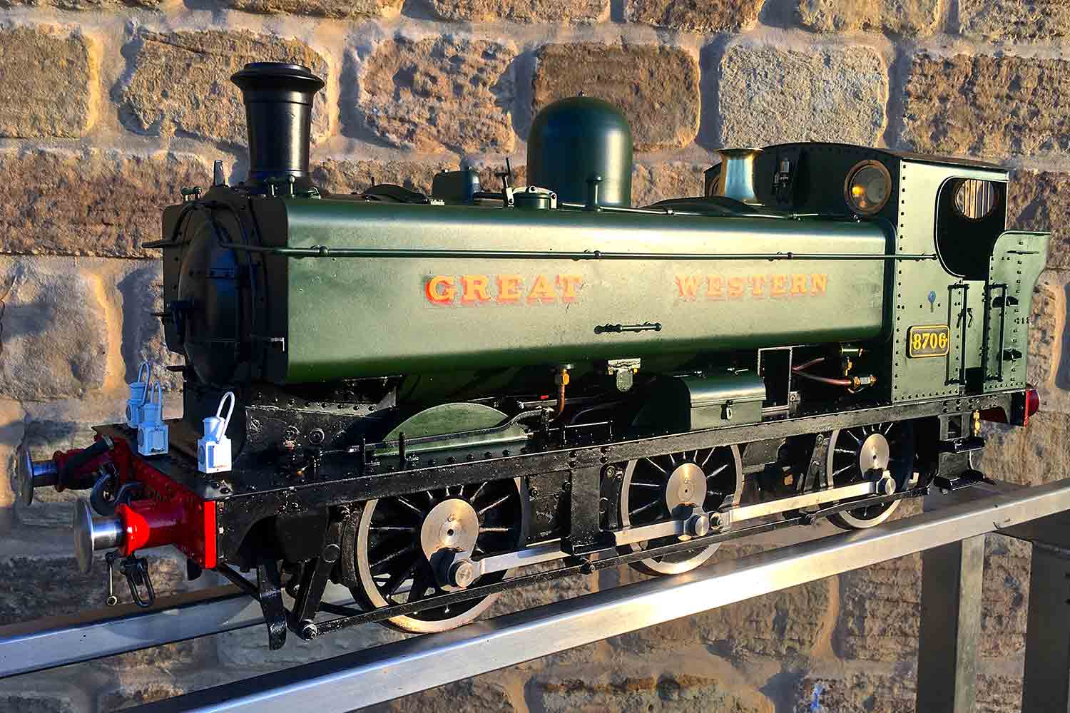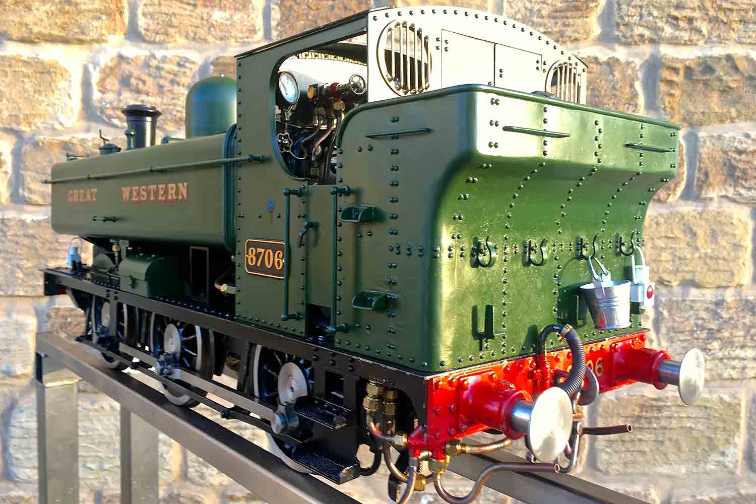 Here we have a particularly neat and well made 5" gauge GWR Pannier tank. 8706. Lots of detail on this one, and the bunker, so often just a square edged attempt, is formed beautifully and well riveted. The paint too is done with skill and attention to detail and the net result is a very tidy and well presented locomotive.