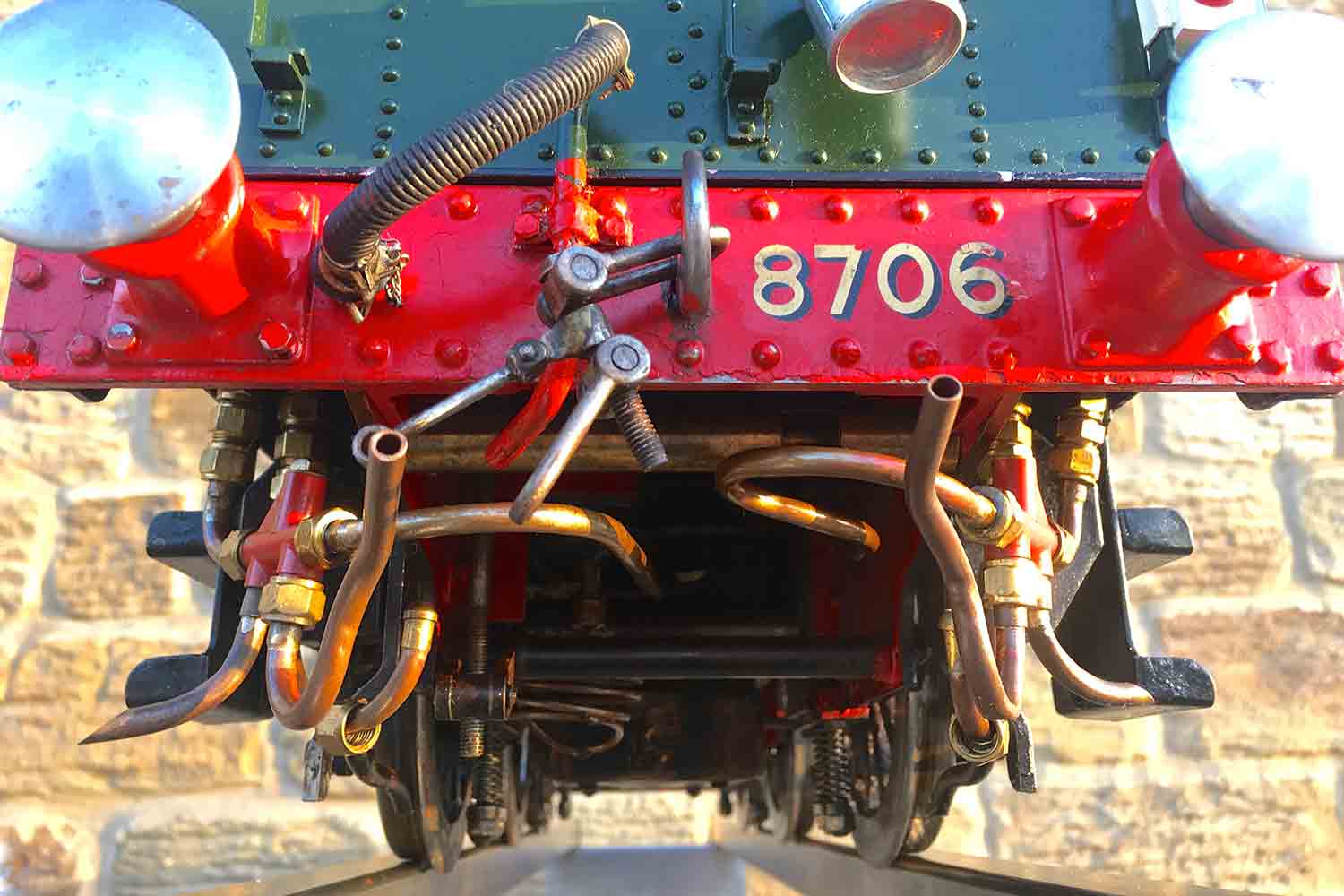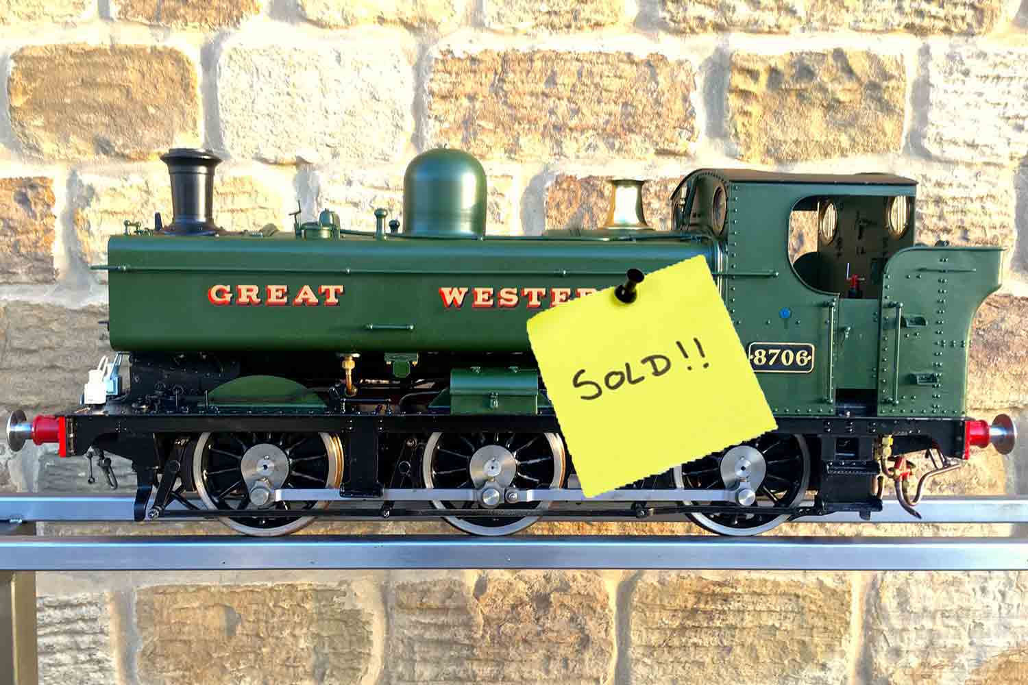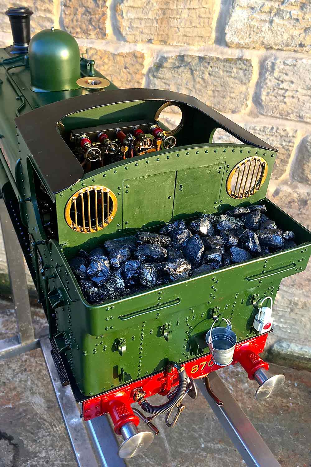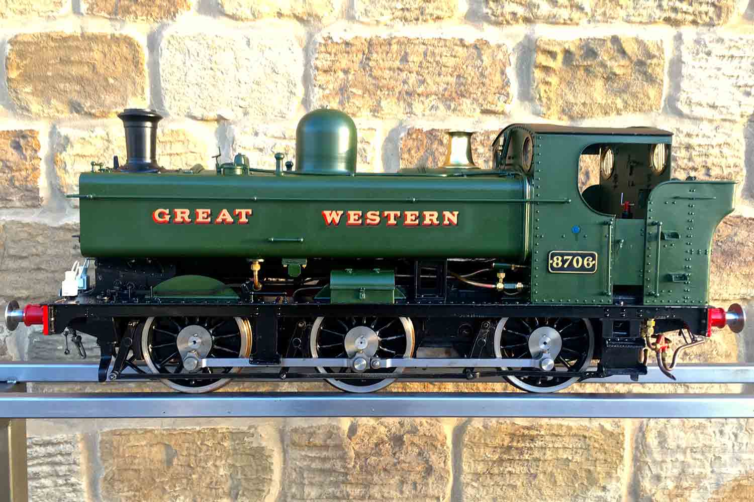 Here we have a particularly neat and well made 5" gauge GWR Pannier tank. 8706. Lots of detail on this one, and the bunker, so often just a square edged attempt, is formed beautifully and well riveted. The paint too is done with skill and attention to detail and the net result is a very tidy and well presented locomotive.