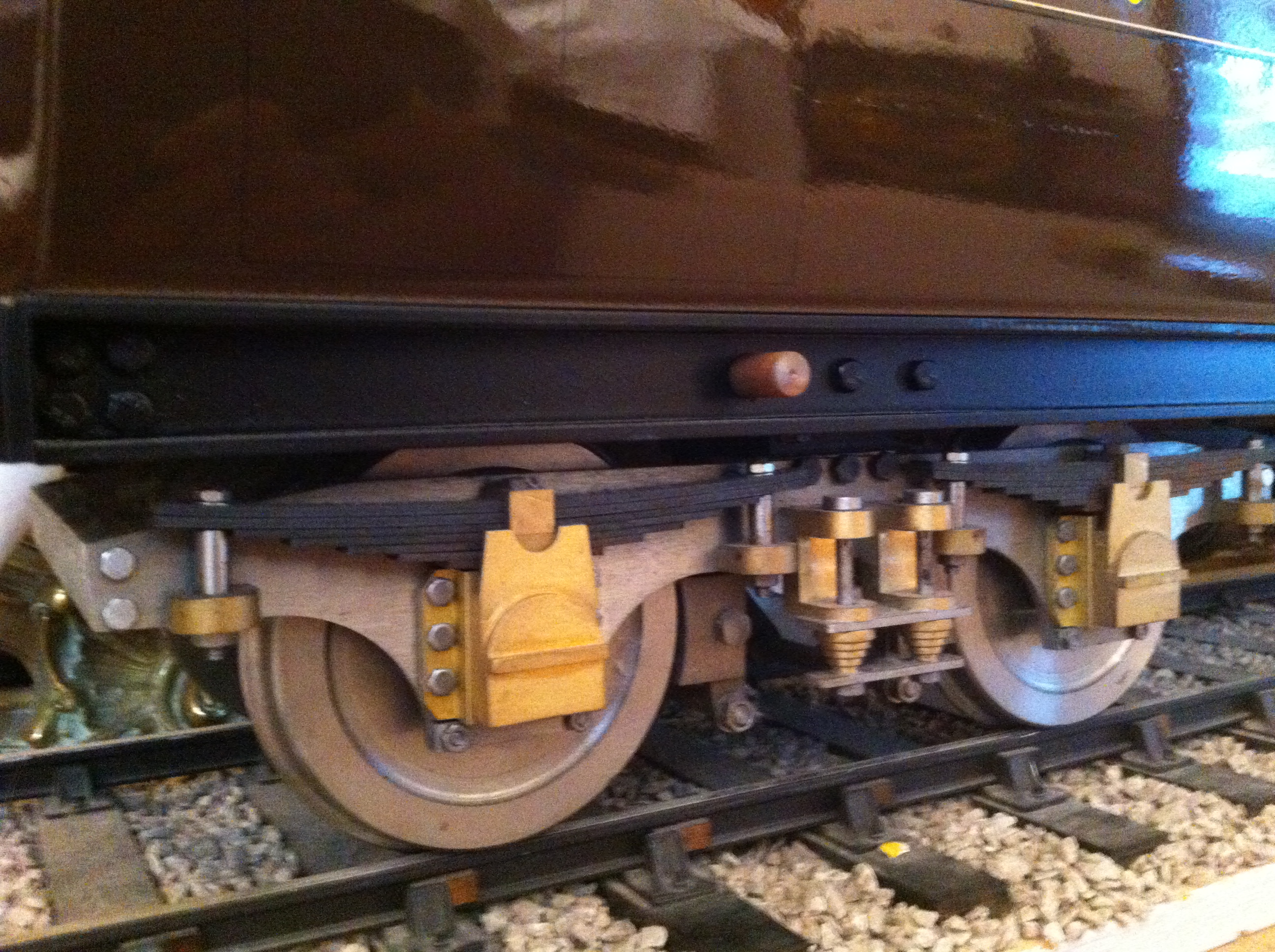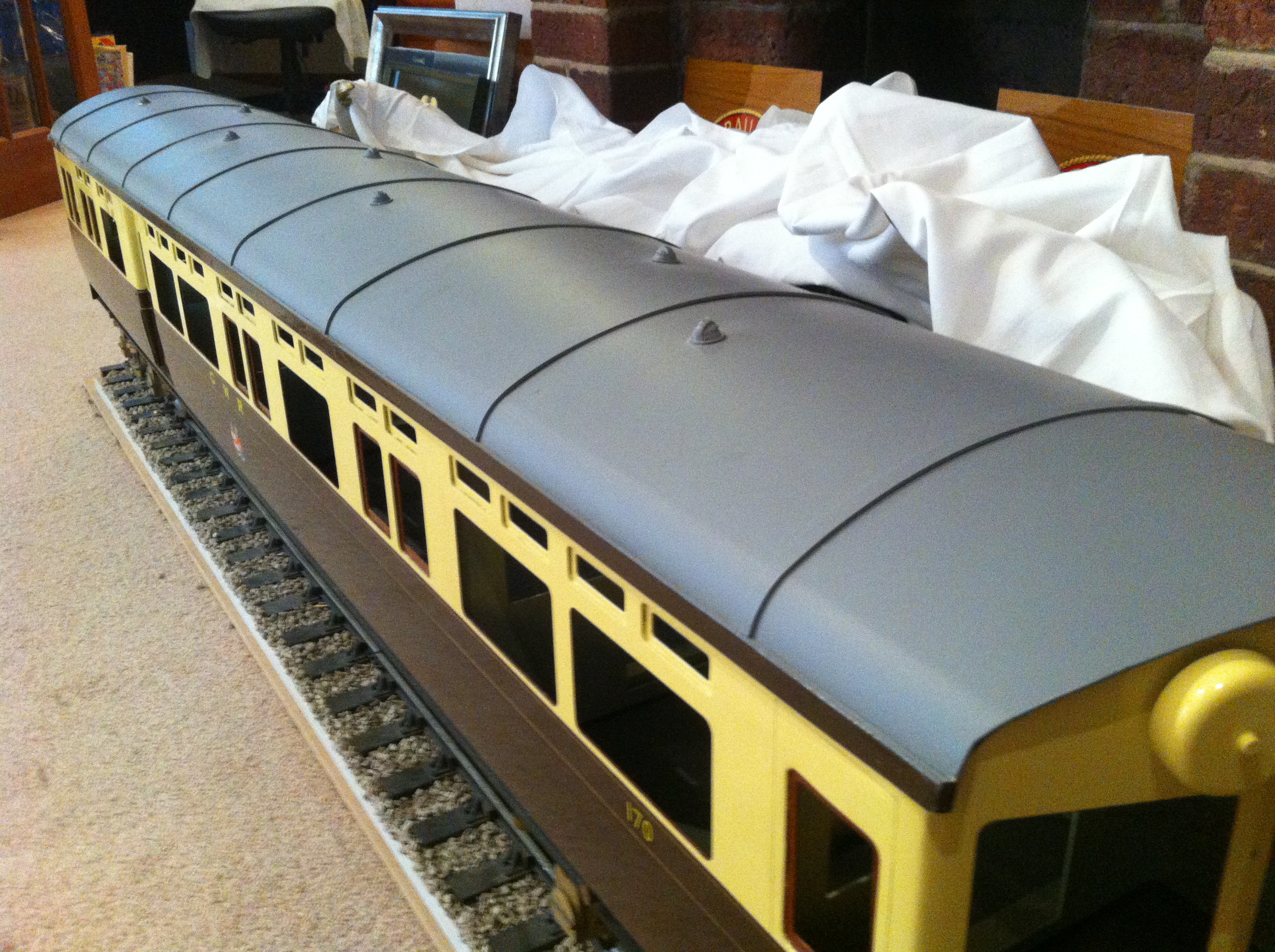 This is a large, and very strong, all steel construction model.  Easily up to the job of supporting passengers in it's roof.   A brand newly built model, with a superb professional paint and lining job.  Extra care has been taken in the finishing of this carriage, with details like the overscale modelworks body detailing grooves filled in and then thinner, more scale details added or painted on.