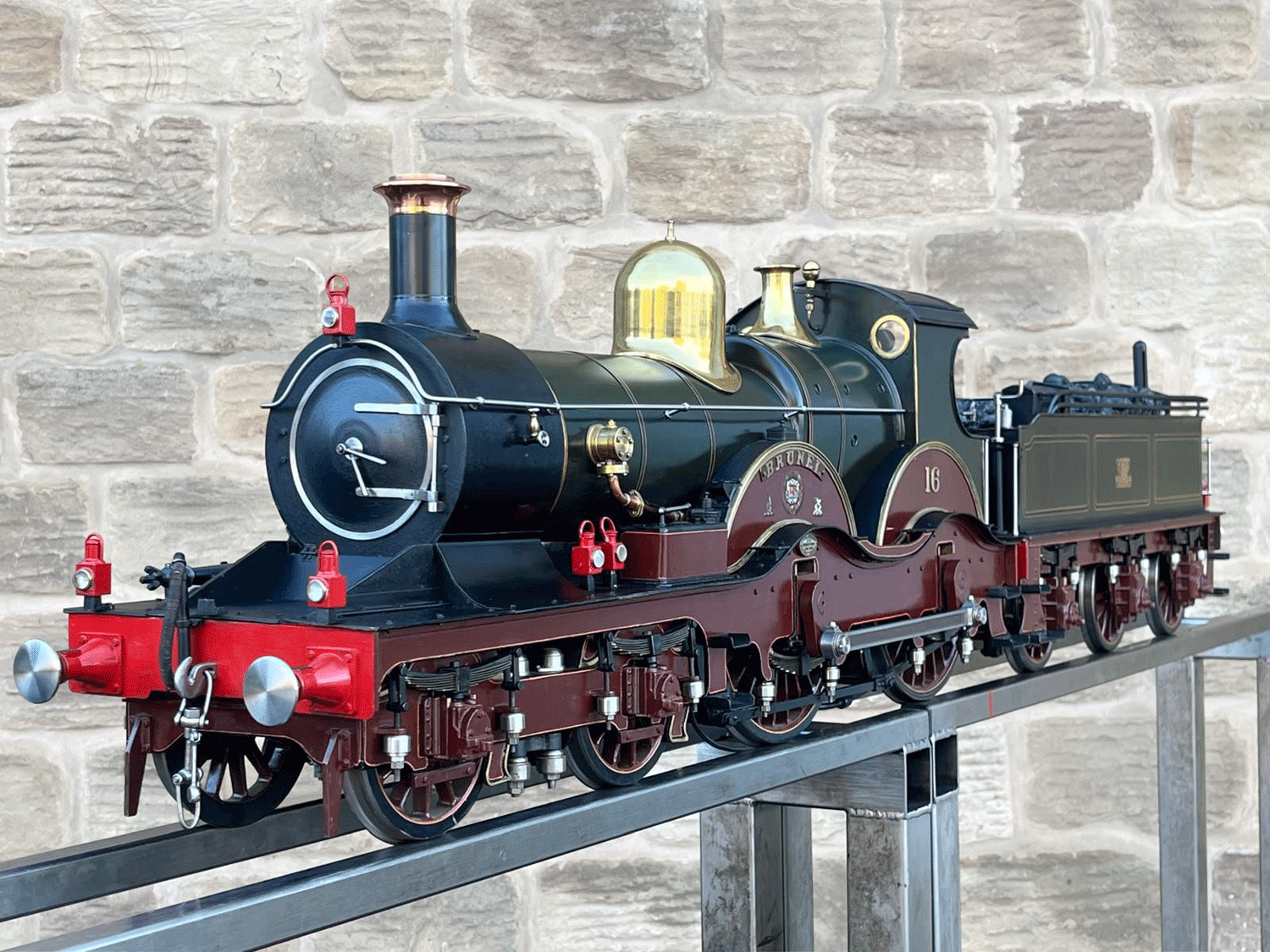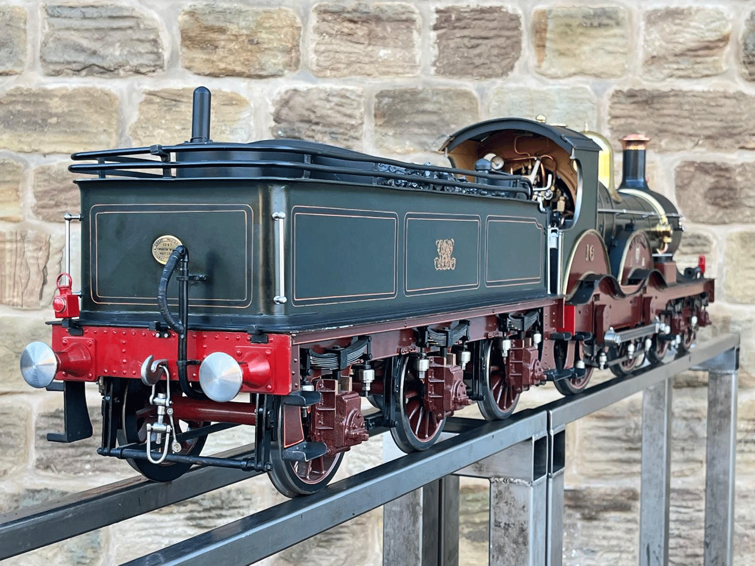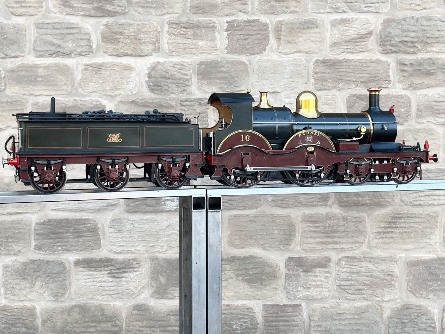 Here we have an exceptionally rare 5" GWR Deen/Armstrong 4-4-0. A super pretty loco this, and the first one we've had come through in 5". This is a brand new, un-steamed model that's been on display in the previous owner's house for many years. It has a neatly built silver soldered copper boiler, and should you wish to run it, we'd be happy to put hydraulic and steam tests on it and fully commission it ready to run, or of course you can keep it as a beautifully presented exhibition model. We also have the lovely bespoke glass display cabinet the loco has been in available.