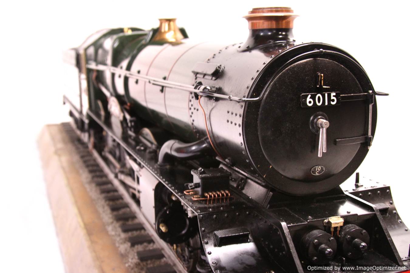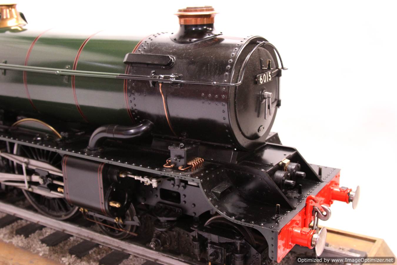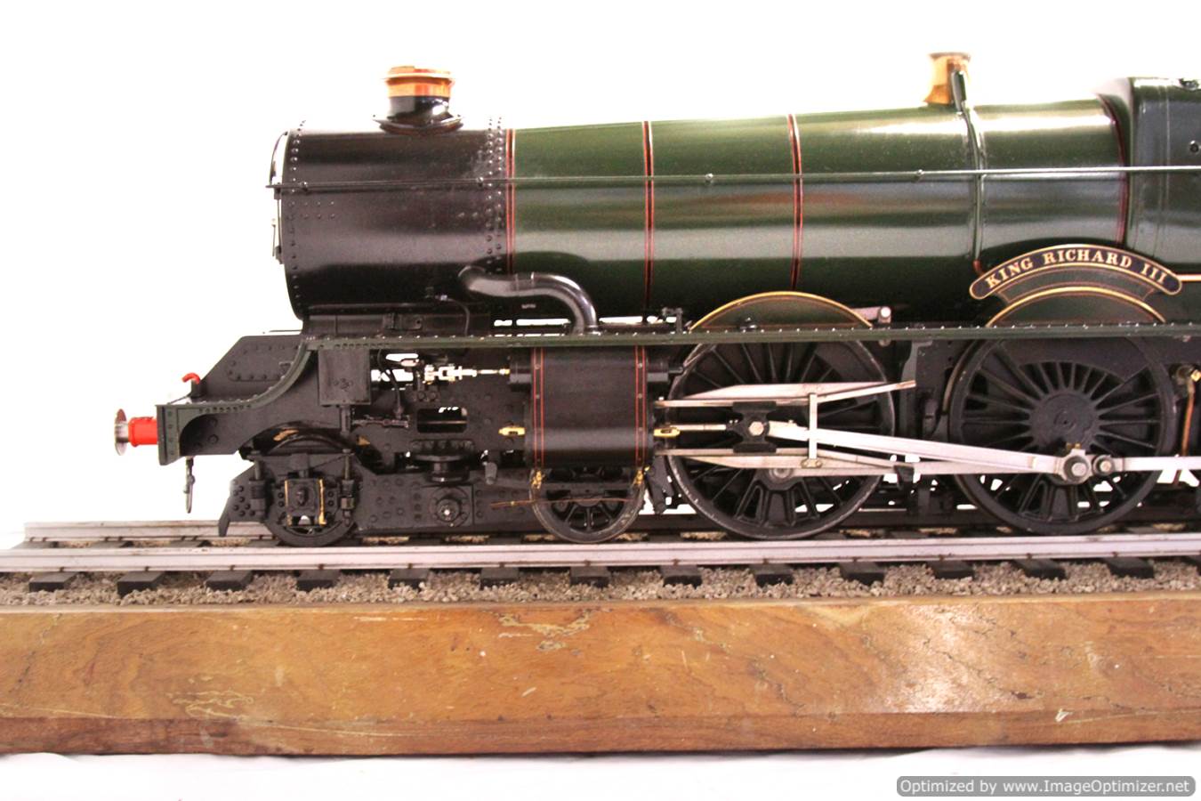 Here we have a very nicely done 5" GWR King class locomotive, 6015 'King Richard III'. This one has seen very little running since it was completed a number of years ago, having been used mostly as a display model in a private collection. Built to the Kieth Wilson design by a well respected model engineer (a friend of ours), but then passed on shortly after completion to a new owner. Historically the Wilson design has a weak spot in the crank axle, the general robustness around this area being a little on the weak side, and originally this model was no exception. It's general lack of use since completion was we think due to the crank webs working immediately a little loose, causing the front set of driving wheels to flex and occasionally drop in between the rails. We have addressed this issue in the workshops, dropping the driving axle out and re-working the original design to add the missing solidity, so ultimately this models 'achilles heal' has become it's saving grace, meaning it is offered here now ready to play with far less previous use than it would otherwise have had.