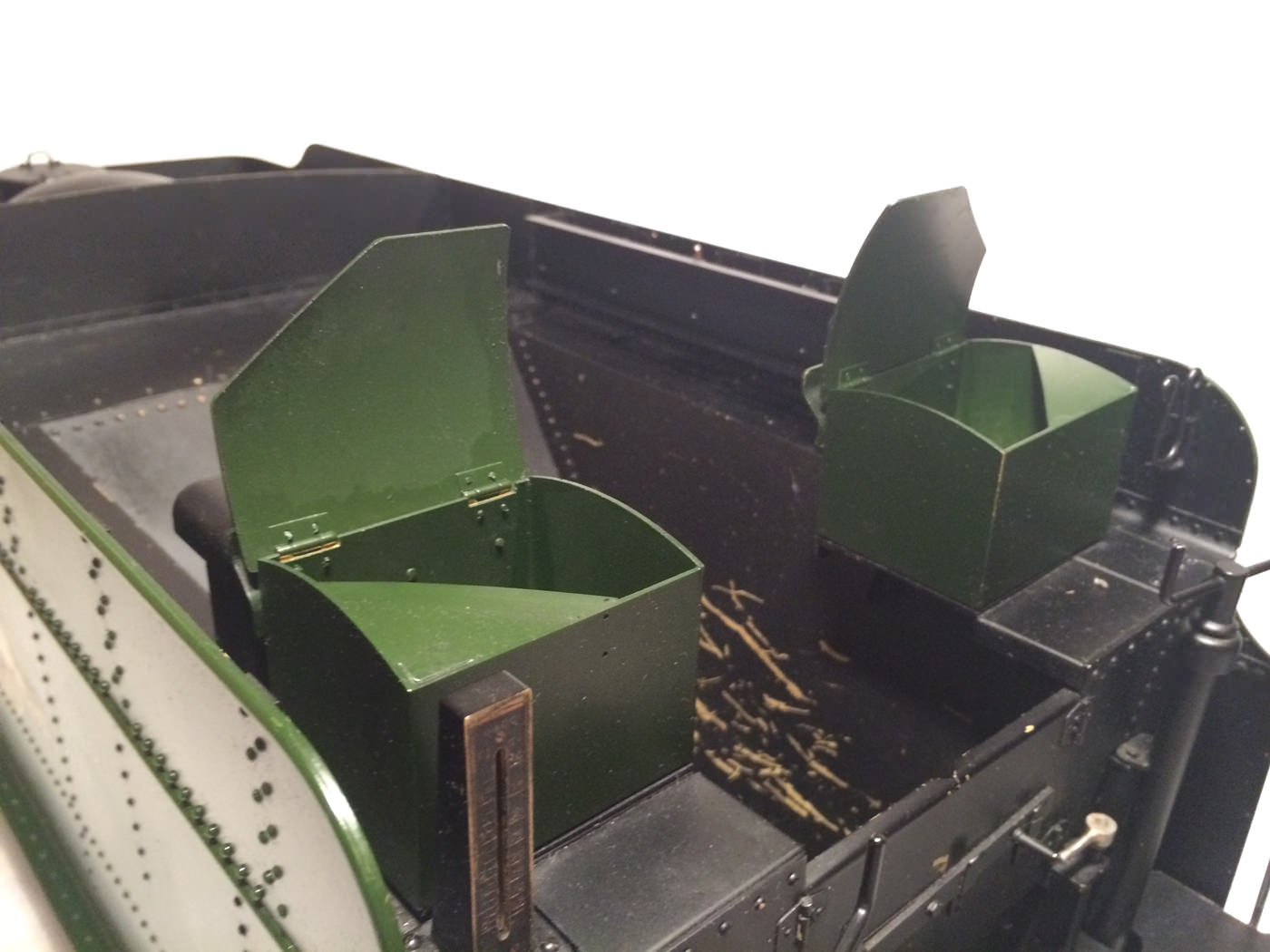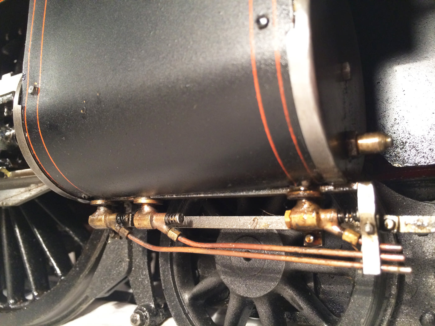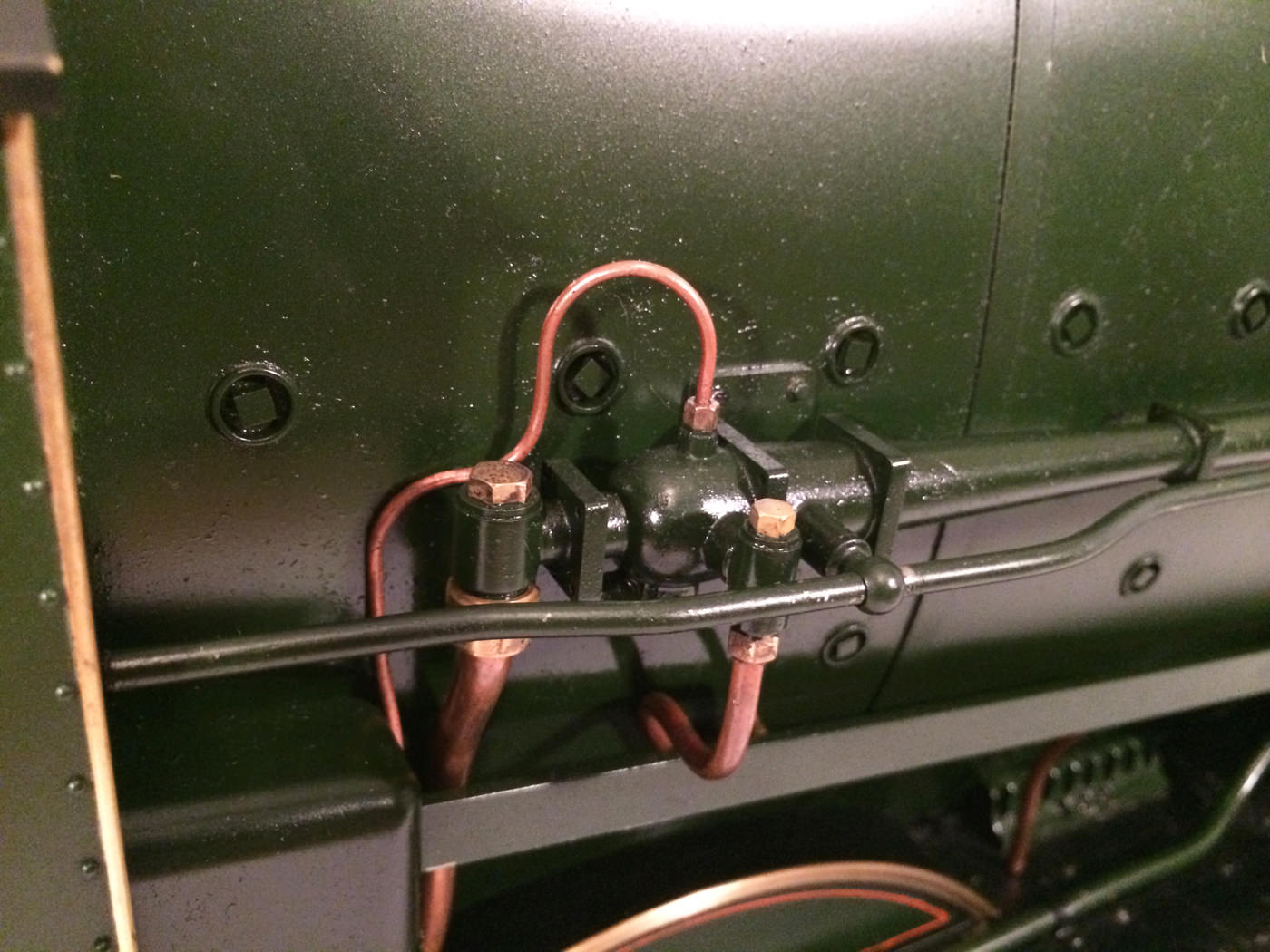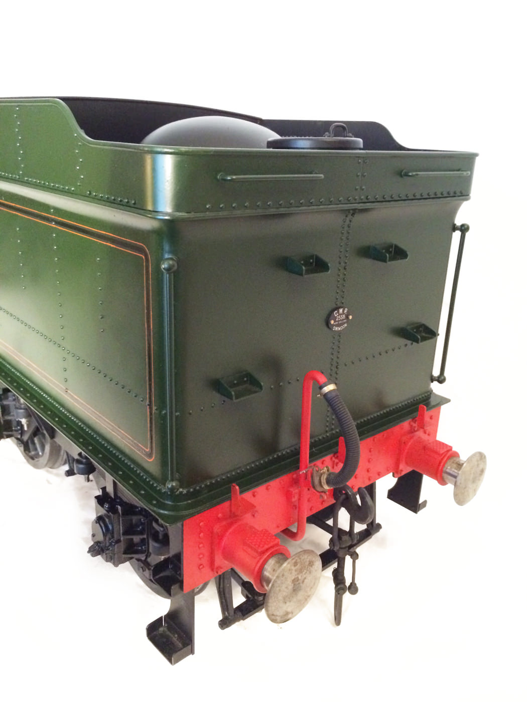 In brief, she is a full 4 cylinder, extremely crisply built engine, originally started a good many years ago to the Perrier drawings. The boiler (according to the cert) is by Kieth Wilson, but the loco was only completed as we see it now around three years ago, and has not done a huge amount of running since then. All the usual things you'd expect on a loco of this quality are there. twin injectors, tender hand pump, mechanical lubricator, footplate operated drain cocks etc.