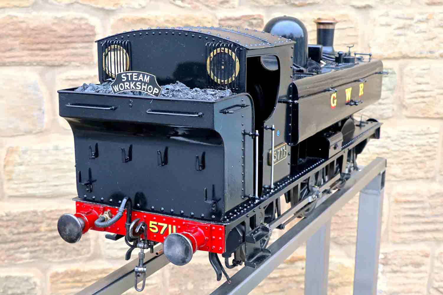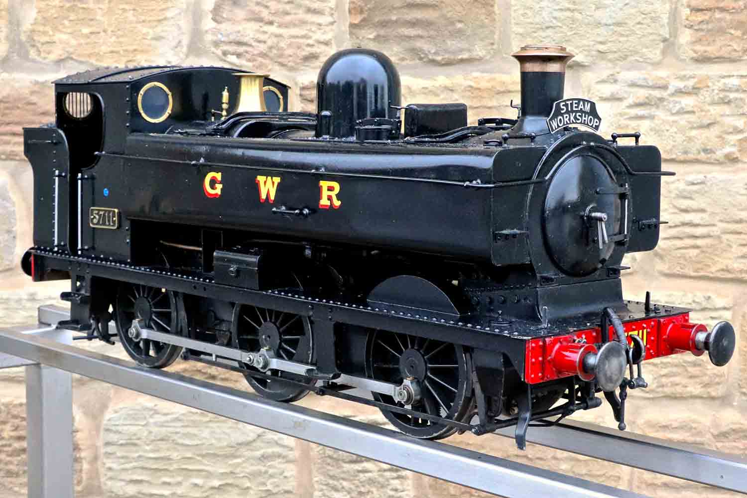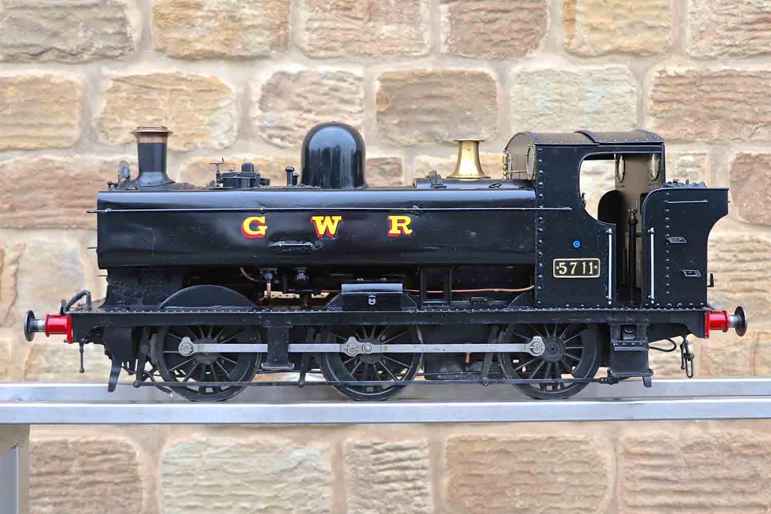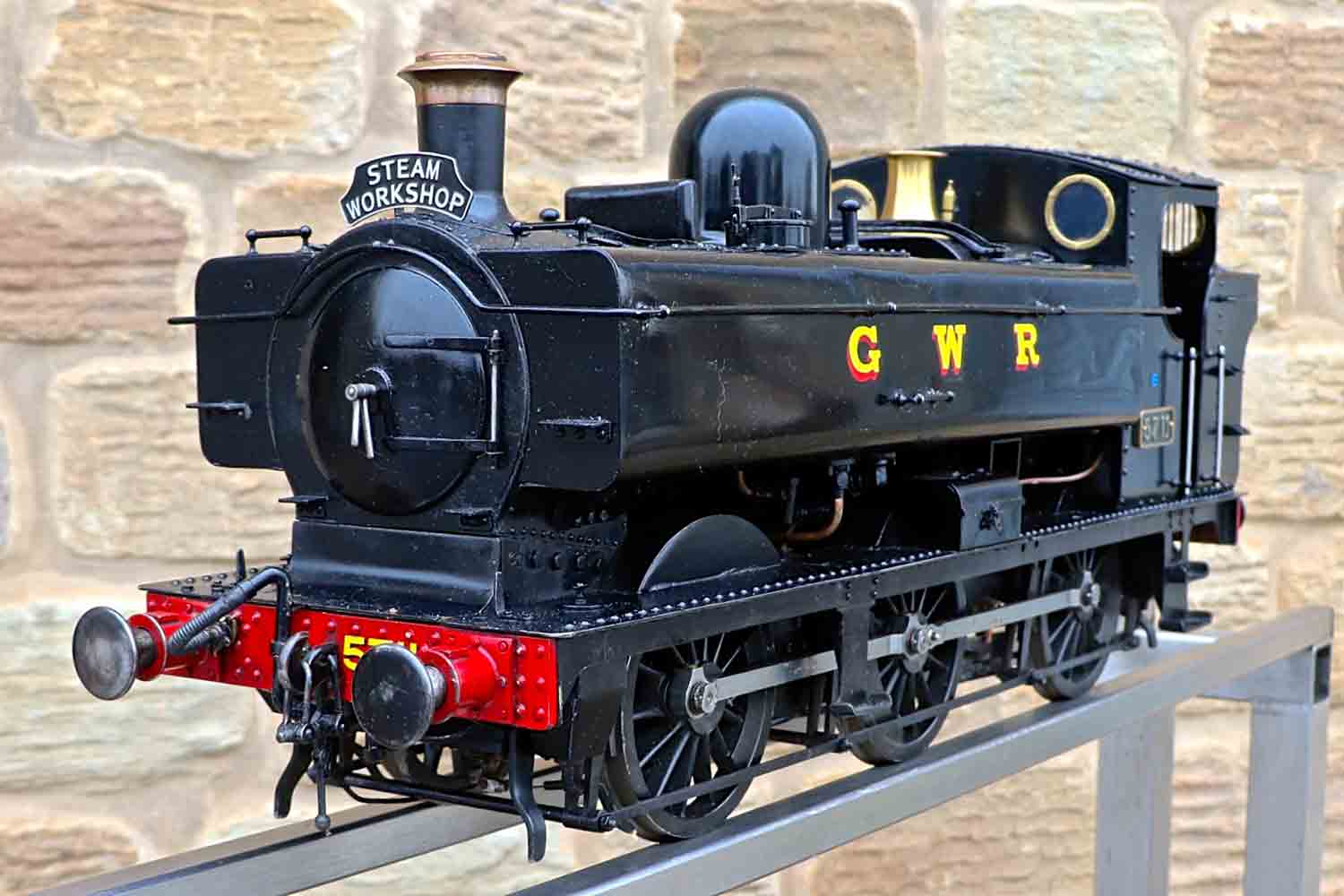 Here we have a nice 5" gauge GWR 57xx pannier tank to the well proven LBSC 'Pansy' design. The subjecto of a recent light overhaul and re-paint, she is freshly outshopped in the rarely seen, but extremely attractive GWR black.