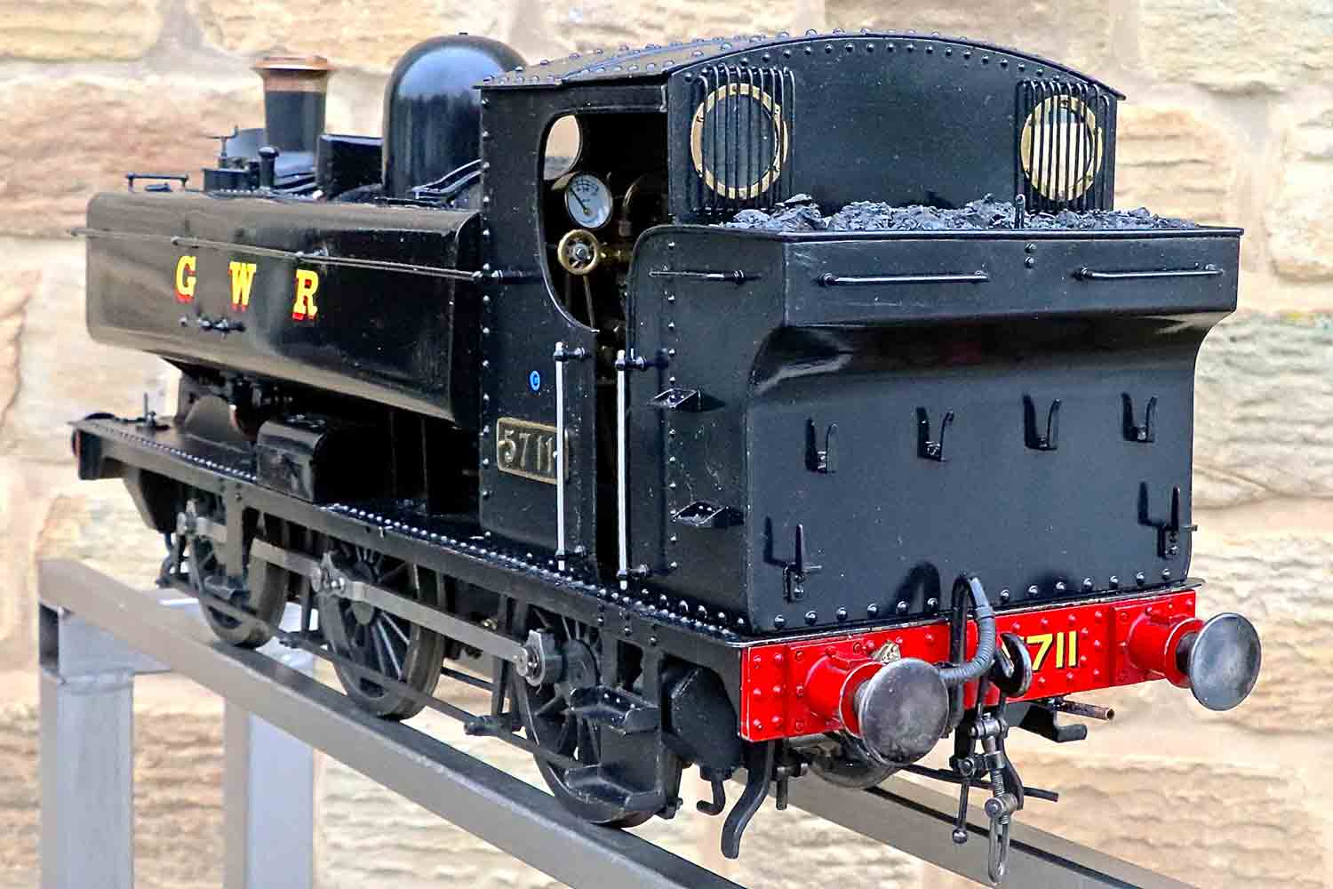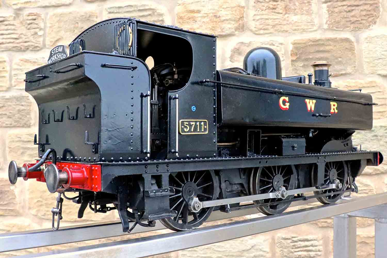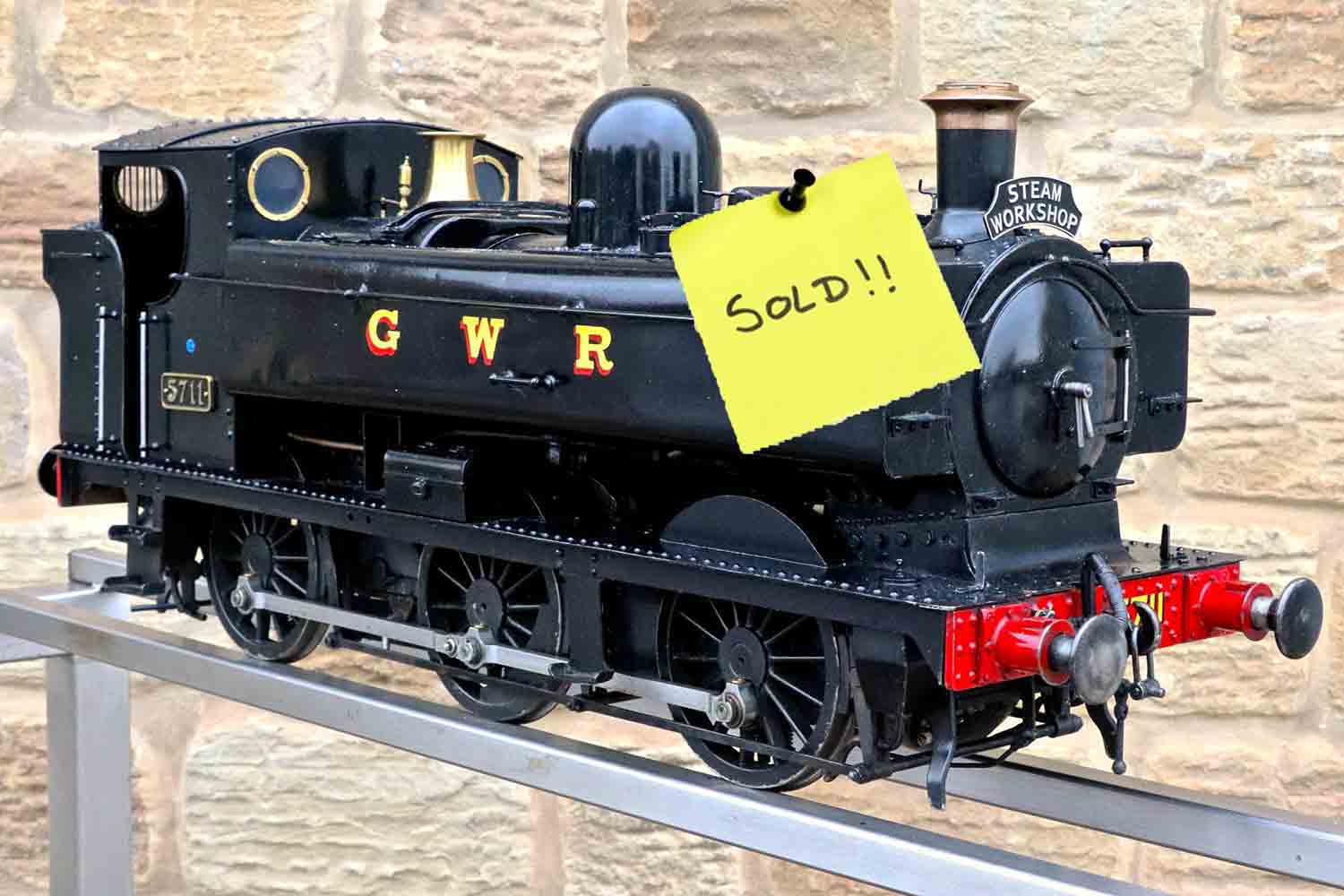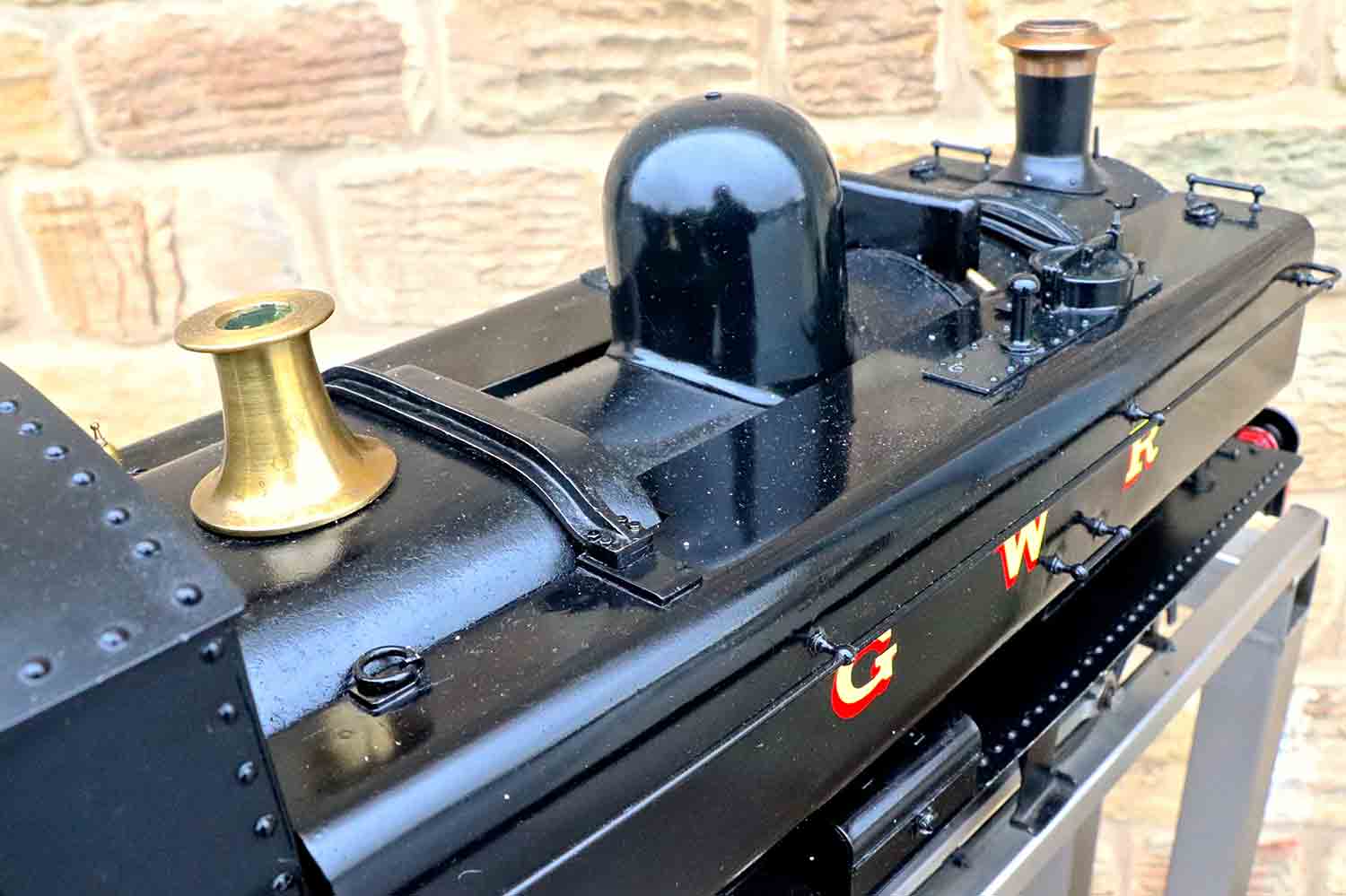 Here we have a nice 5" gauge GWR 57xx pannier tank to the well proven LBSC 'Pansy' design. The subjecto of a recent light overhaul and re-paint, she is freshly outshopped in the rarely seen, but extremely attractive GWR black.