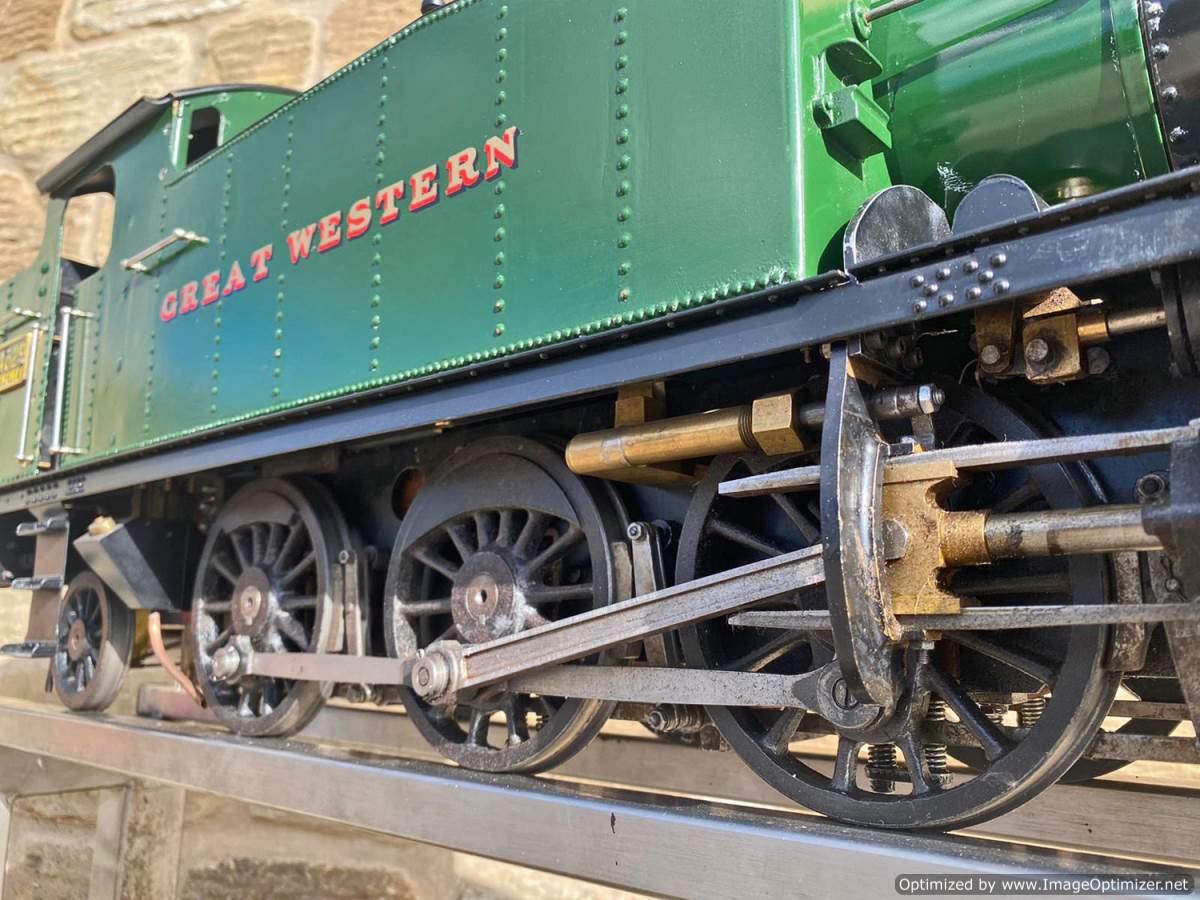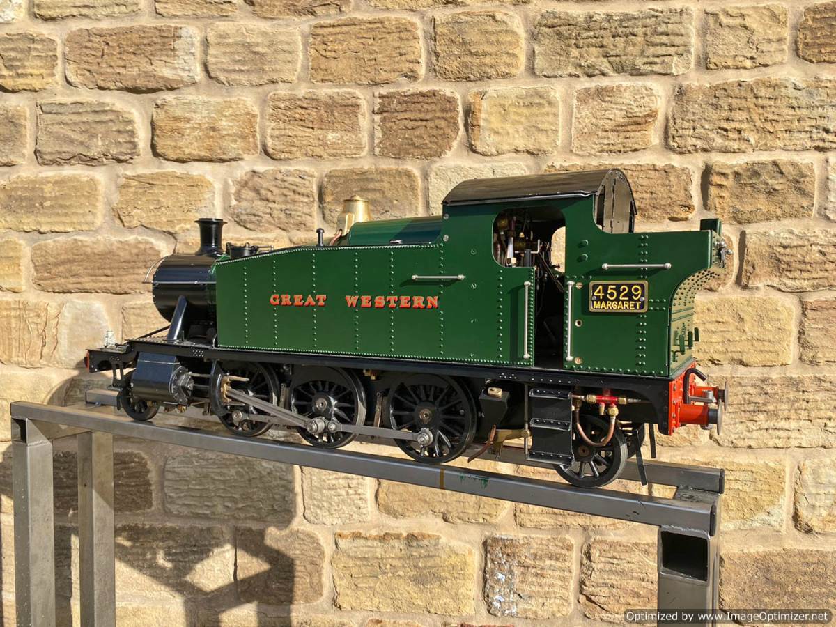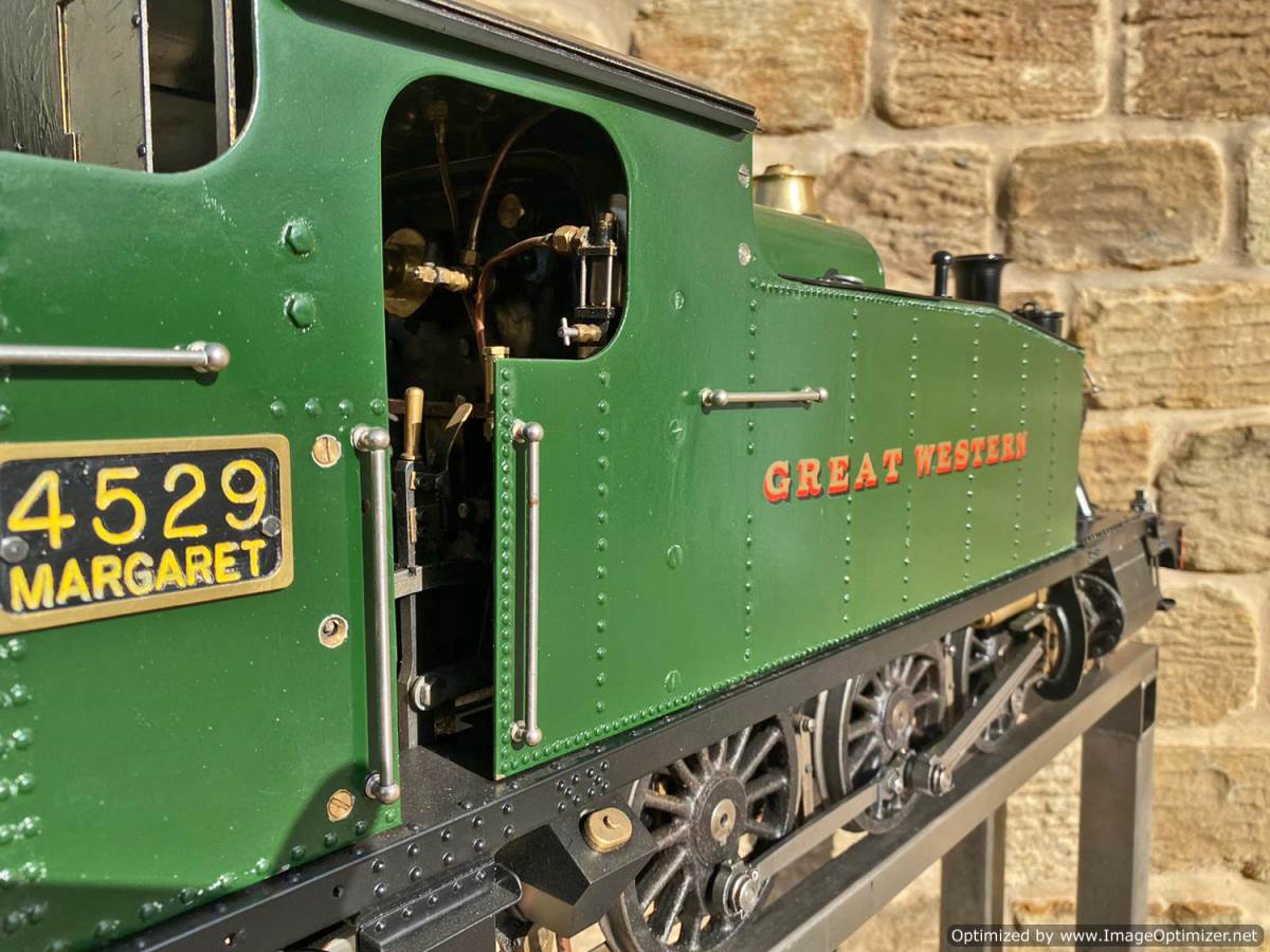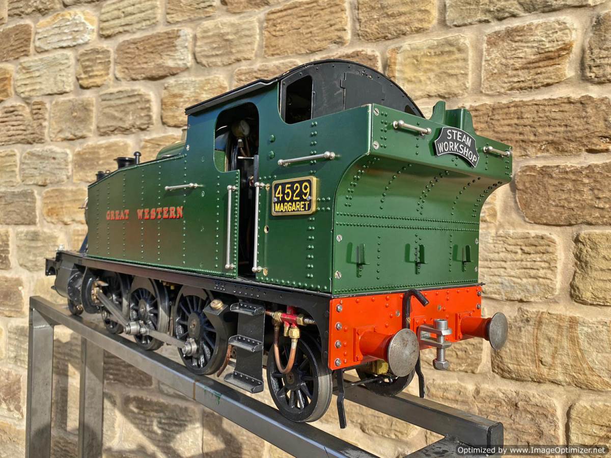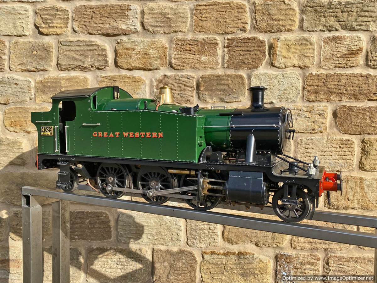 Here we have a 5″ gauge GWR small prarie tank 45xx, or rather 4575 class. Based upon a Winson/Modelworks kit, this one has been re-worked mechanically to make it actually work by a capable model engineer. Cosmetically it's quite a tidy model, and doesn't appear to have been abused in any way.