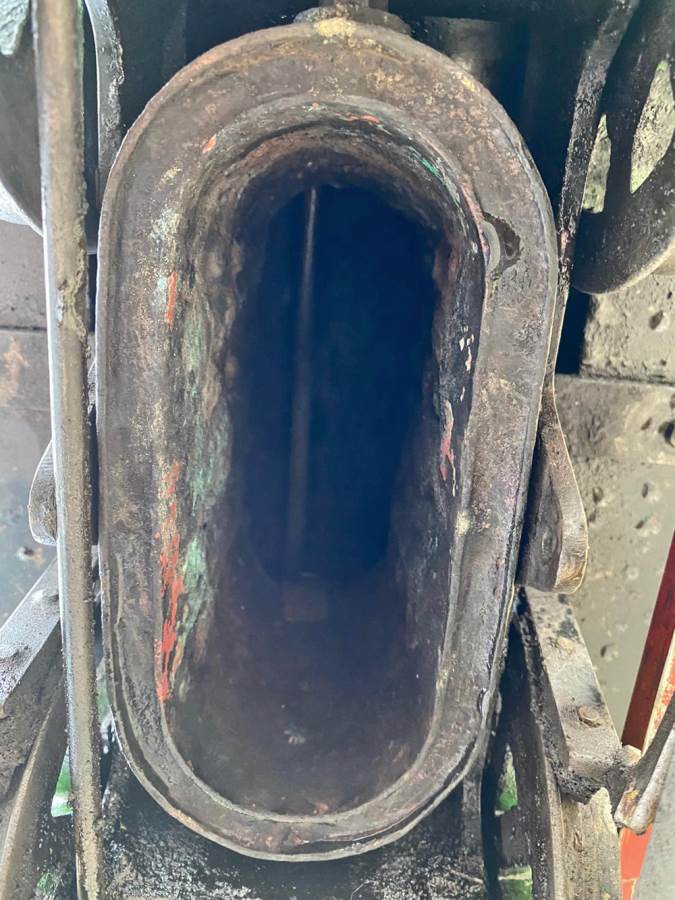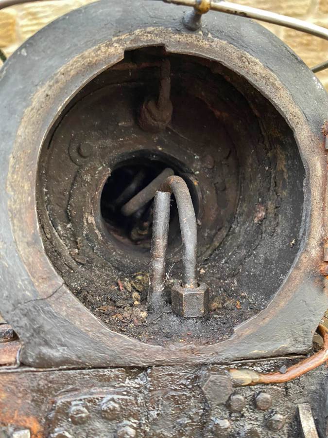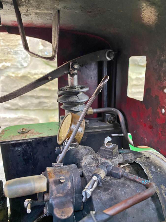 The boiler!  It looks solidly made and soundly made, and is silver soldered copper,.... but it's a weird little design!  The firebox is oval, as you can see from the photographs, and there is one large flue tube, down which the main steam pipe from the regulator heads, (having passed literally through the fire hole door to get there!) and then doubling back on it's self several times to form essentially a superheater.  It's currently missing the ashpan and grate but that's a fairly easy thing to make.  If the model wasn't so clearly well used, we'd bet against the boiler being man enough for the task in that format, but it's clearly done plenty of running, so it obviously does what it should, if through a pretty unconventional route!   There is an injector fitted as well as a big hand pump in the cab/tank.  Lubrication is a simple displacement pot in the cab.