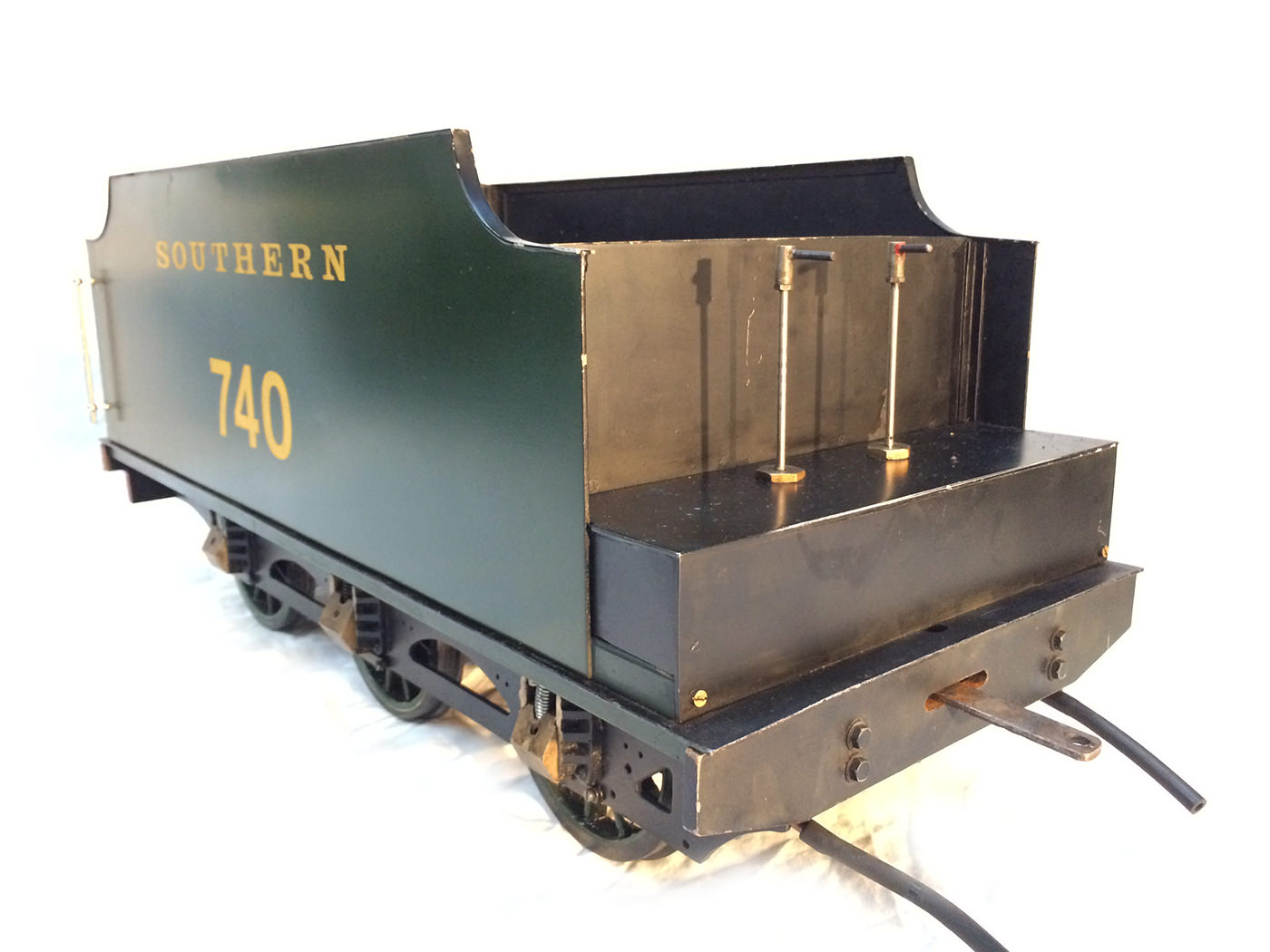 The model we have here is fully sorted and ready to play. Originally built with a steel boiler, she was re-boilered a few years ago with (as you'd expect these days) a new silver soldered copper boiler. There's twin injectors, and the usual 'incompetence' pump in the tender. (Just our little joke) Mechanical cylinder lubrication is from the usual ratchet pump hidden under the front running board.