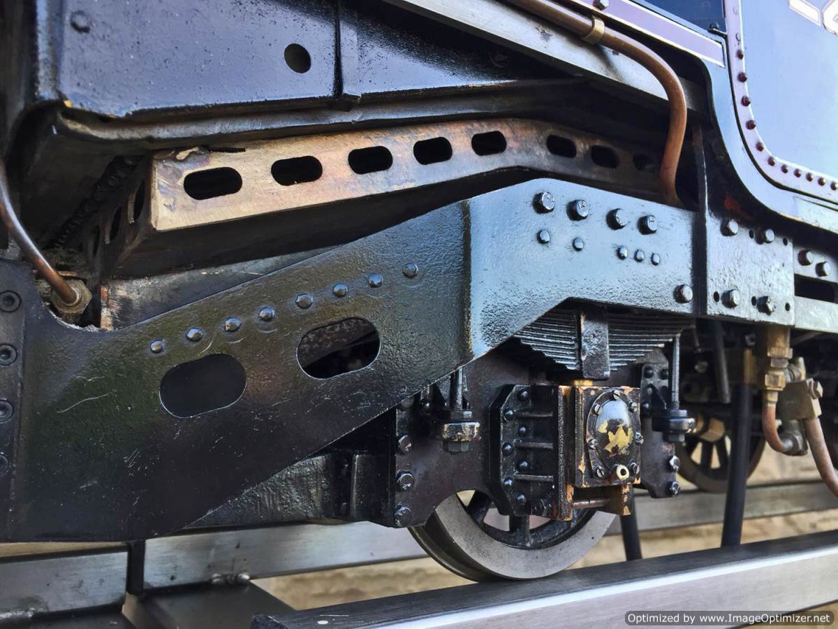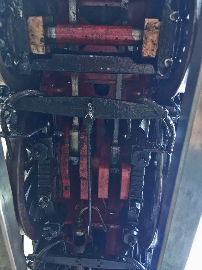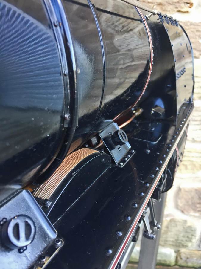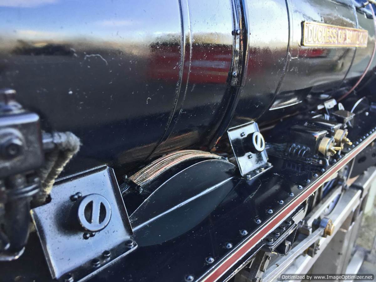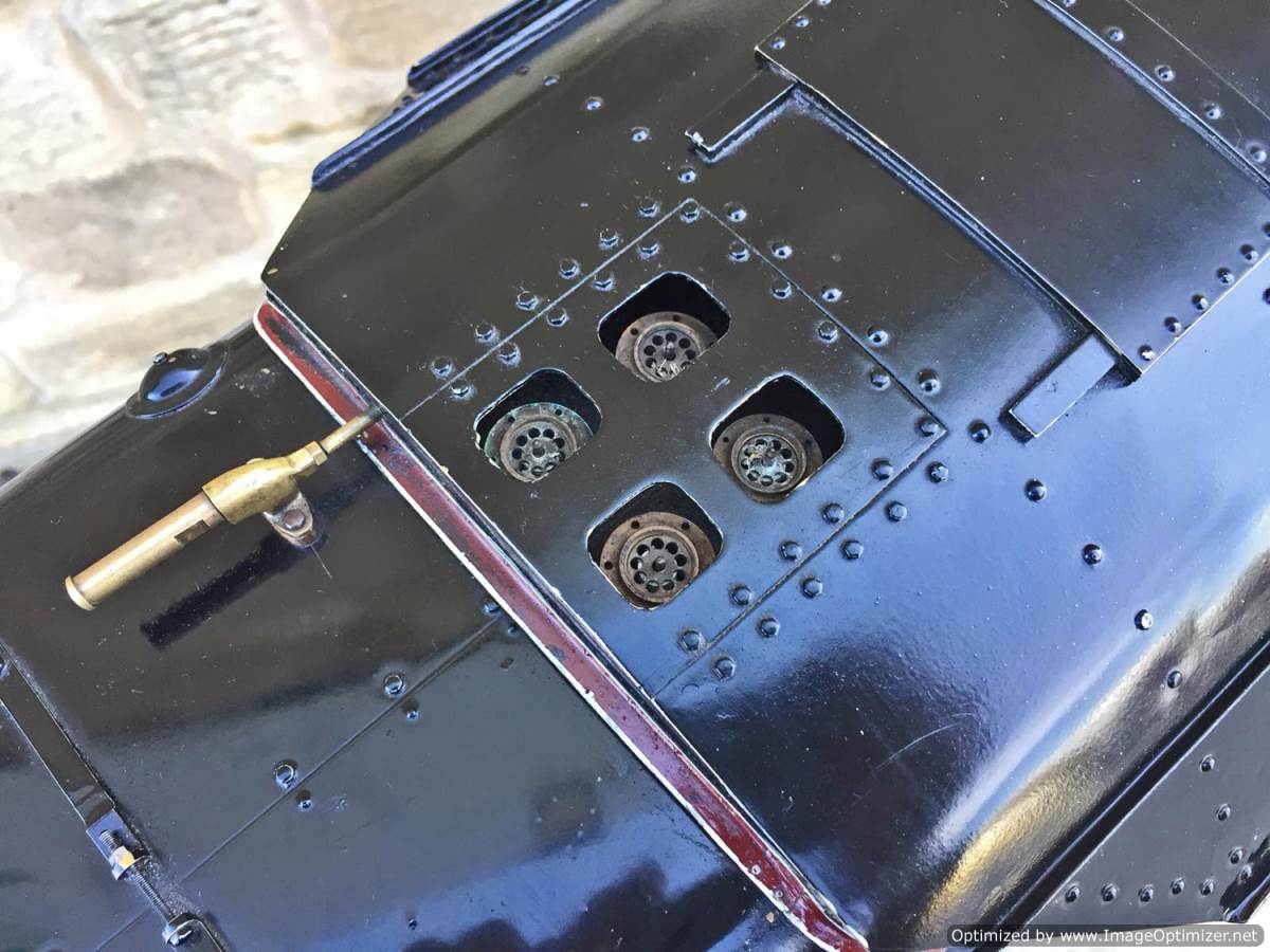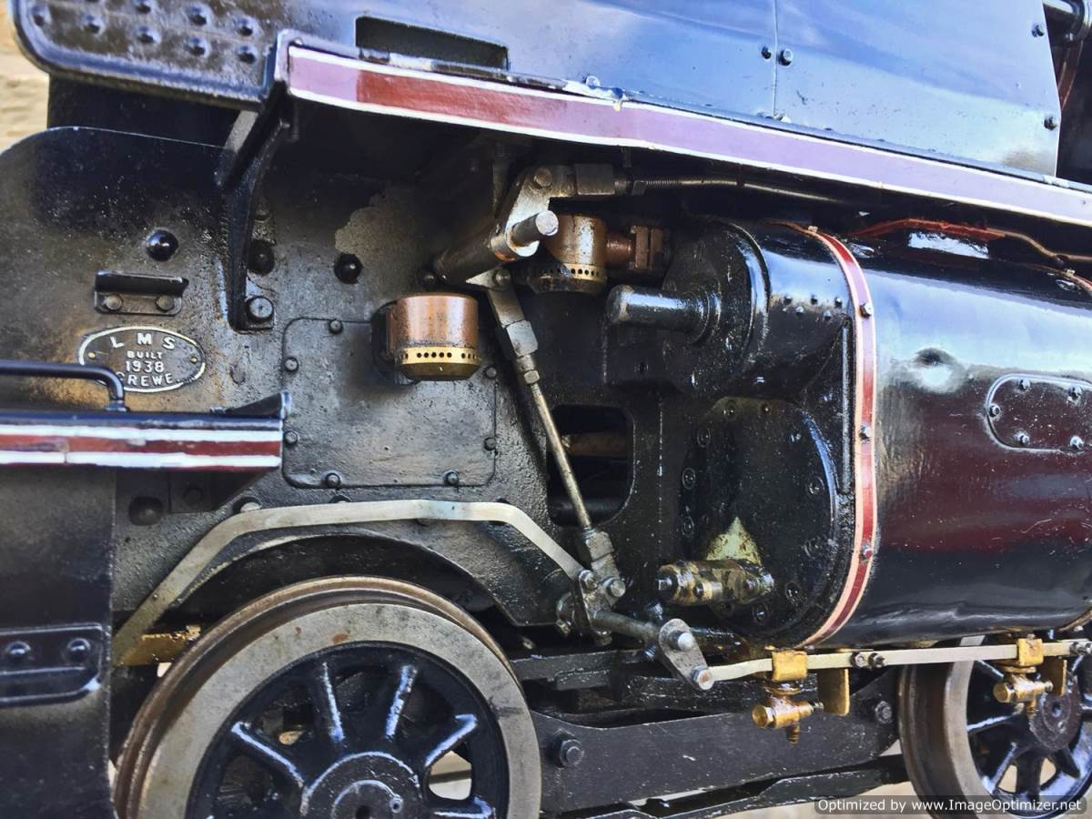 The engine of course has all 4 cylinders, and is the work of two skilled model engineers working together, and as you'd expect, she performs extremely well on track. The detail level on the outside is really nicely done, all the little pipe runs are where they should be and it makes for an impressive looking machine. The backhead has been purposefully simplified to be driven rather than to be displayed, so although it's not prototypically accurate it is certainly easy to use! The two scale mechanical lubricators on the running boards are functional, and were the loco's original lubricators, however they are currently disconnected, the builder having decided to put in a much larger reservoir under the fireman's seat on the footplate. There are little oil pots all over the model to feed into the difficult to get to internal bits.