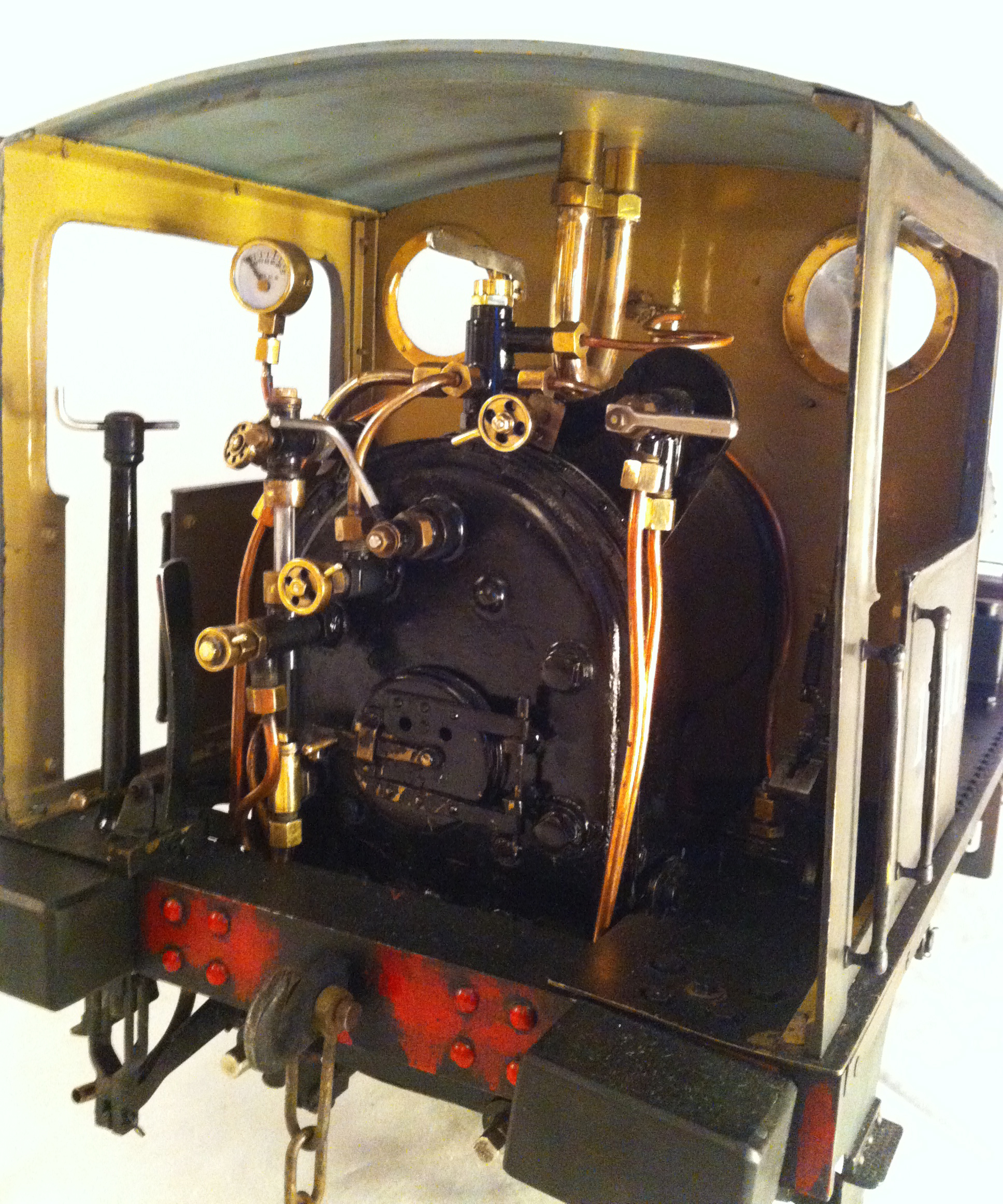 The Pug is fitted with an injector (from a driving truck), an axle water pump and bypass fed from, and returning to the tank and a subtle hand pump located underneath the running boards, but with the handle on the footplate. The draincocks are operated from the cab, and there is a very good, and graduatable steam brake fitted. The whistle is under the running boards, but the dummy whistle is plumbed in to the same feed so that it blows steam from the right places when you pull the lever.