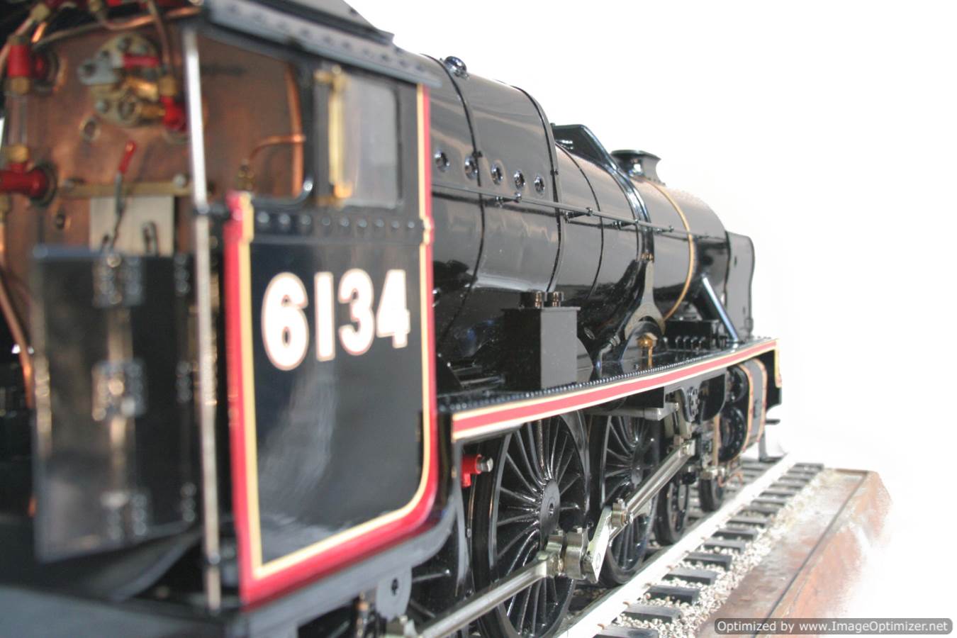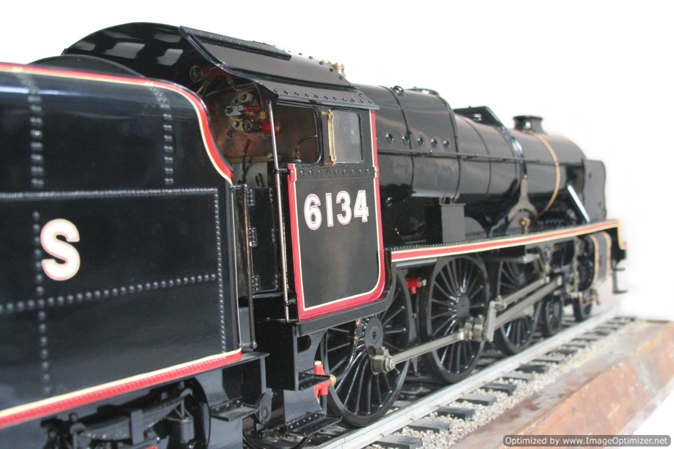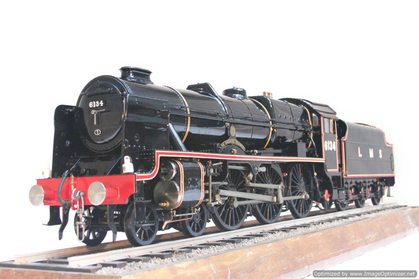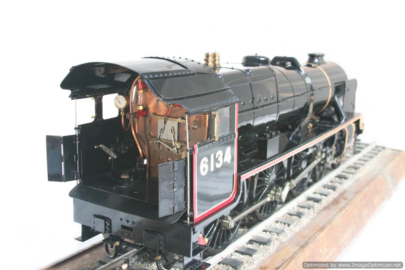 Here we have another lovely and pretty rare model. A Brand new and unsteamed 5" full 3 cylinder LMS Stanier Rebuillt Royal Scott, 6134 'The Cheshire Regiment'. She's in lined LMS Black livery and has been built to the Martin Evans 'King's Own' design, this is an exceptionally neatly made model from the workshop of an experienced model engineer. We've seen a few of these made, but they mostly seem to be the simpler 2 cylinder versions rather than the fully authentic 3 cylinder machines. The model was made as a runner, and as such has a straight martin Evans backhead rather than a more scale detailed affair, but ultimately the builder decided to keep the model in as new, un-fired condition on a plinth in his dining room whilst running all his other models instead.